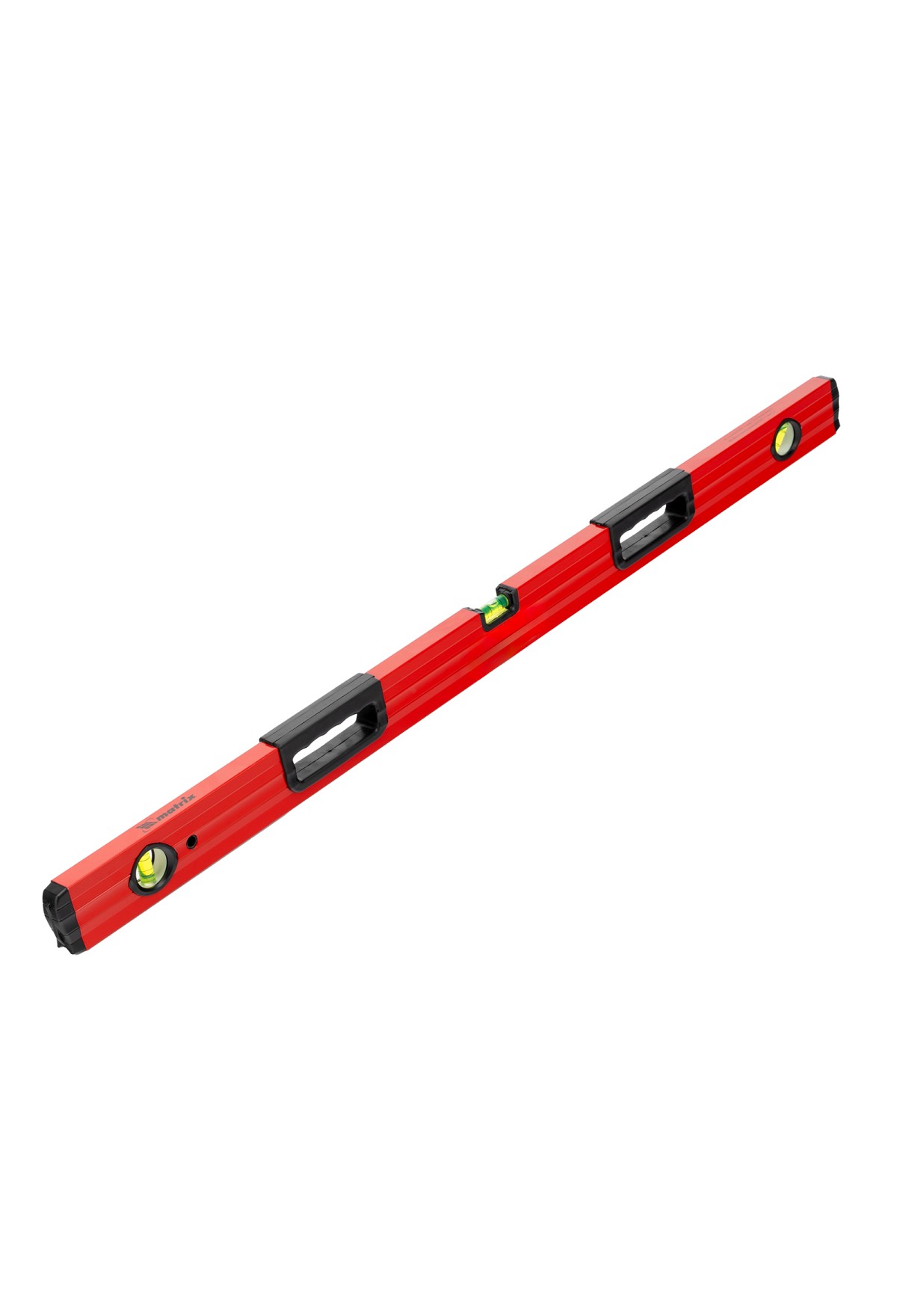 Фрезерованный алюминиевый уровень Matrix 33228 длиной 1000 мм, с 3 глазками и 2 эргономичными ручками, поможет проверить горизонтальные и вертикальные поверхности, выставить угол 45 градусов. Он будет полезен на любом этапе строительства и ремонта: при облицовке и отделке поверхностей, монтаже конструкций и т.д. Погрешность измерений на метр не превышает 1 мм (0,057 градуса).,Для определения отклонения вертикали 90 градусов необходимо использовать пузырьковую ампулу только в верхнем положении уровня. Только базовая поверхность является рабочей (противоположная ампуле 180 градусов).