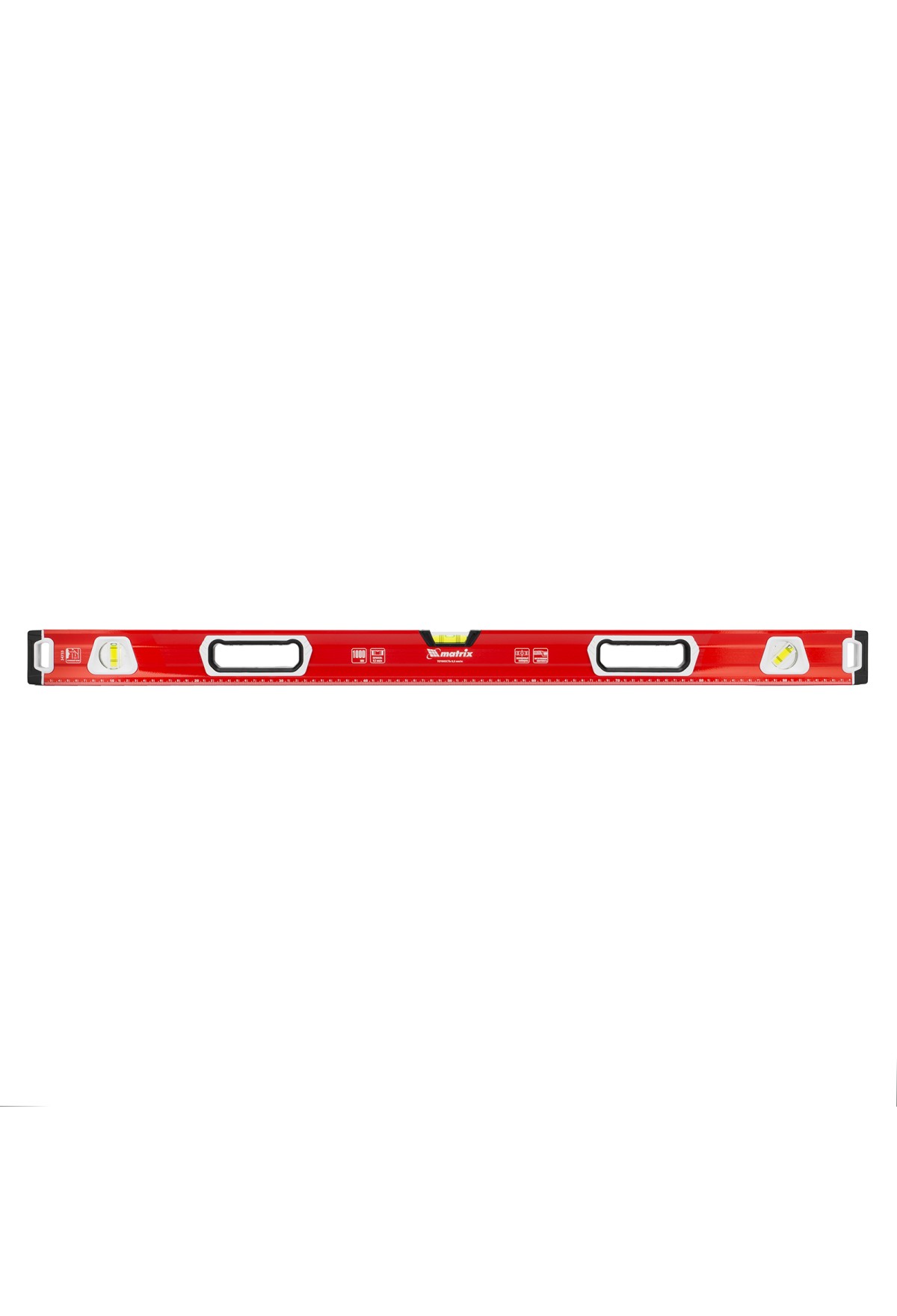 Уровень алюминиевый фрезерованный Matrix 34733 длиной 1000 мм, с магнитной полосой и 2-компонентными рукоятками, 3 глазками и 1 зеркальным отражателем, — измерительный инструмент для контроля отклонений поверхностей от горизонтали, вертикали и угла 45°. Используется для выполнения работ, требующих высокой точности.