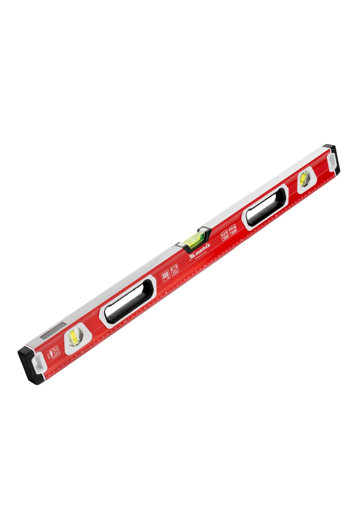 Уровень алюминиевый фрезерованный Matrix 34732 длиной 800 мм, с магнитной полосой и 2-компонентными рукоятками, 3 глазками и 1 зеркальным отражателем, — измерительный инструмент для контроля отклонений поверхностей от горизонтали, вертикали и угла 45°. Используется для выполнения работ, требующих высокой точности.
