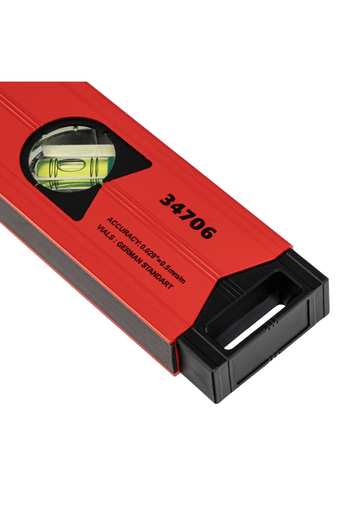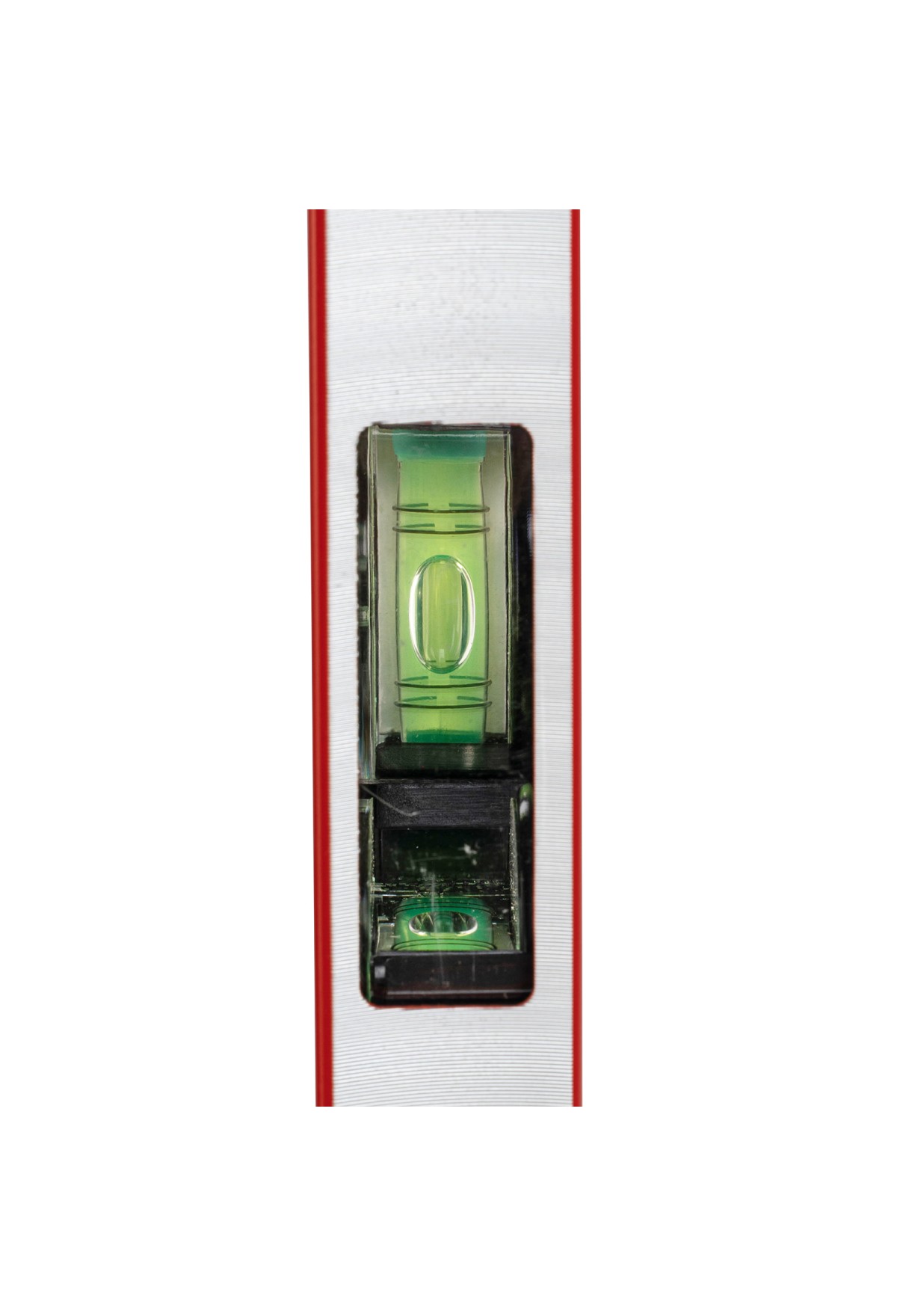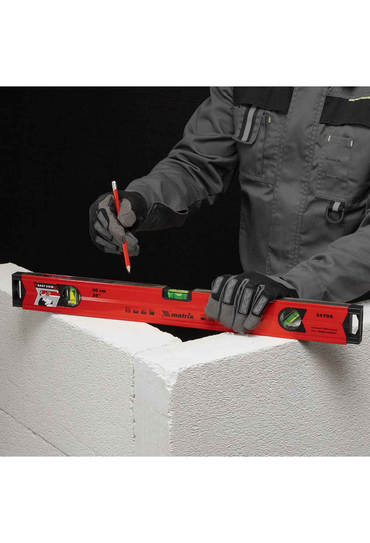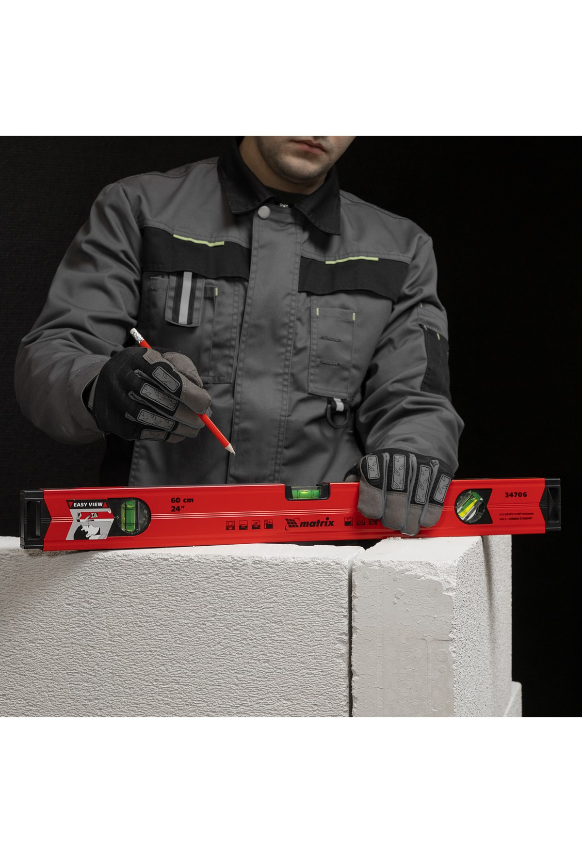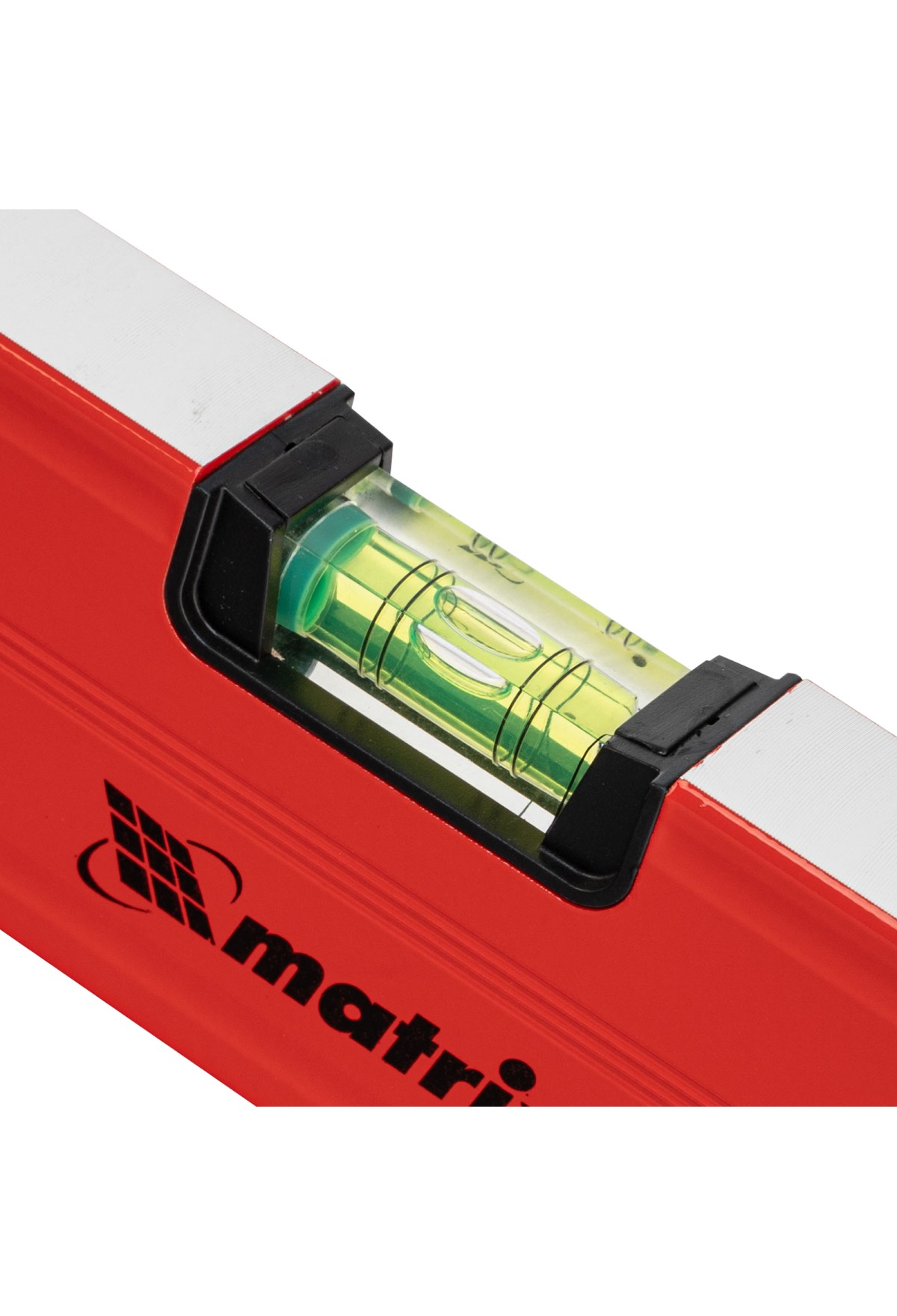 Алюминиевый магнитный уровень Matrix 34706 длиной 600 мм, усиленный, оснащен 3 глазками и одним зеркальным отражателем. С его помощью можно выявить отклонения от вертикали, горизонтали и угла 45 градусов. Встроенный зеркальный глазок повышает удобство работы, позволяя легко считывать показания.,Для определения отклонения вертикали 90 градусов необходимо использовать пузырьковую ампулу только в верхнем положении уровня. Только базовая поверхность является рабочей (противоположная ампуле 180 градусов).