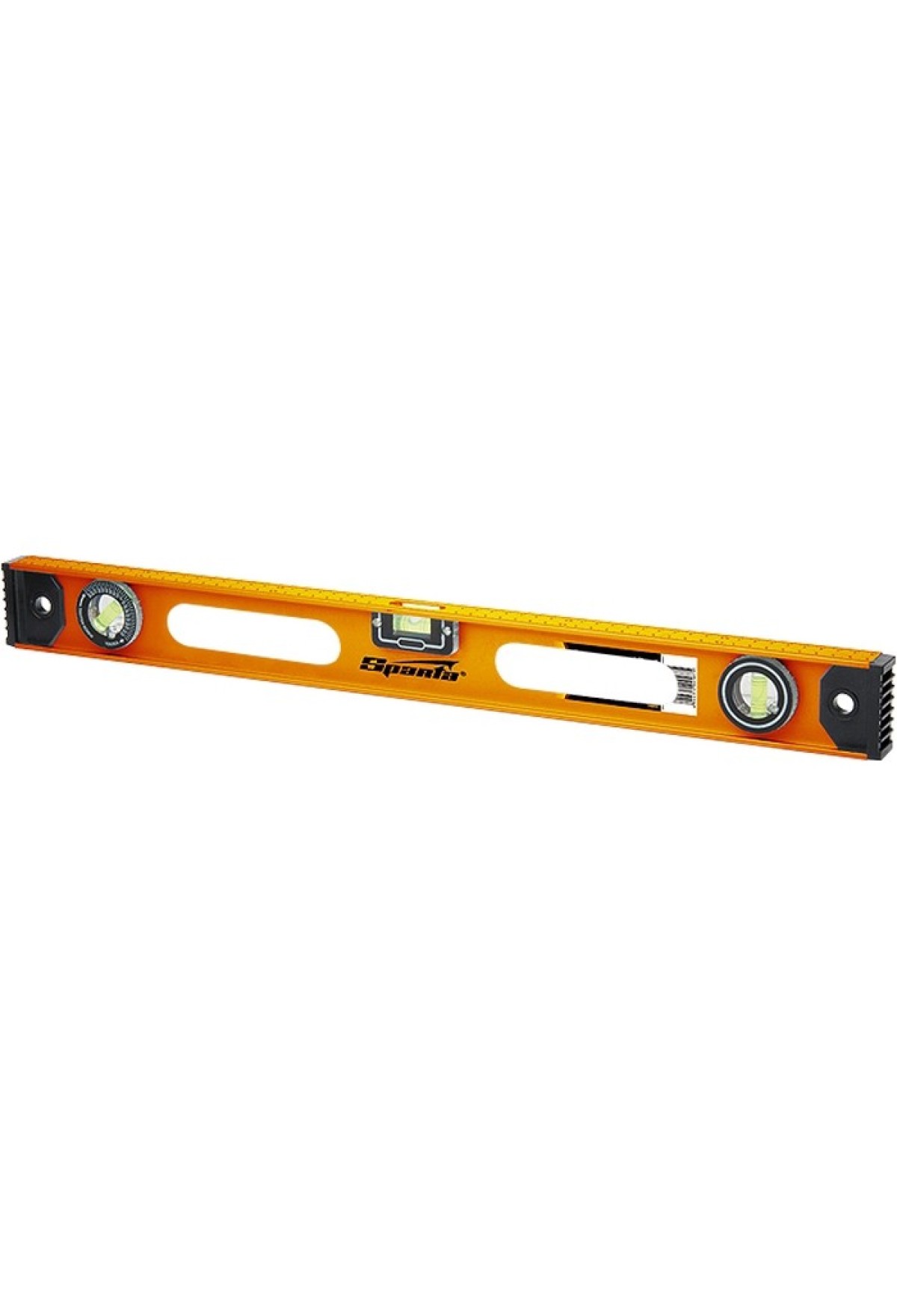 Уровень алюминиевый Sparta «Рельс» 34050 длиной 1000 мм имеет 3 глазка, 1 из которых поворотный. С помощью инструмента удобно определять наличие отклонений от горизонтали и вертикали, а также выставлять произвольный угол.