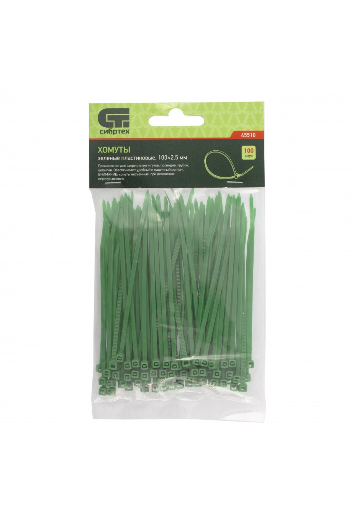 Технические характеристики Хомуты, 100 x 2.5 мм, пластиковые, зеленые, 100 шт Сибртех
