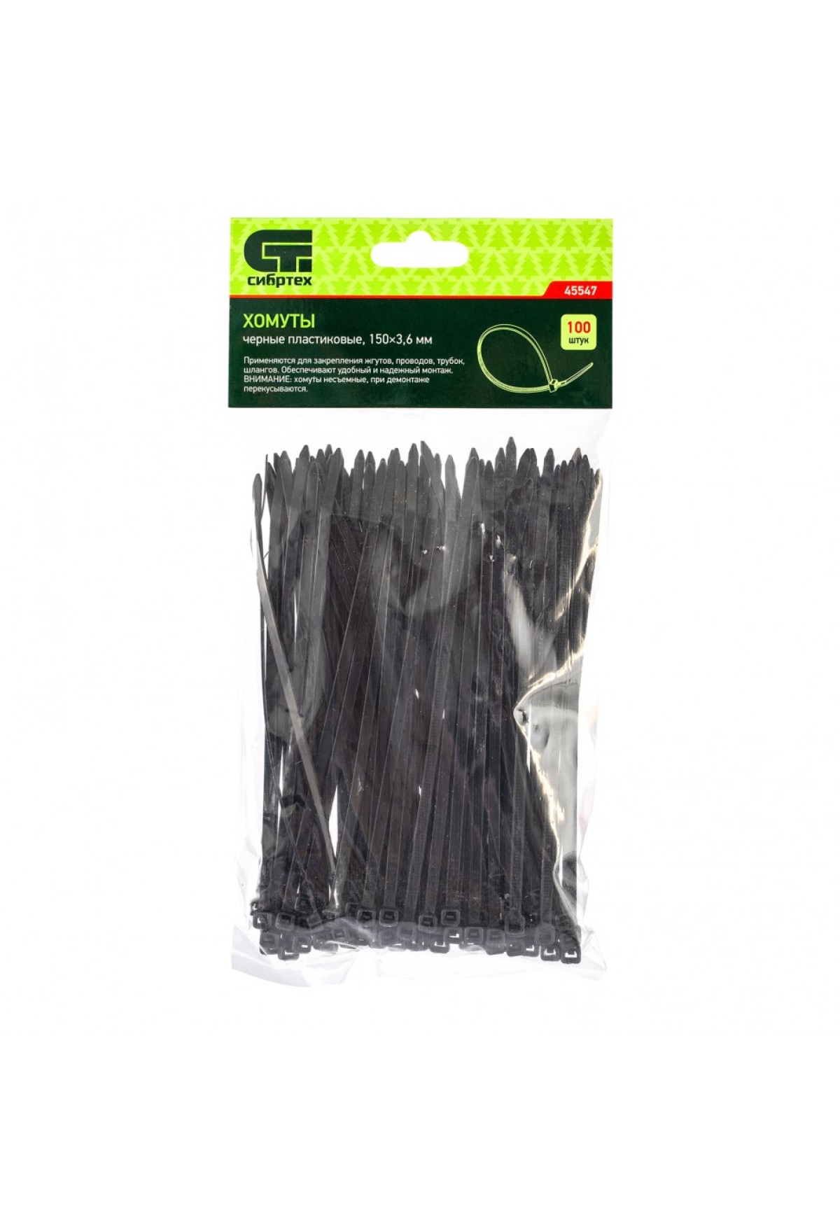 Черные пластиковые хомуты Сибртех 45547, 150 х 3,6 мм, 100 шт. в упаковке, используются для стяжки кабелей, закрепления трубок, шлангов, рекламных конструкций, а также для упаковки различных предметов. Пригодятся во время прокладки электрических и локальных вычислительных сетей, ремонта компьютерной техники, оформлении торговых стендов, комплектовании товара, будут также полезны дома, на даче и в гараже.