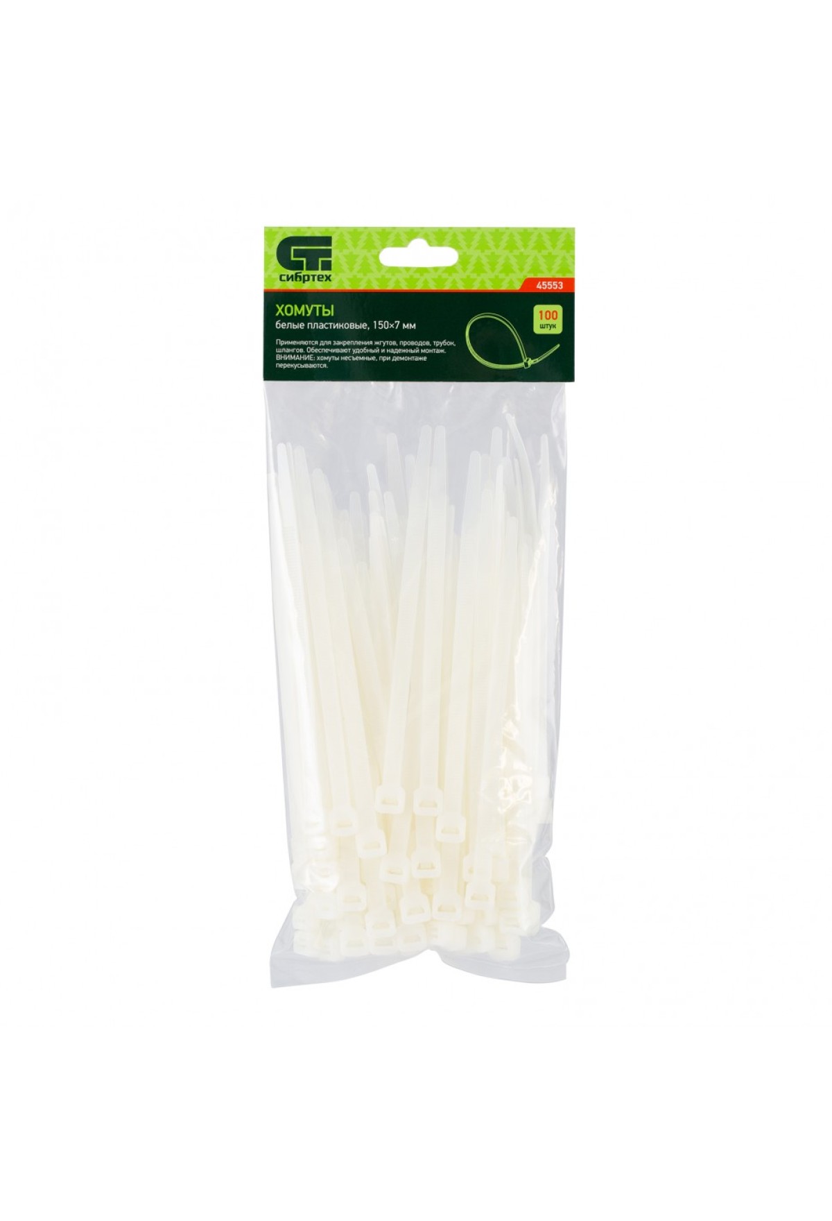 Белые пластиковые хомуты Сибртех 45553, 150 х 7 мм, 100 шт. в упаковке, используются для стяжки кабелей, закрепления трубок, шлангов, рекламных конструкций, а также для упаковки различных предметов. Пригодятся во время прокладки электрических и локальных вычислительных сетей, ремонта компьютерной техники, оформлении торговых стендов, комплектовании товара, будут также полезны дома, на даче и в гараже.