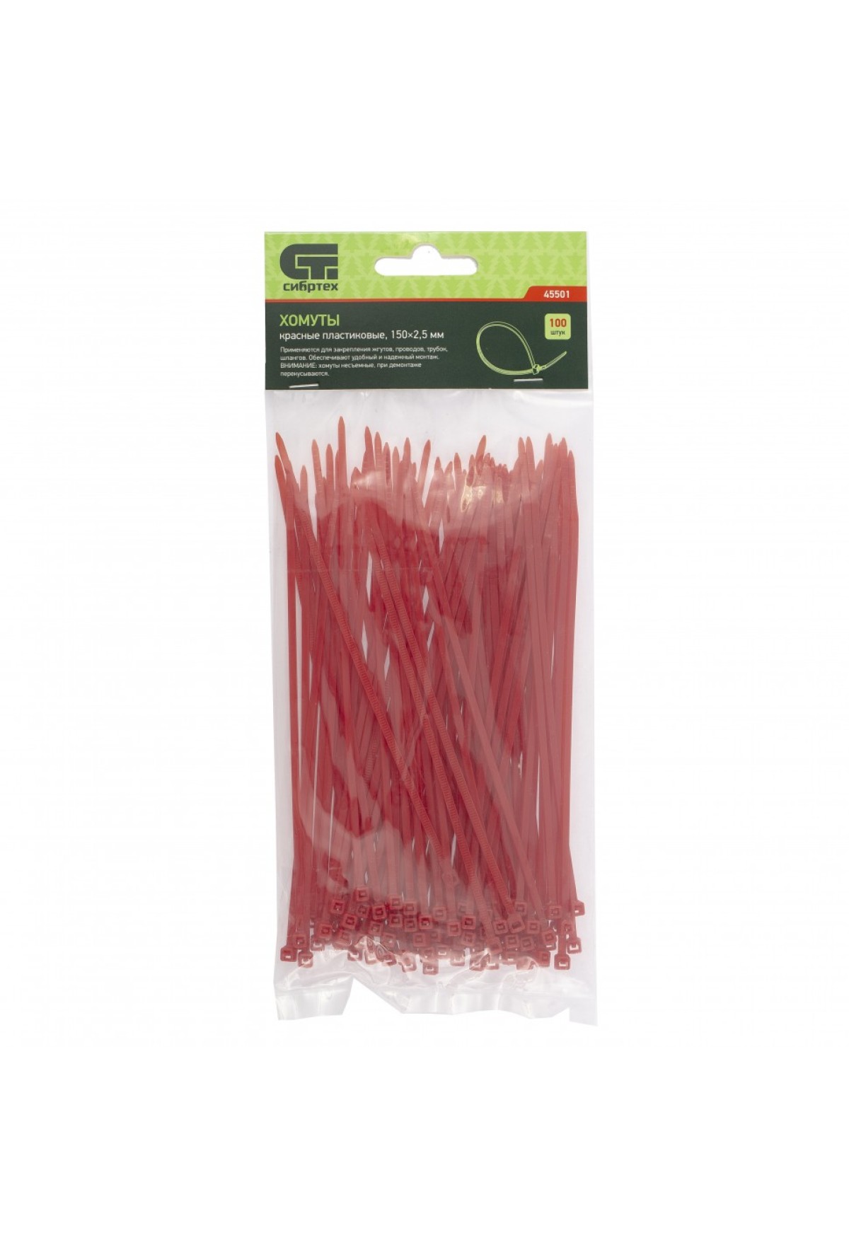 Красные пластиковые хомуты Сибртех 45501, 150 х 2,5 мм, 100 шт. в упаковке, используются для стяжки кабелей, закрепления трубок, шлангов, рекламных конструкций, а также для упаковки различных предметов. Пригодятся во время прокладки электрических и локальных вычислительных сетей, ремонта компьютерной техники, оформлении торговых стендов, комплектовании товара, будут также полезны дома, на даче и в гараже.
