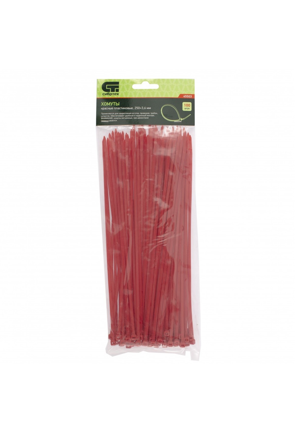 Красные пластиковые хомуты Сибртех 45503, 250 х 3,6 мм, 100 шт. в упаковке, используются для стяжки кабелей, закрепления трубок, шлангов, рекламных конструкций, а также для упаковки различных предметов. Пригодятся во время прокладки электрических и локальных вычислительных сетей, ремонта компьютерной техники, оформлении торговых стендов, комплектовании товара, будут также полезны дома, на даче и в гараже.
