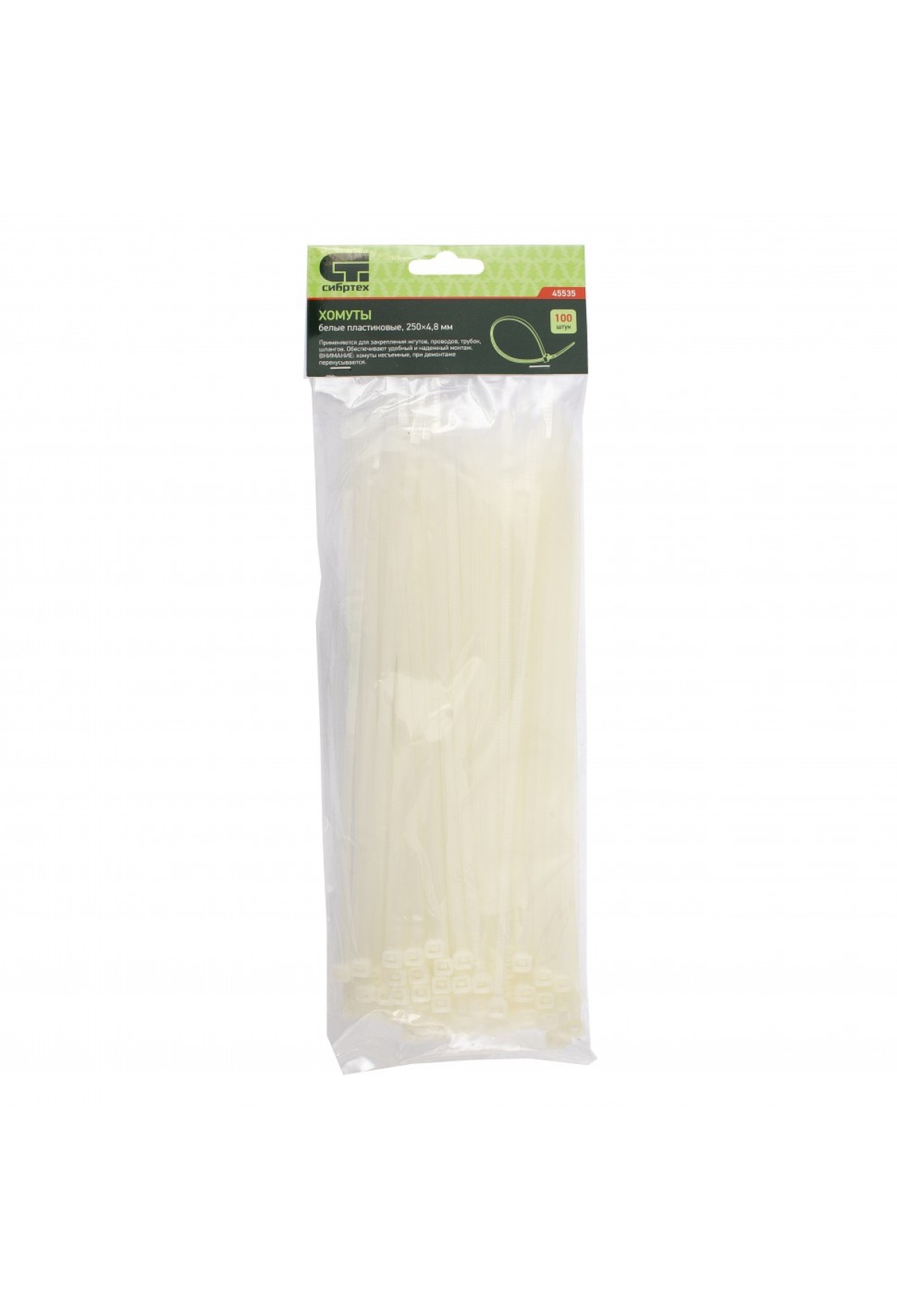 Белые пластиковые хомуты Сибртех 45535, 250 х 4,8 мм, 100 шт. в упаковке, используются для стяжки кабелей, закрепления трубок, шлангов, рекламных конструкций, а также для упаковки различных предметов. Пригодятся во время прокладки электрических и локальных вычислительных сетей, ремонта компьютерной техники, оформлении торговых стендов, комплектовании товара, будут также полезны дома, на даче и в гараже.