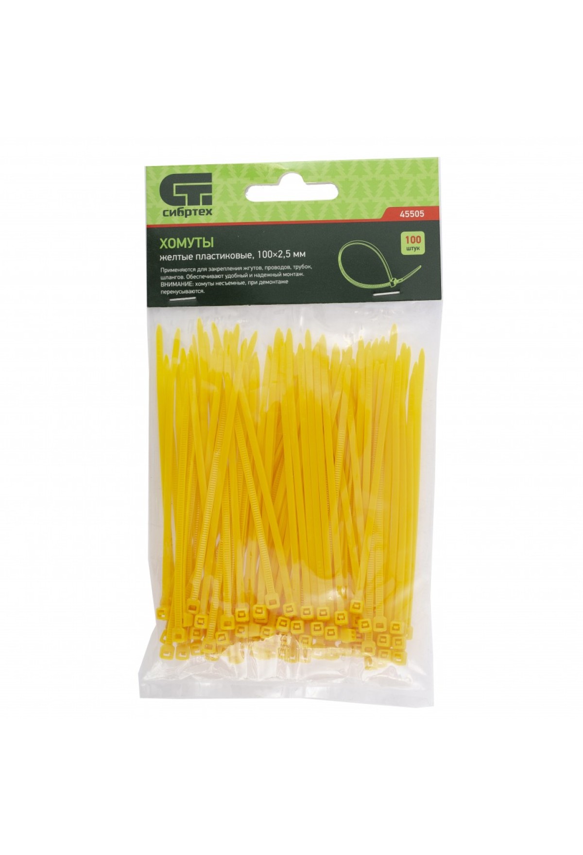 Желтые пластиковые хомуты Сибртех 45505, 100 х 2,5 мм, 100 шт. в упаковке, используются для стяжки кабелей, закрепления трубок, шлангов, рекламных конструкций, а также для упаковки различных предметов. Пригодятся во время прокладки электрических и локальных вычислительных сетей, ремонта компьютерной техники, оформлении торговых стендов, комплектовании товара, будут также полезны дома, на даче и в гараже.
