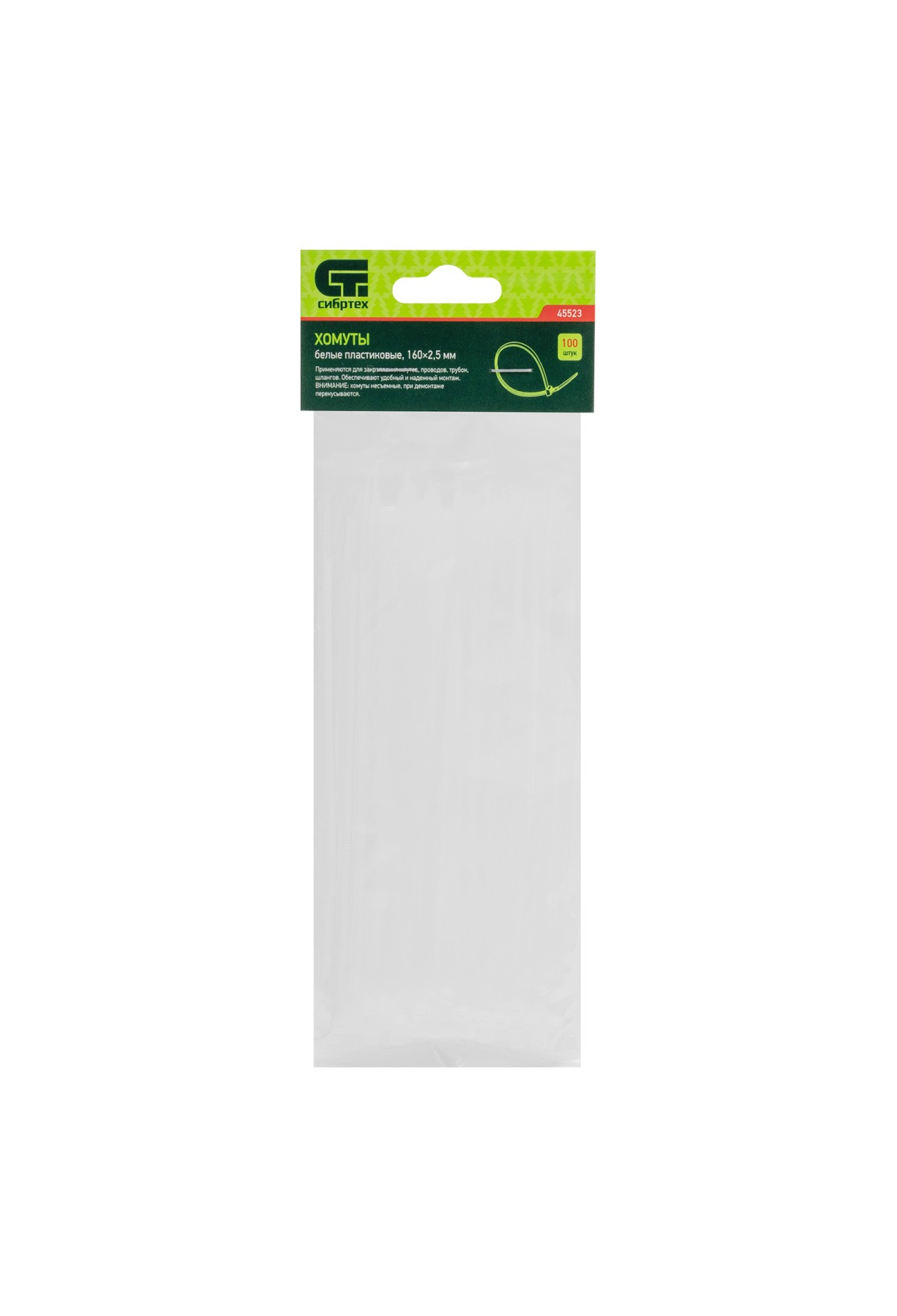 Белые пластиковые хомуты Сибртех 45523, 160 х 2,5 мм, 100 шт. в упаковке, используются для стяжки кабелей, закрепления трубок, шлангов, рекламных конструкций, а также для упаковки различных предметов. Пригодятся во время прокладки электрических и локальных вычислительных сетей, ремонта компьютерной техники, оформлении торговых стендов, комплектовании товара, будут также полезны дома, на даче и в гараже.