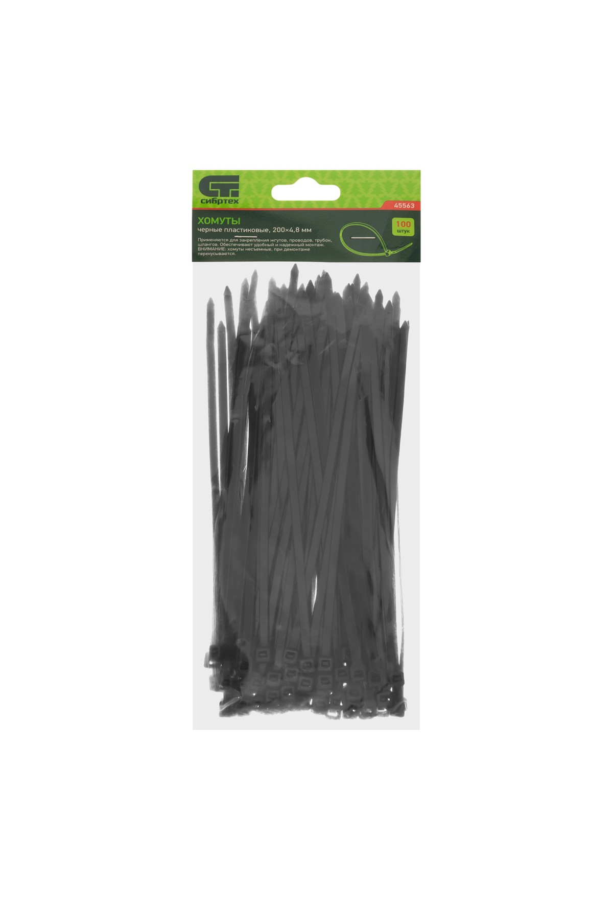Черные пластиковые хомуты Сибртех 45563, 200 х 4,8 мм, 100 шт. в упаковке, используются для стяжки кабелей, закрепления трубок, шлангов, рекламных конструкций, а также для упаковки различных предметов. Пригодятся во время прокладки электрических и локальных вычислительных сетей, ремонта компьютерной техники, оформлении торговых стендов, комплектовании товара, будут также полезны дома, на даче и в гараже.