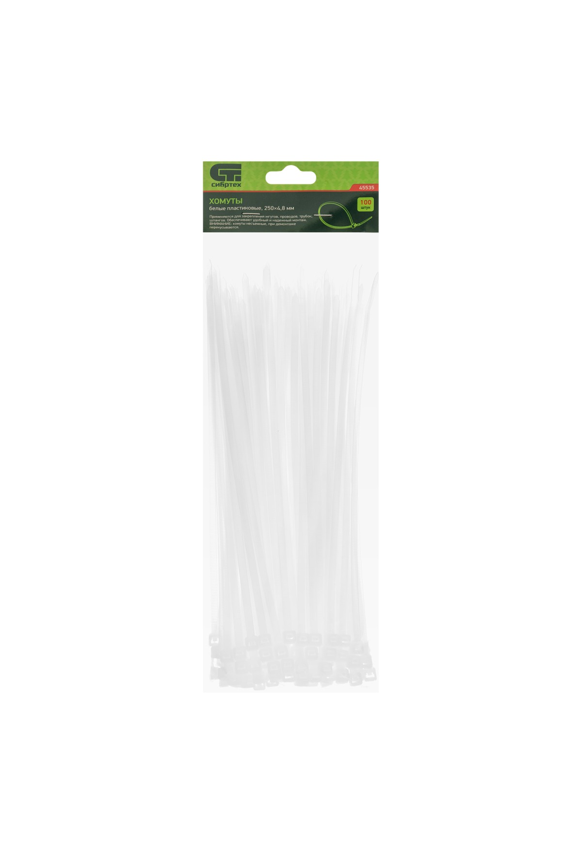 Белые пластиковые хомуты Сибртех 45535, 250 х 4,8 мм, 100 шт. в упаковке, используются для стяжки кабелей, закрепления трубок, шлангов, рекламных конструкций, а также для упаковки различных предметов. Пригодятся во время прокладки электрических и локальных вычислительных сетей, ремонта компьютерной техники, оформлении торговых стендов, комплектовании товара, будут также полезны дома, на даче и в гараже.