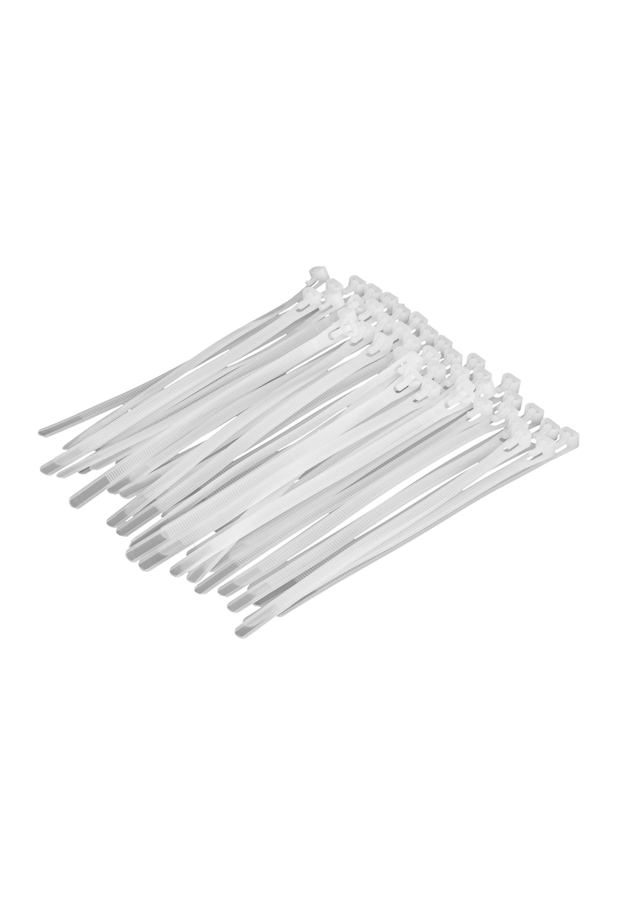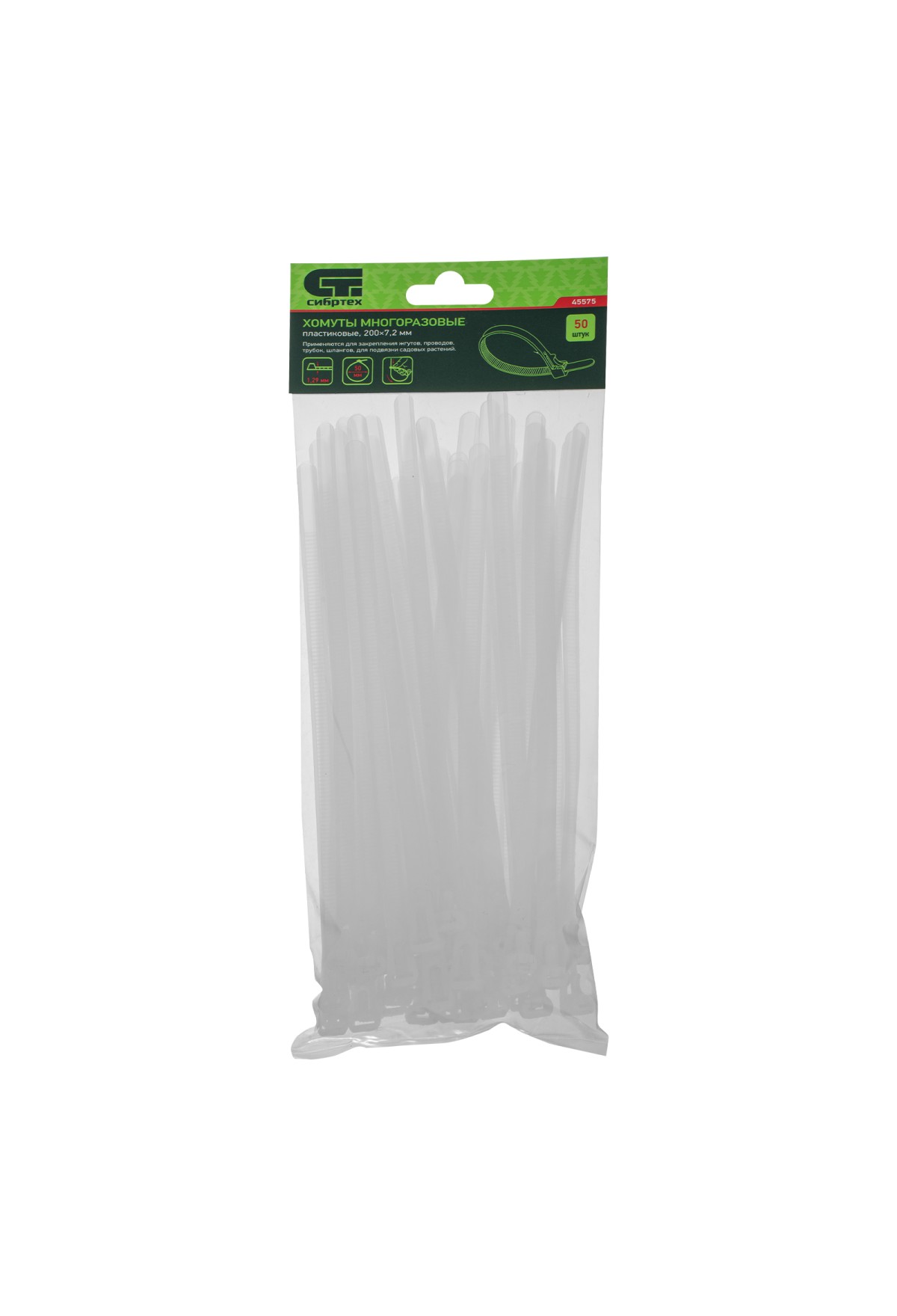Пластиковые многоразовые хомуты Сибртех 45575 размером 200 х 7,2 мм, 50 шт. в упаковке, — приспособления для стяжки кабелей, шлангов или трубок. Могут применяться для подвязки растений или упаковки предметов. Белые пластиковые стяжки пригодятся во время выполнения электромонтажных работ, ремонта техники, будут полезны в промышленности, торговле, а также в быту.