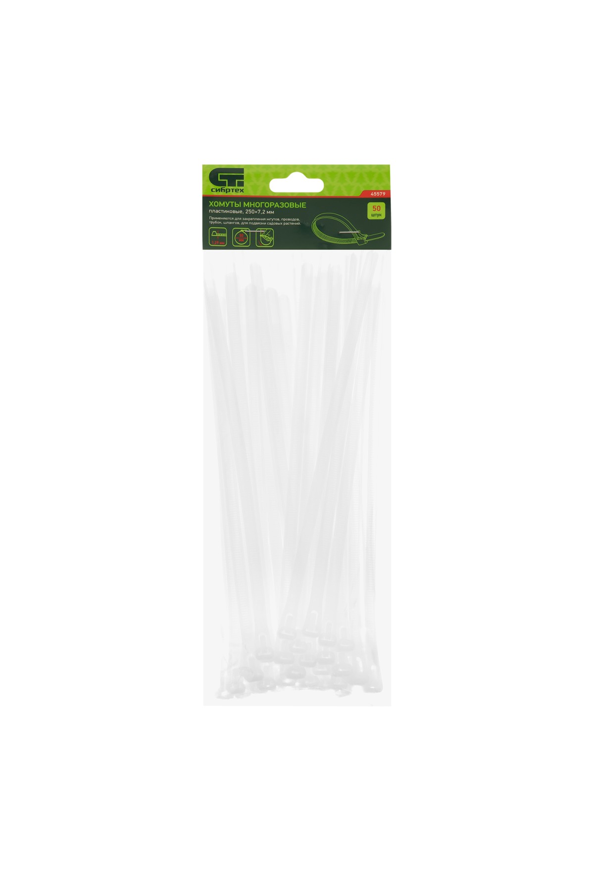Пластиковые многоразовые хомуты Сибртех 45579 размером 250 х 7,2 мм, 50 шт. в упаковке, — приспособления для стяжки кабелей, шлангов или трубок. Могут применяться для подвязки растений или упаковки предметов. Белые пластиковые стяжки пригодятся во время выполнения электромонтажных работ, ремонта техники, будут полезны в промышленности, торговле, а также в быту.
