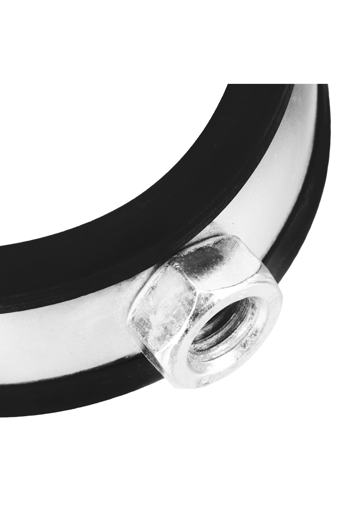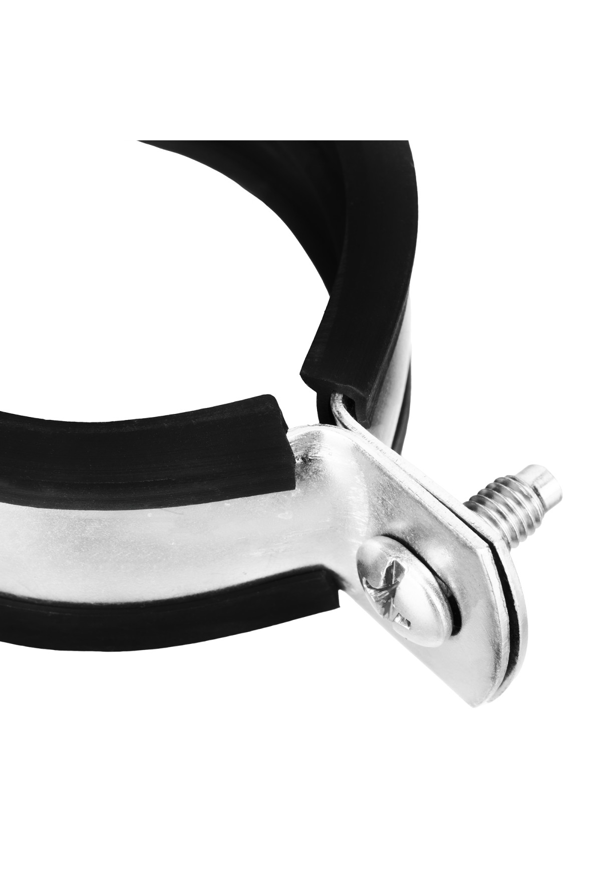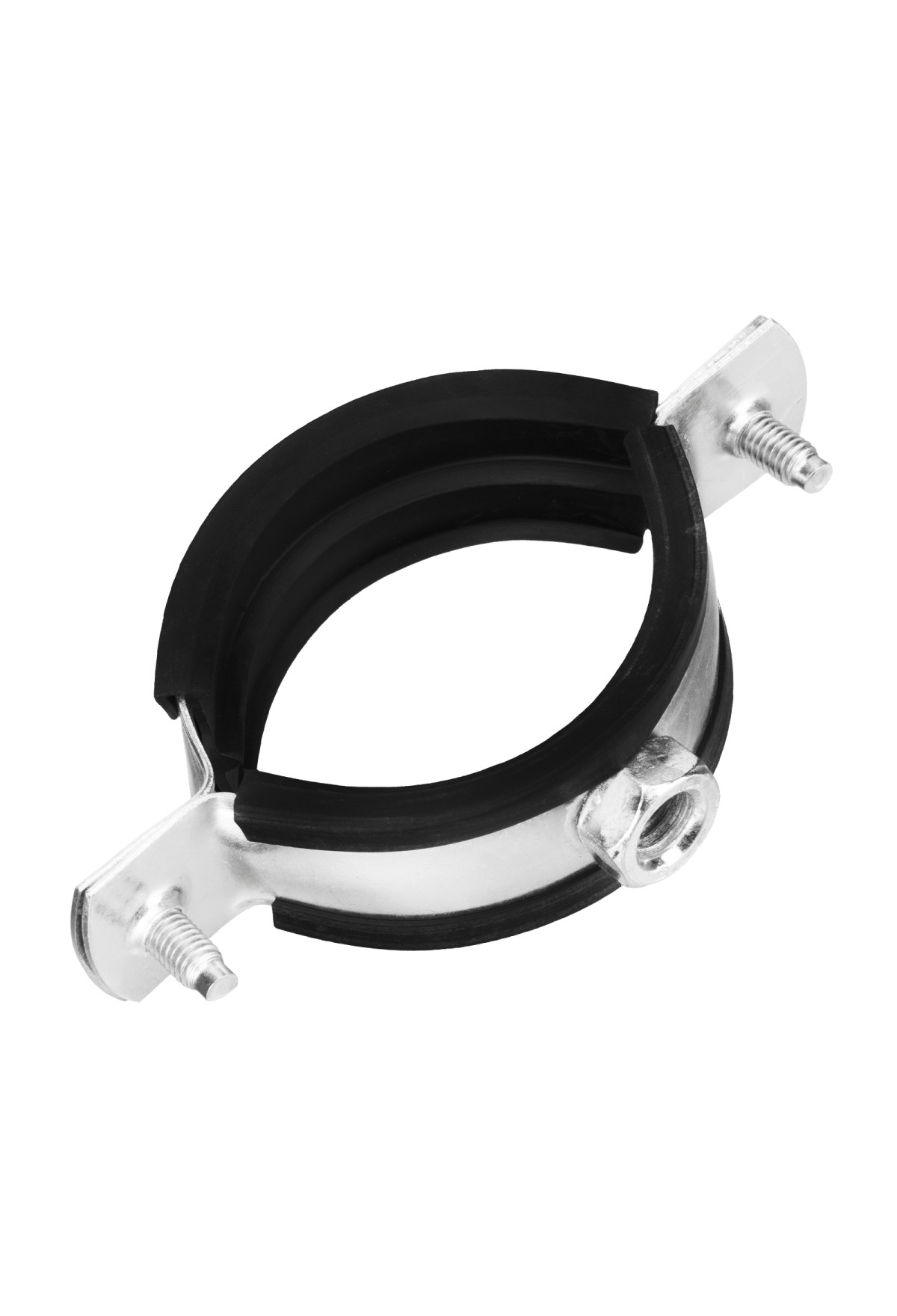 - Хомут для труб состоит из двух частей соединенные винтами, имеет резиновую прокладку для звукоизоляции и виброизоляции трубы, которая изготавливается из прочной резины.