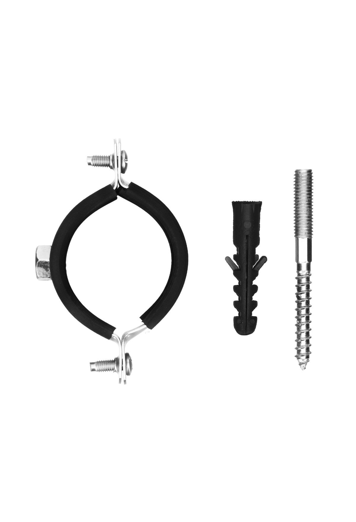 Технические характеристики Хомут сантехнический для труб 47-51 (1 1/2"), с резиновым уплотнением, шпилькой и дюбелем, 1 шт, Россия Сибртех