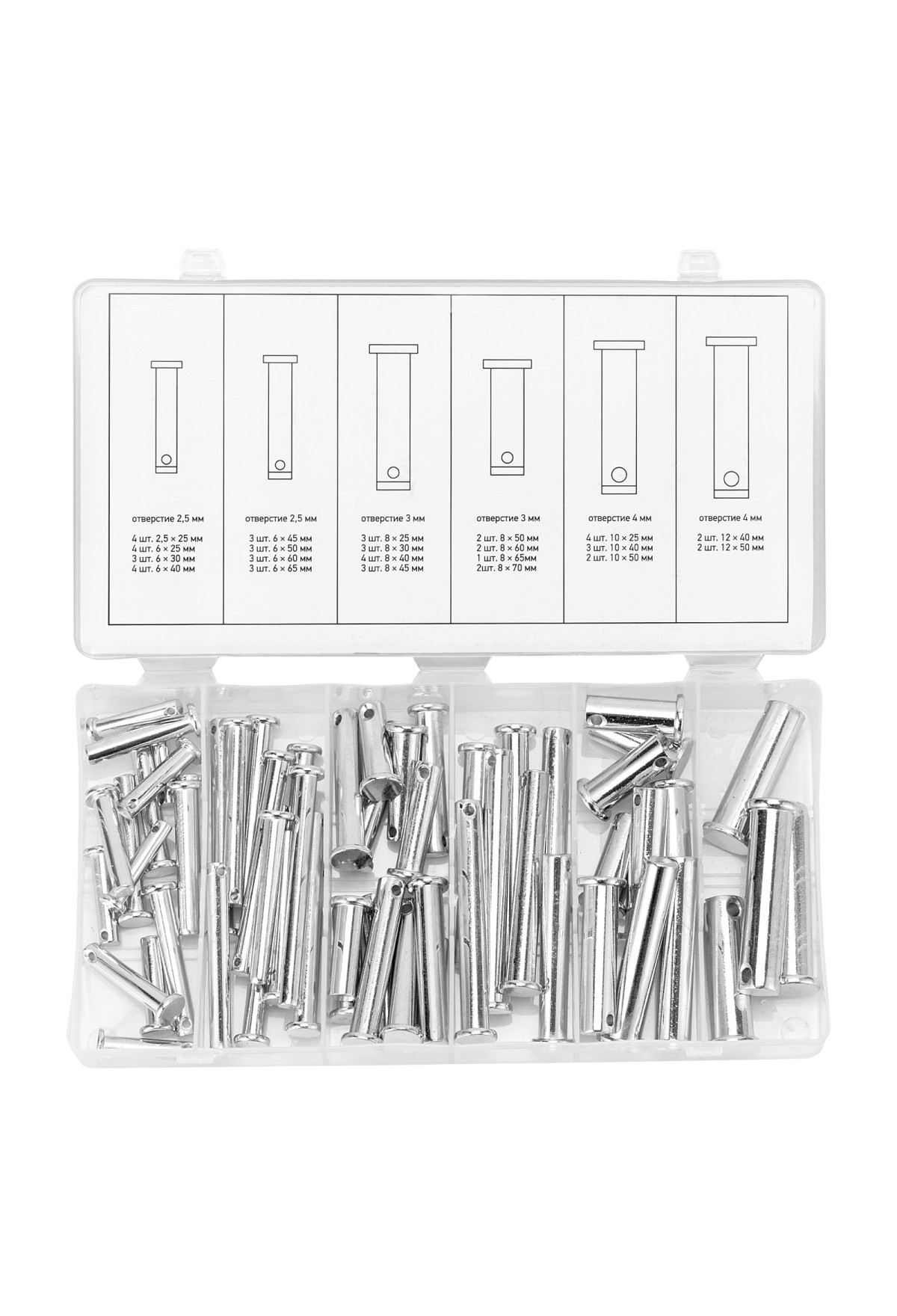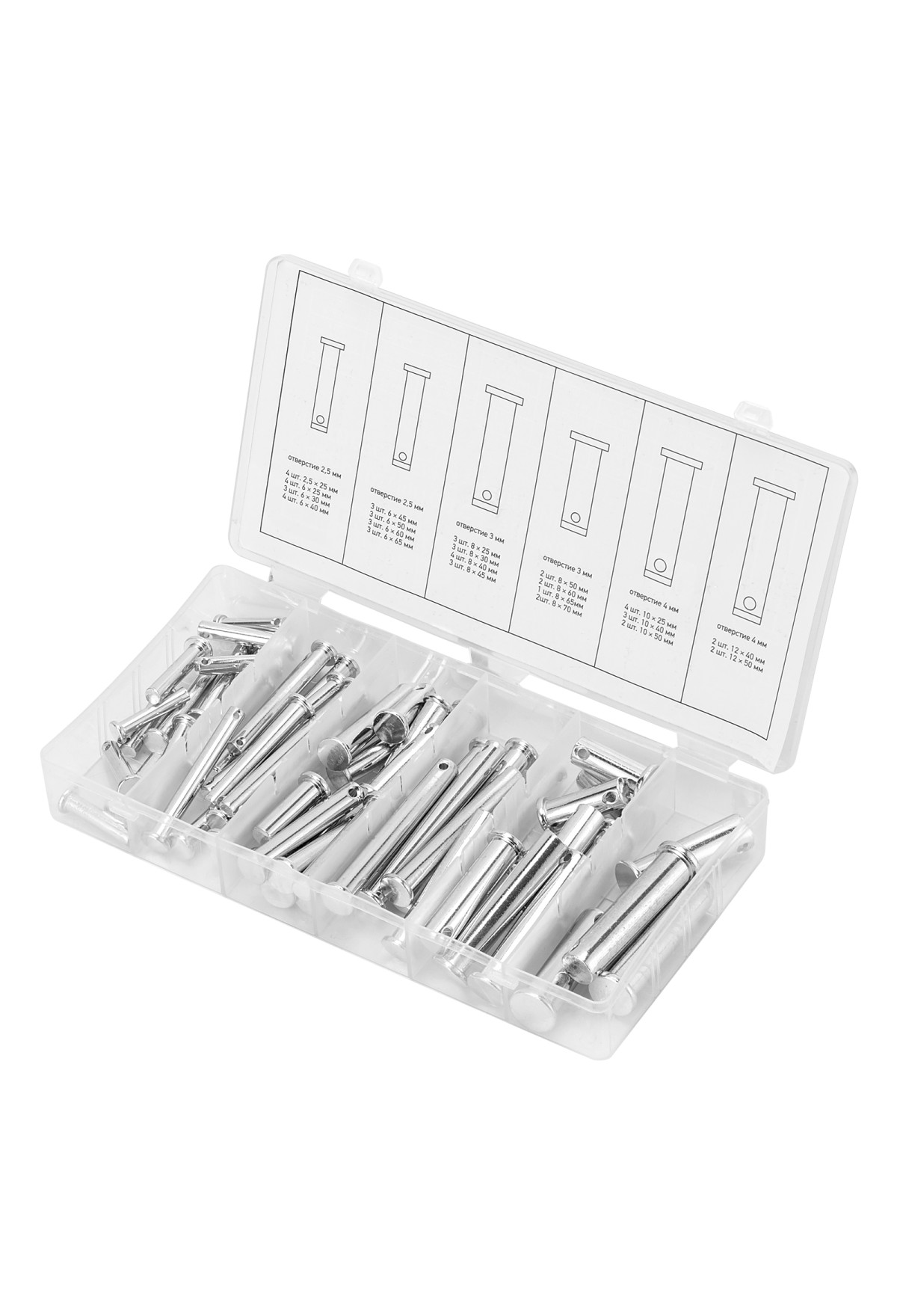 Технические характеристики Набор штифтов с головкой и отверстием под шплинт, 60 предметов Сибртех
