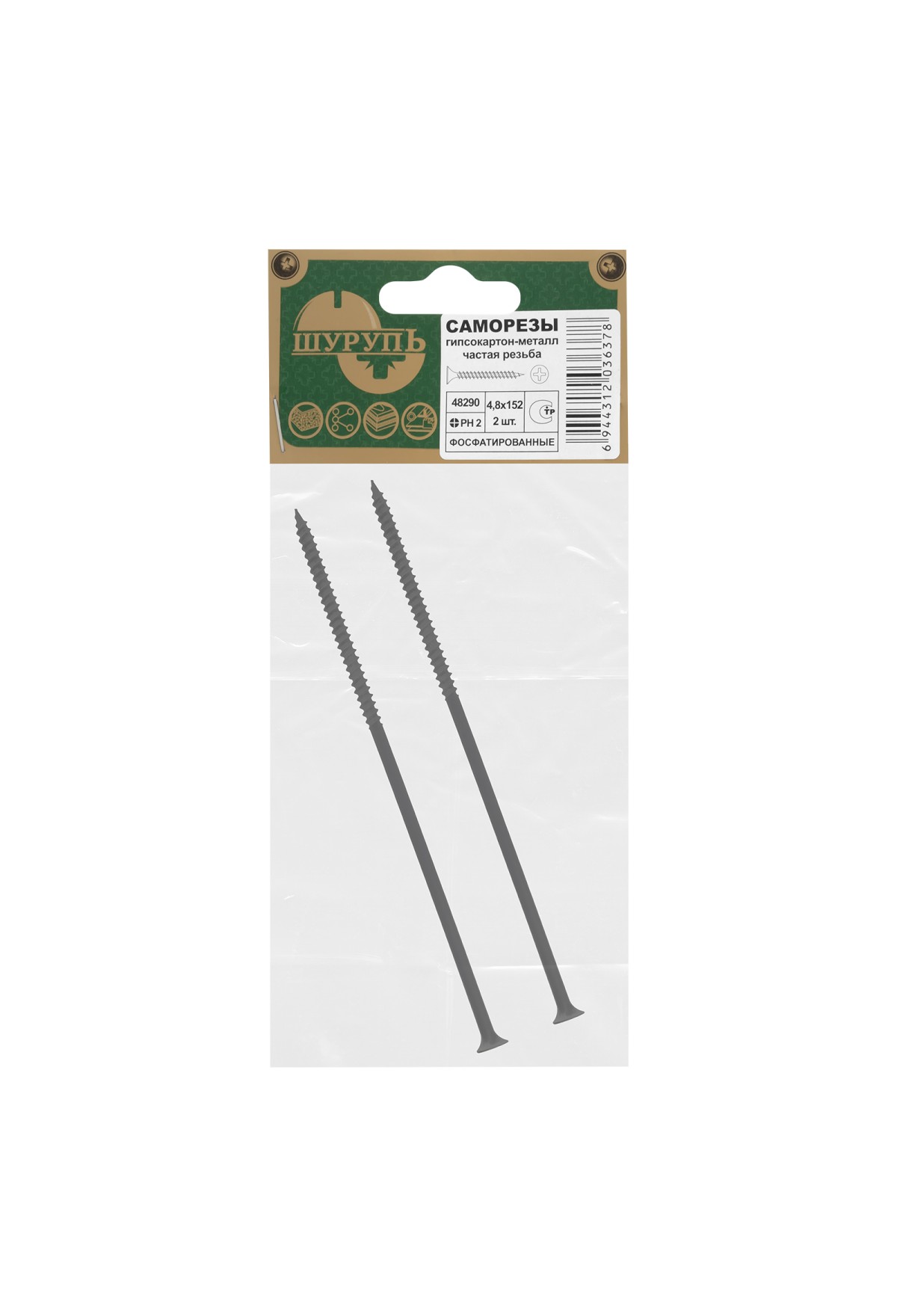 Саморезы по гипсокартону частая резьба, 4.8 х 152, PH №2, фосфатированные 2 шт Шурупь