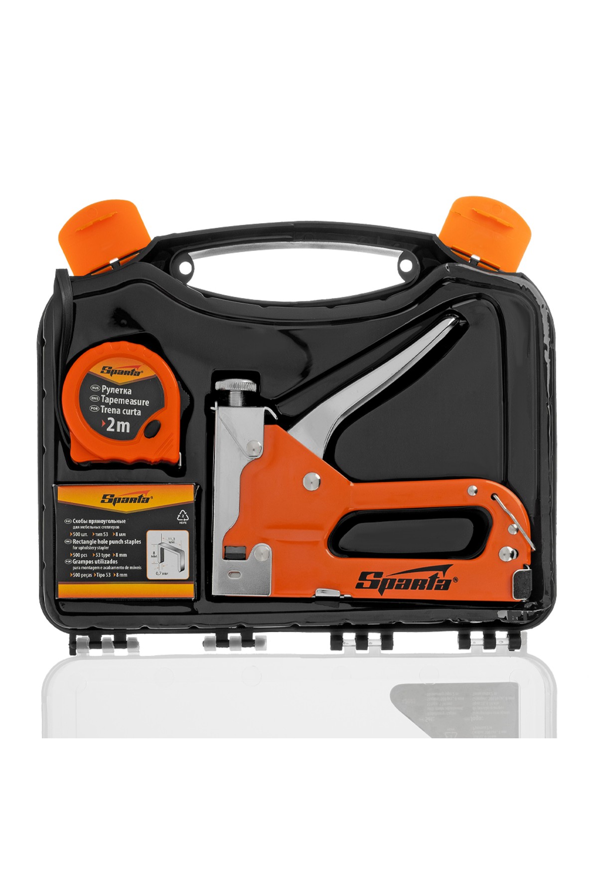 Технические характеристики Набор: степлер мебельный регулируемый, скобы 500 шт, рулетка 2 м, тип скобы 53, 4-14 мм Sparta