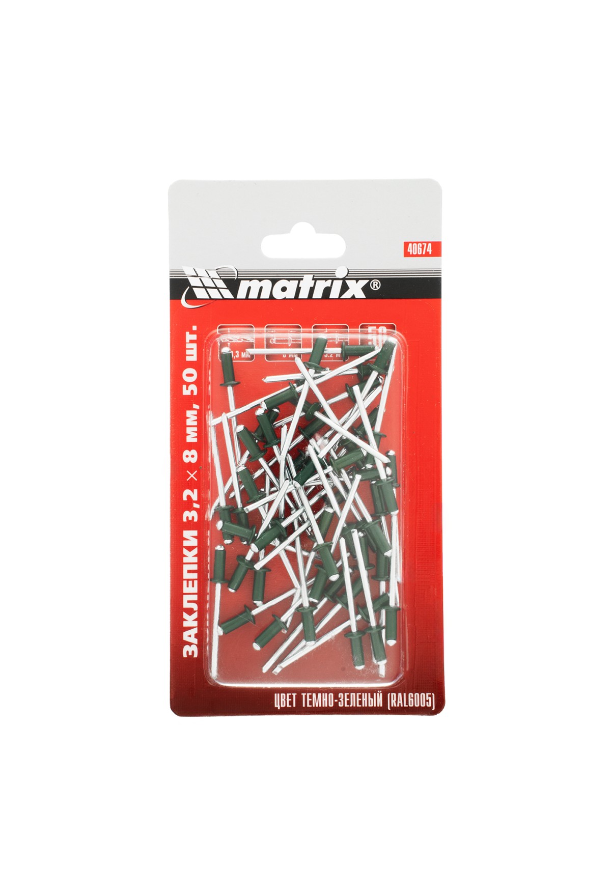 Технические характеристики Заклепки 3.2 х 8 мм RAL 6005, темно-зеленые, 50 шт Matrix