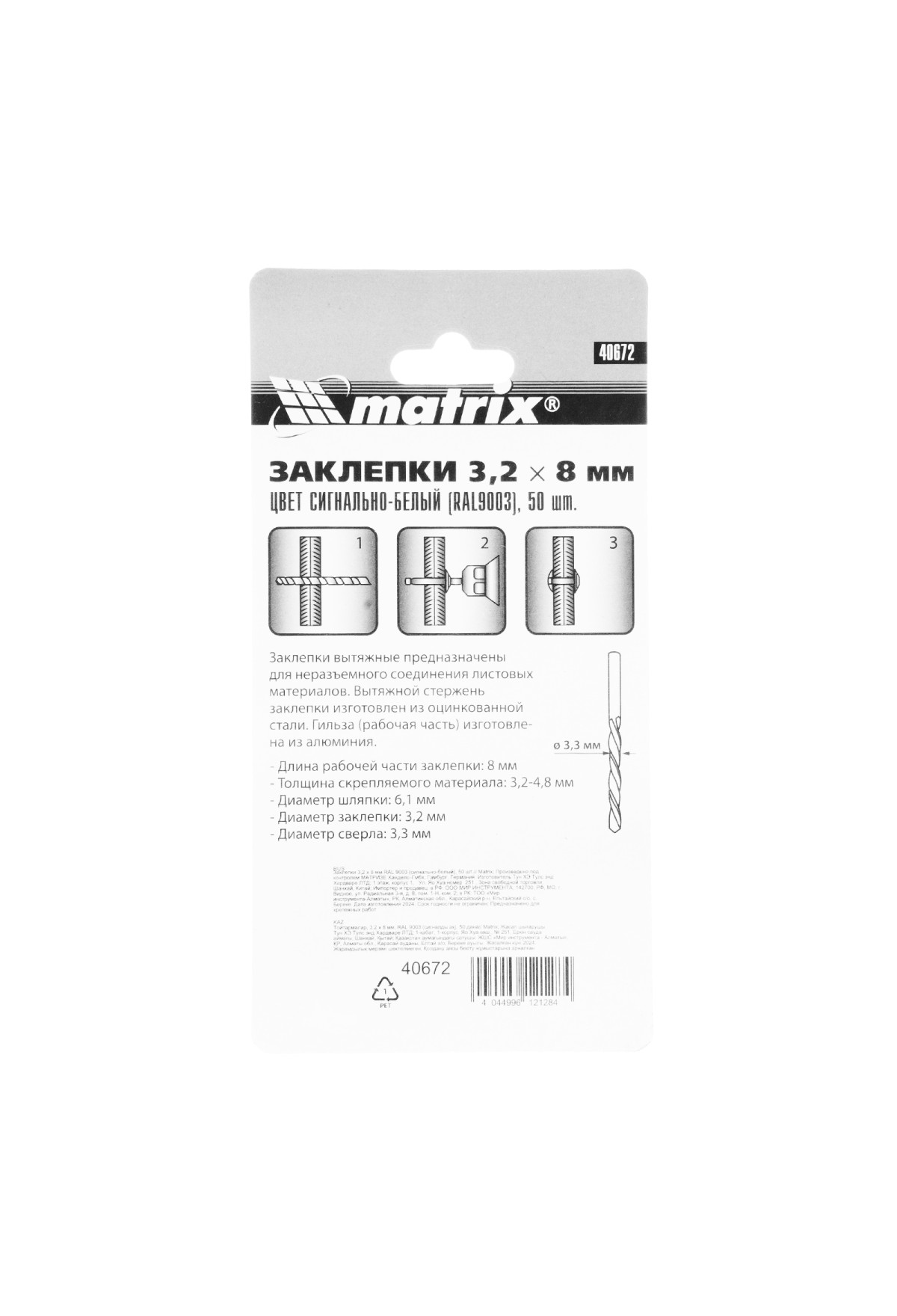 Технические характеристики Заклепки 3.2 х 8 мм RAL 9003, сигнально-белые, 50 шт Matrix