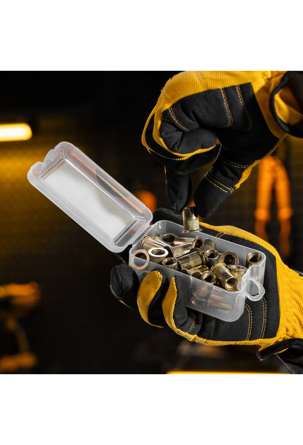 - Удобное хранение и транспортировка — заклепки поставляются в прочном пластиковом кейсе с защелкой.