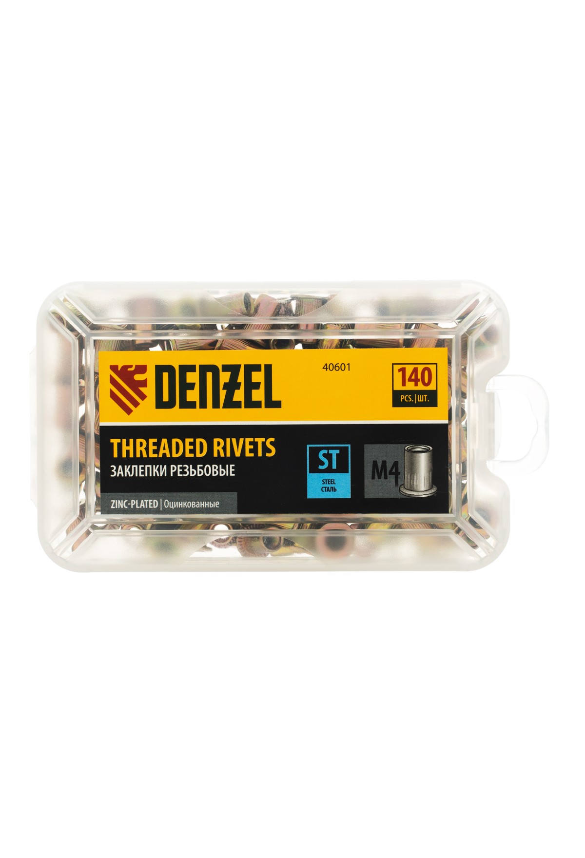Заклепки резьбовые, стальные, оцинкованные, М4, пластиковый кейс, 140 шт. Denzel