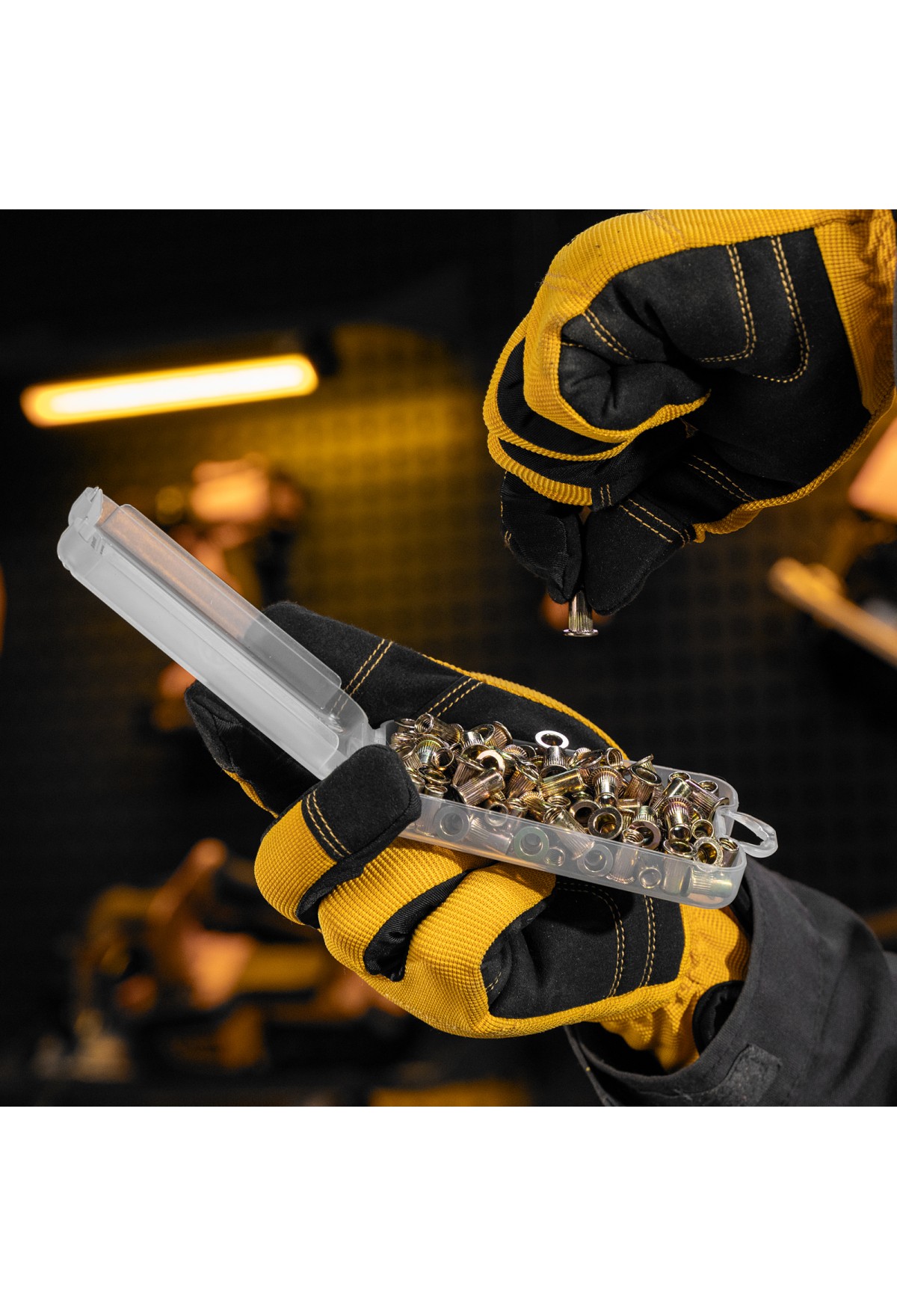 - Удобное хранение и транспортировка — заклепки поставляются в прочном пластиковом кейсе с защелкой.