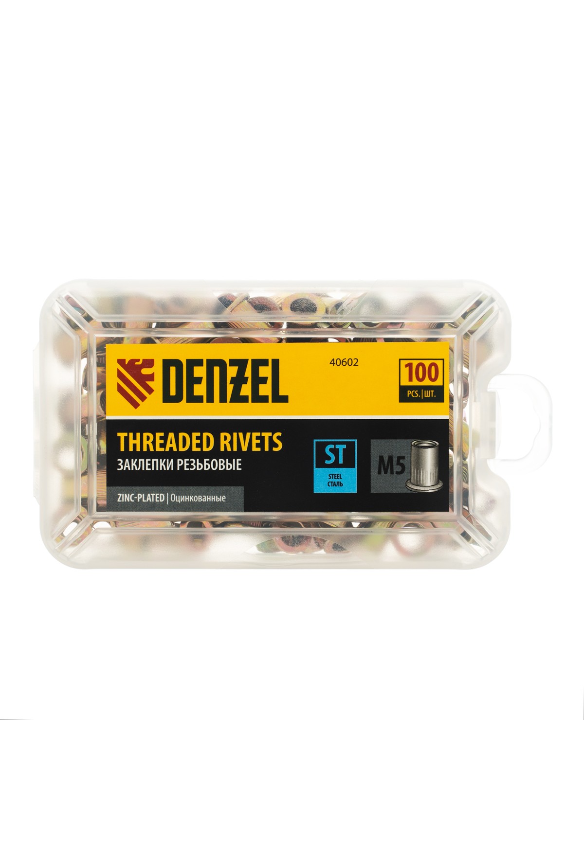 Заклепки резьбовые, стальные, оцинкованные, М5, пластиковый кейс, 100 шт. Denzel