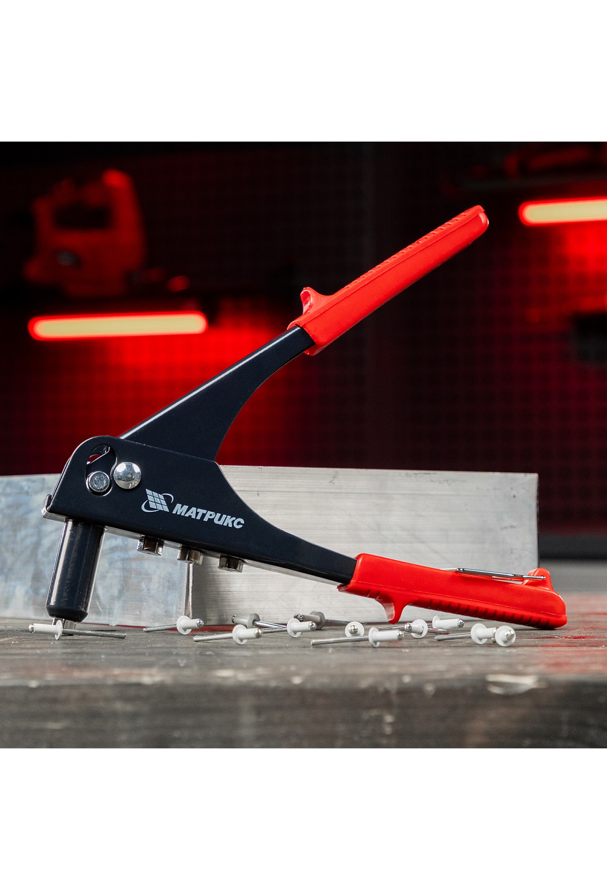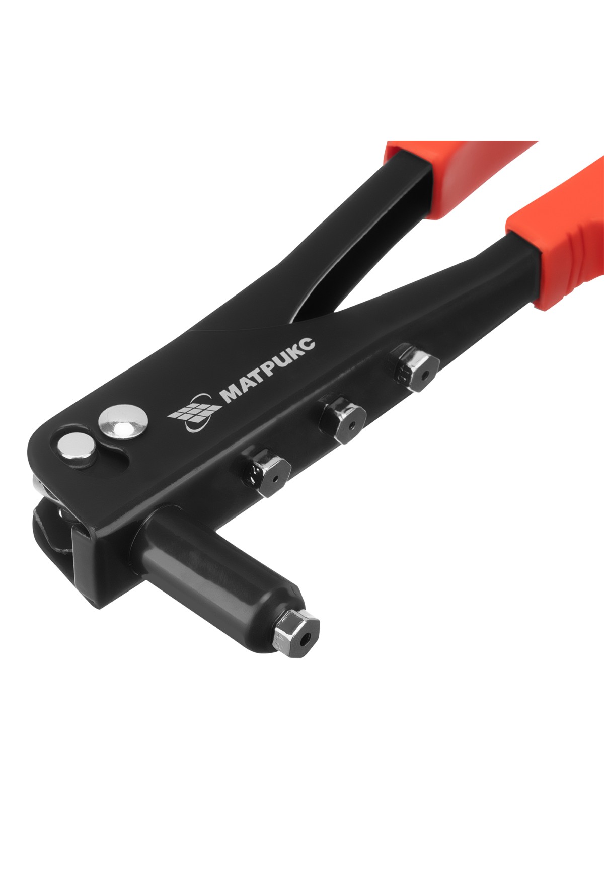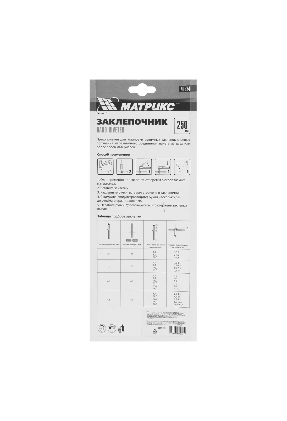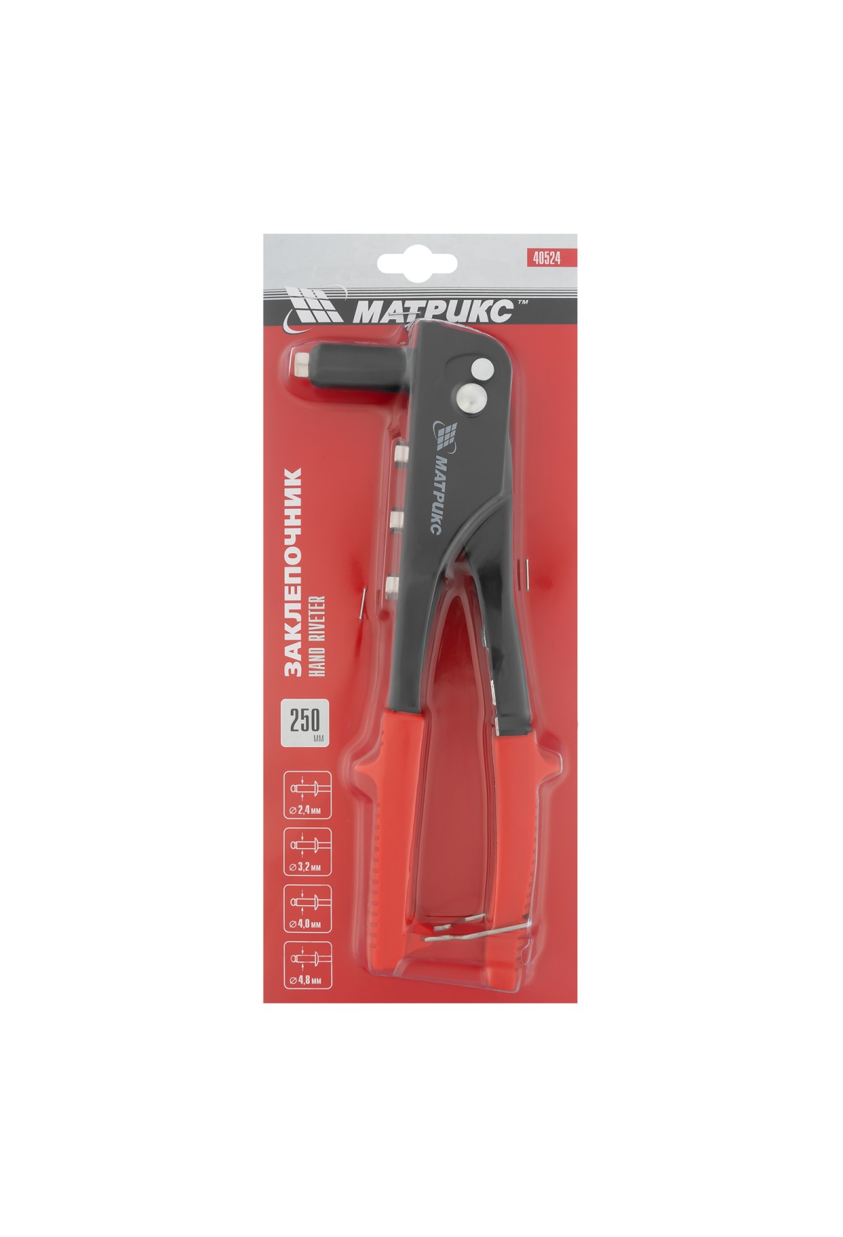 Заклепочник МАТРИКС 40524 длиной 250 мм используется с вытяжными заклепками диаметром от 2,4 до 4,8 мм. Инструмент применяется при работе с многослойным материалом и различными деталями из металла, пластика и т. д. В комплект входят сменные насадки для заклепок различного диаметра, фиксирующиеся на корпусе инструмента, поэтому их можно быстро менять при необходимости. Заклепочник будет полезен во время проведения строительных и ремонтных работ, пригодится также дома, в гараже или на даче., ,Преимущества,Прочность и долговечность — корпус выполнен из конструкционной стали.,Быстрая установка нужной насадки — в комплект поставки входит монтажный ключ.,Комфортная работа — рукоятки с рельефной поверхностью не выскальзывают из руки.,Удобное хранение — металлическая скоба надежно фиксирует рукоятки в нерабочем состоянии.