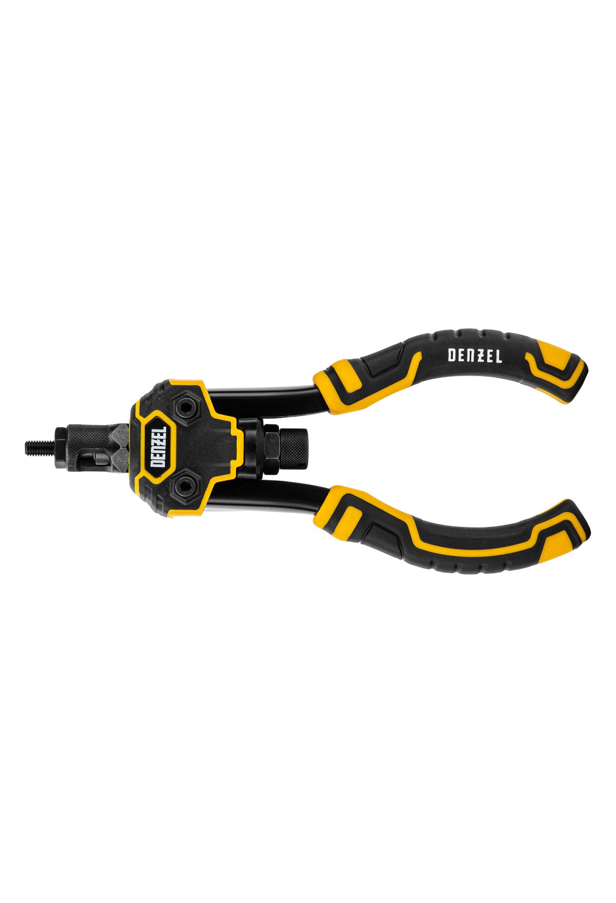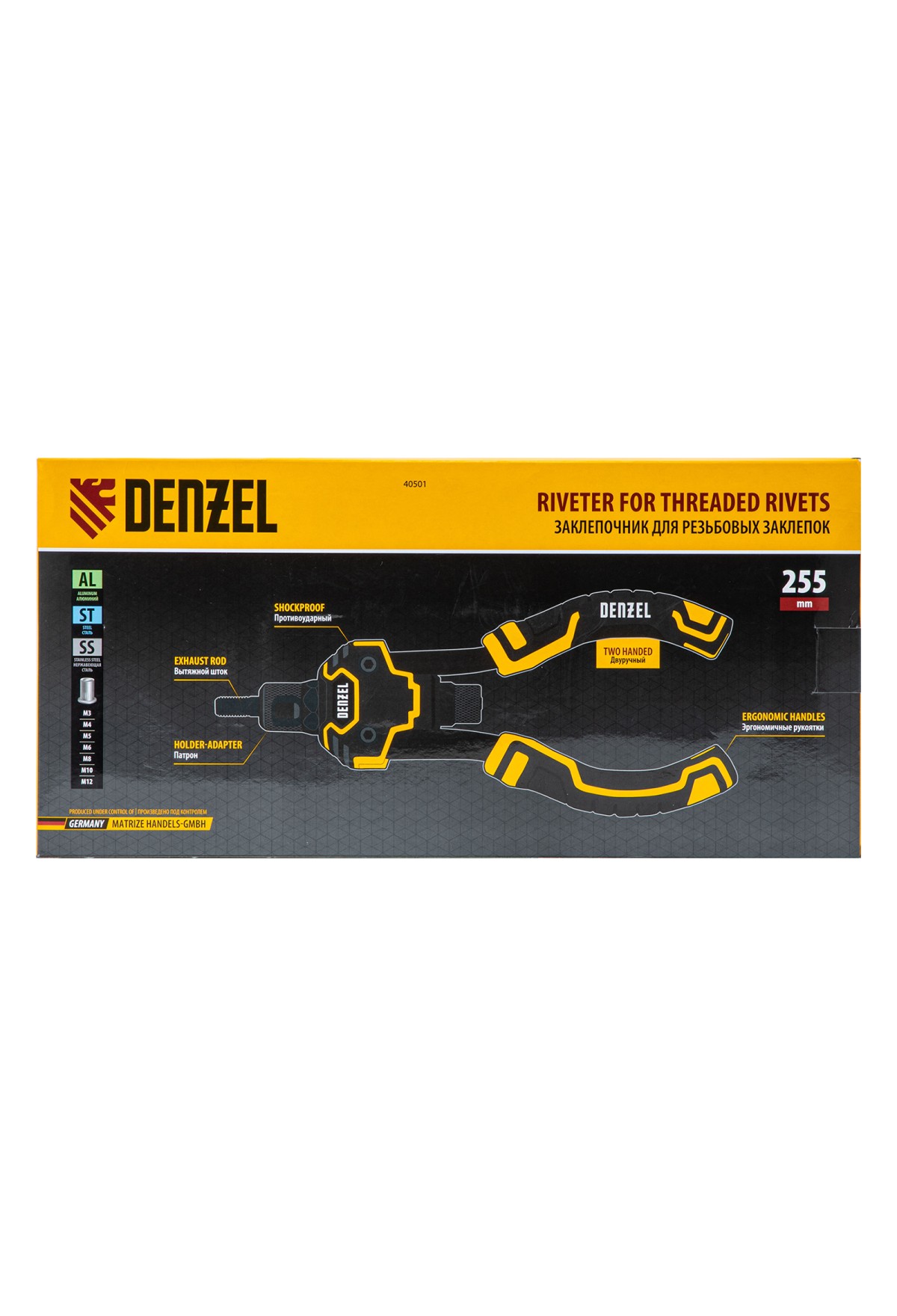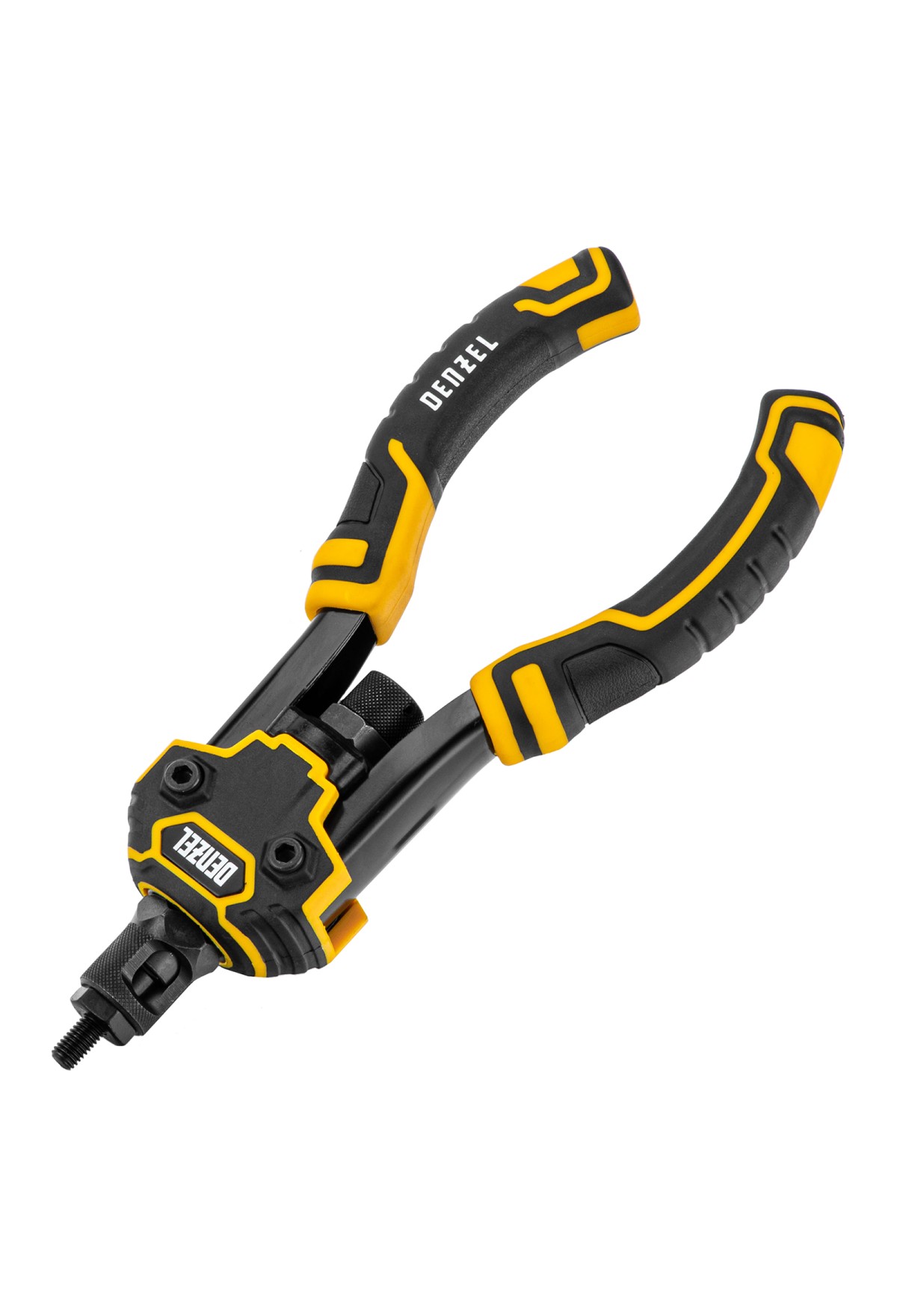 Заклепочник двуручный Denzel 40501 длиной 255 мм предназначен для создания неразъемных соединений при помощи резьбовых заклепок из алюминия, стали или нержавеющей стали (М3, М4, М5, М6, М8, М10, М12). Позволяет прочно фиксировать листовые заготовки, металлический профиль и легкие конструкции. Для каждого типоразмера заклепок предусмотрена соответствующая головка. Инструмент применяется при проведении строительных, монтажных работ, будет полезен дома, в гараже или на даче.
