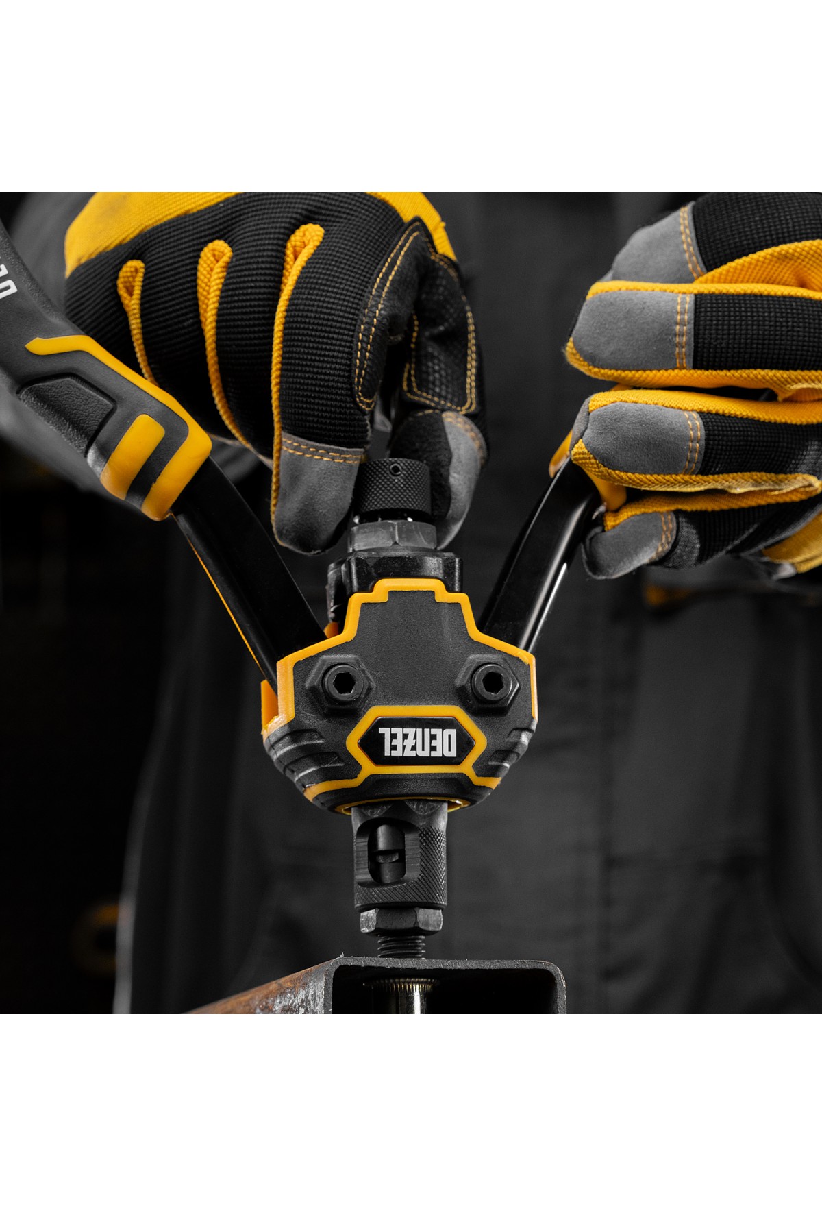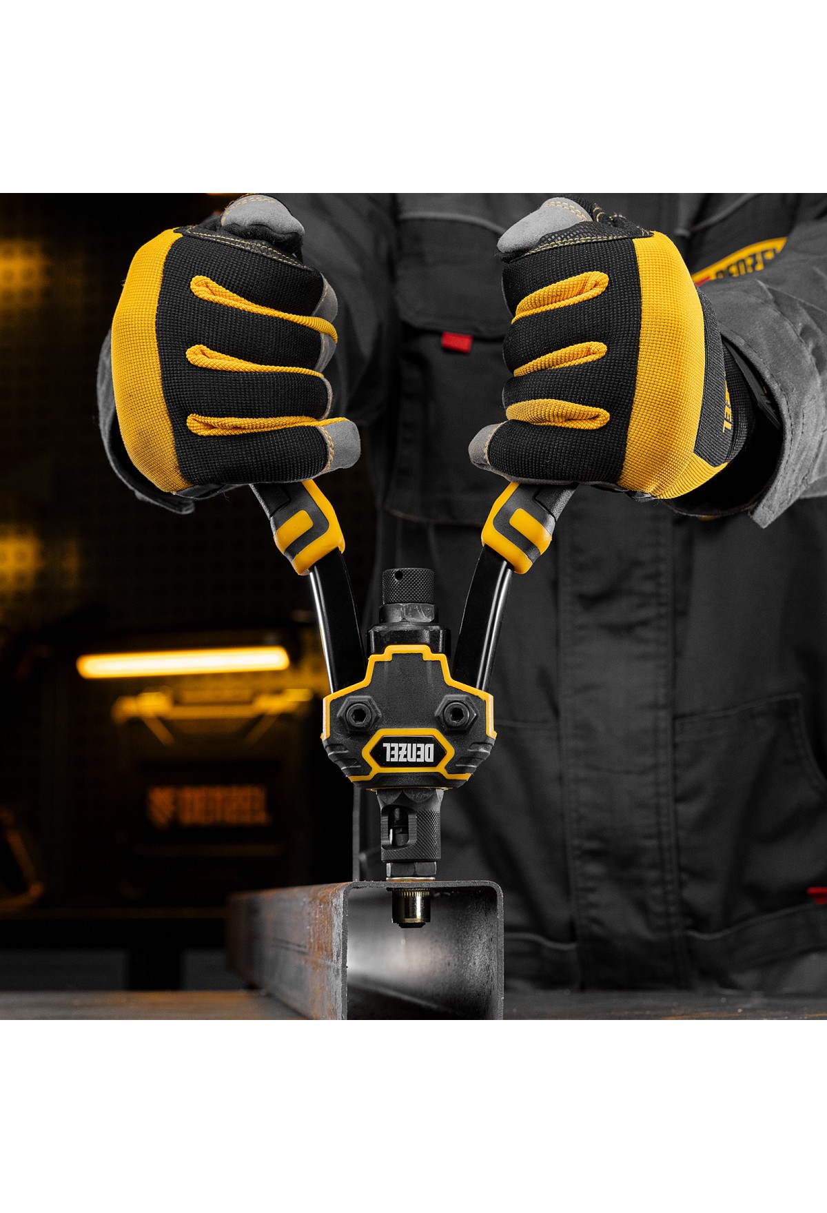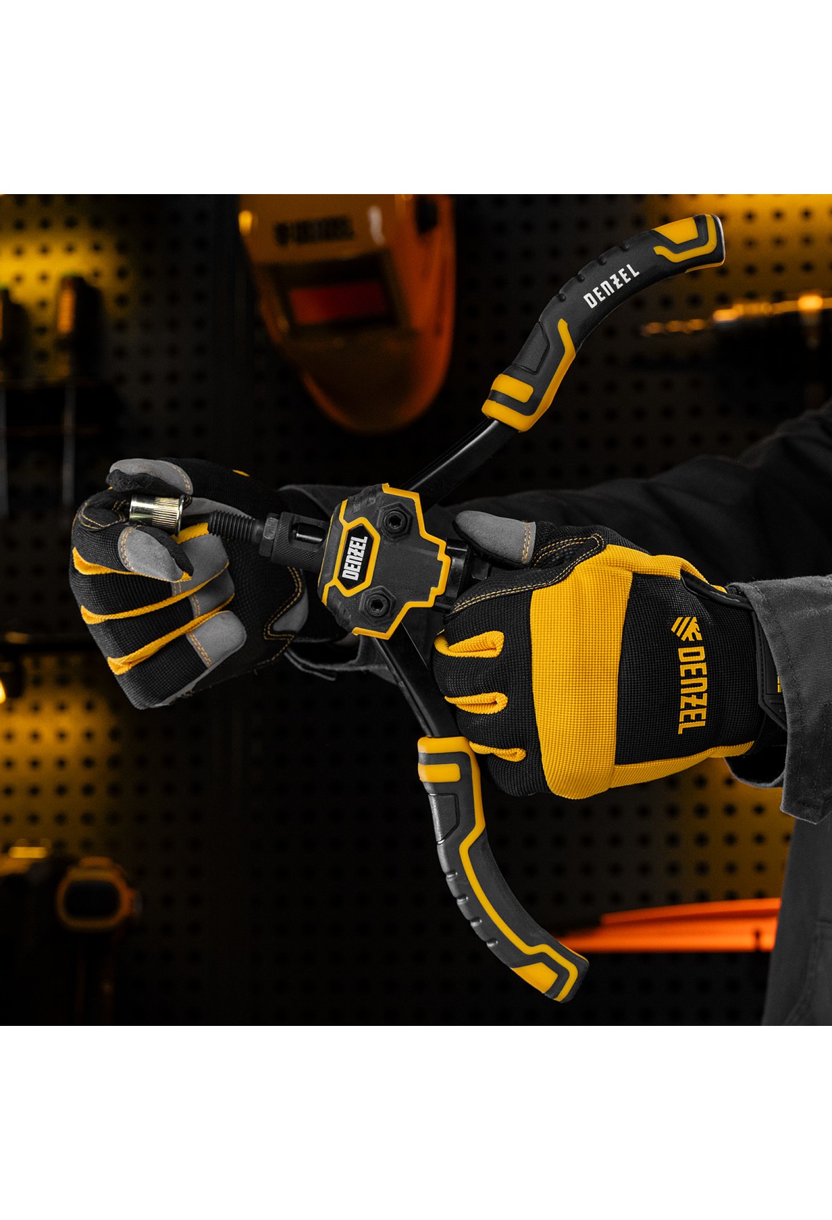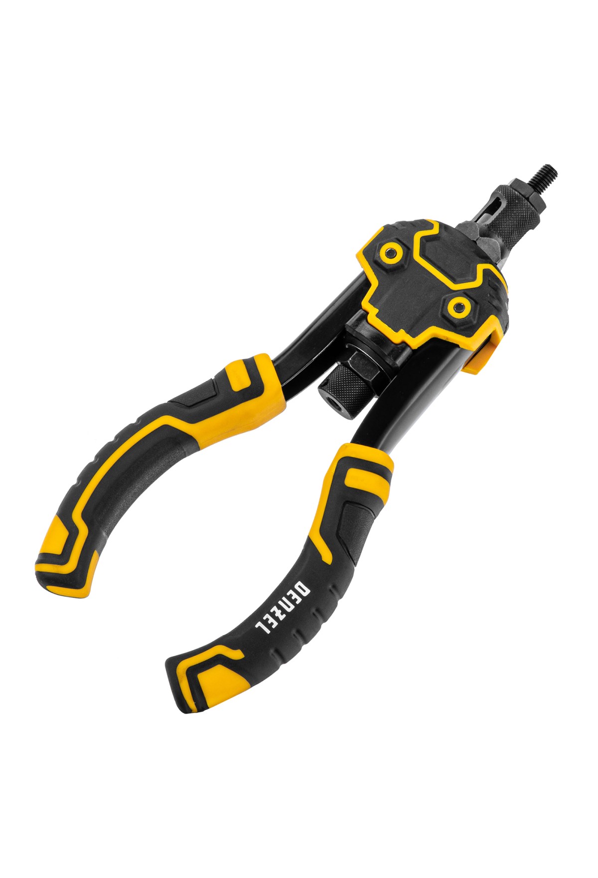 Заклепочник двуручный Denzel 40501 длиной 255 мм предназначен для создания неразъемных соединений при помощи резьбовых заклепок из алюминия, стали или нержавеющей стали (М3, М4, М5, М6, М8, М10, М12). Позволяет прочно фиксировать листовые заготовки, металлический профиль и легкие конструкции. Для каждого типоразмера заклепок предусмотрена соответствующая головка. Инструмент применяется при проведении строительных, монтажных работ, будет полезен дома, в гараже или на даче.