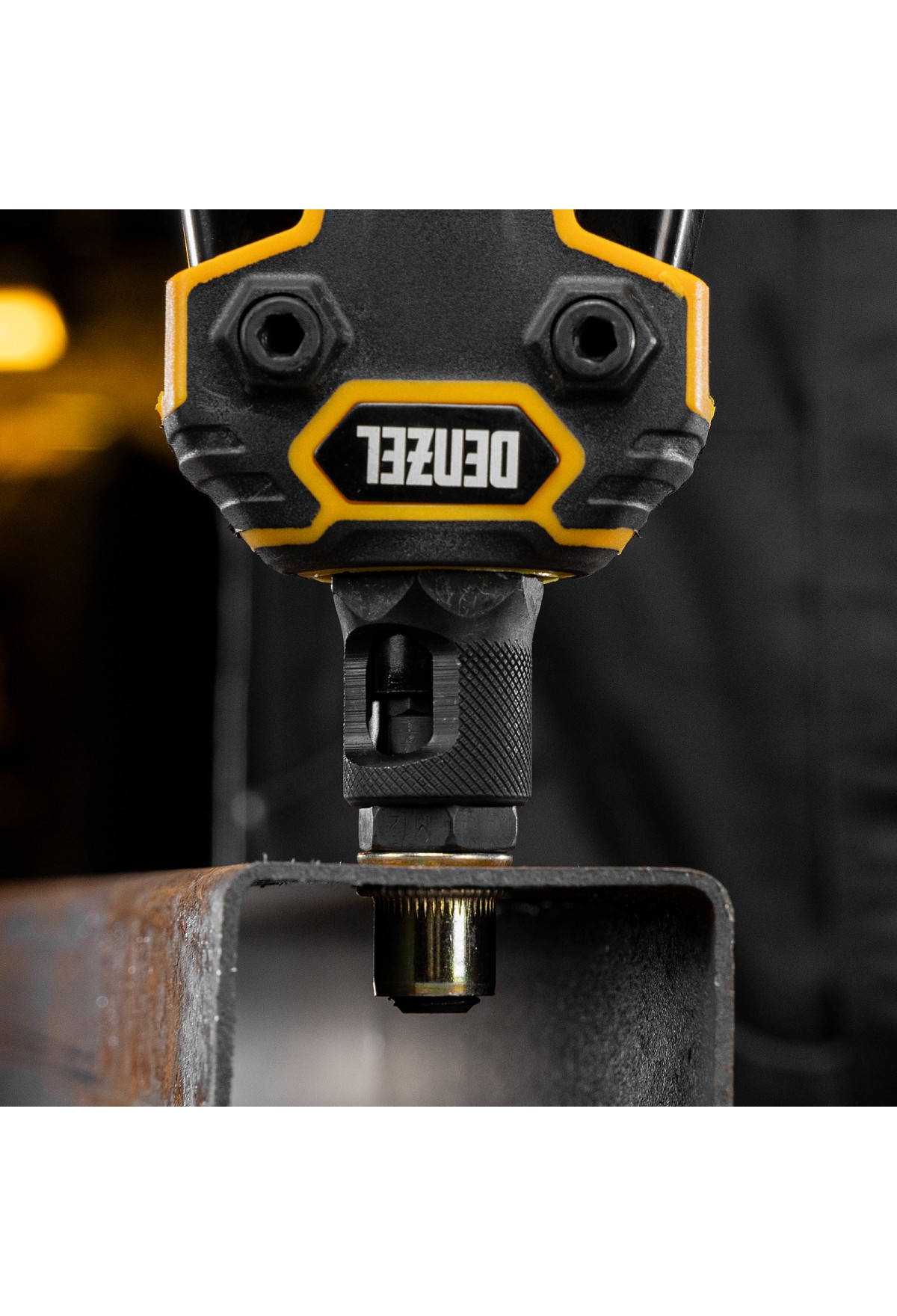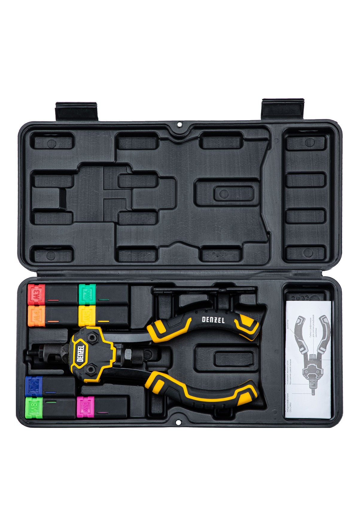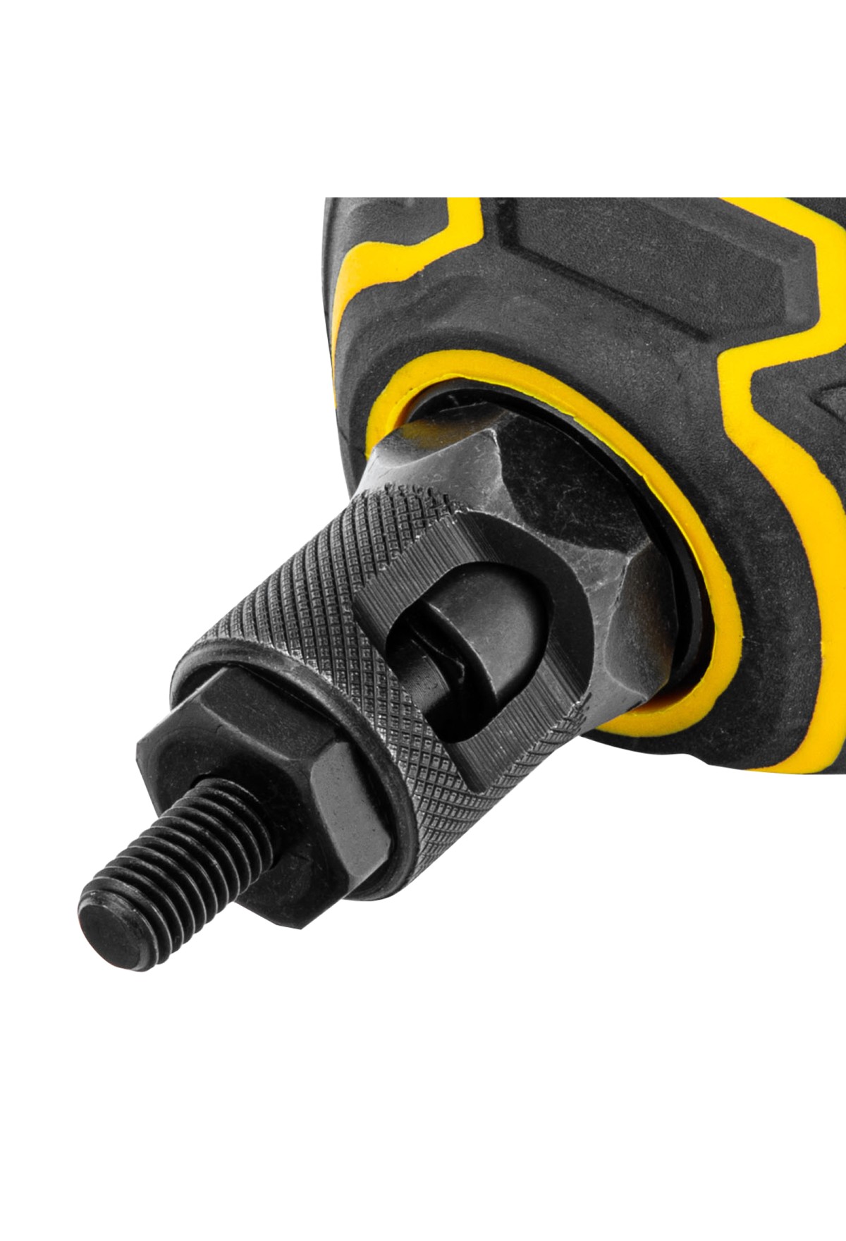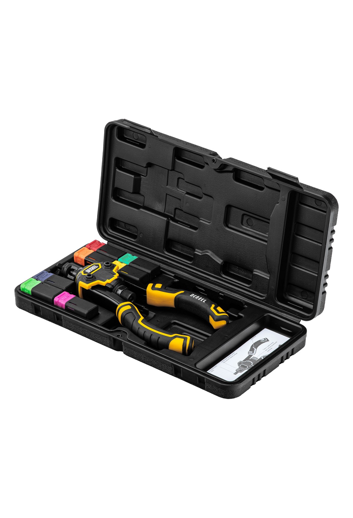 - Продуманная комплектация — заклепочник поставляется с ключом для быстрой установки насадок.
