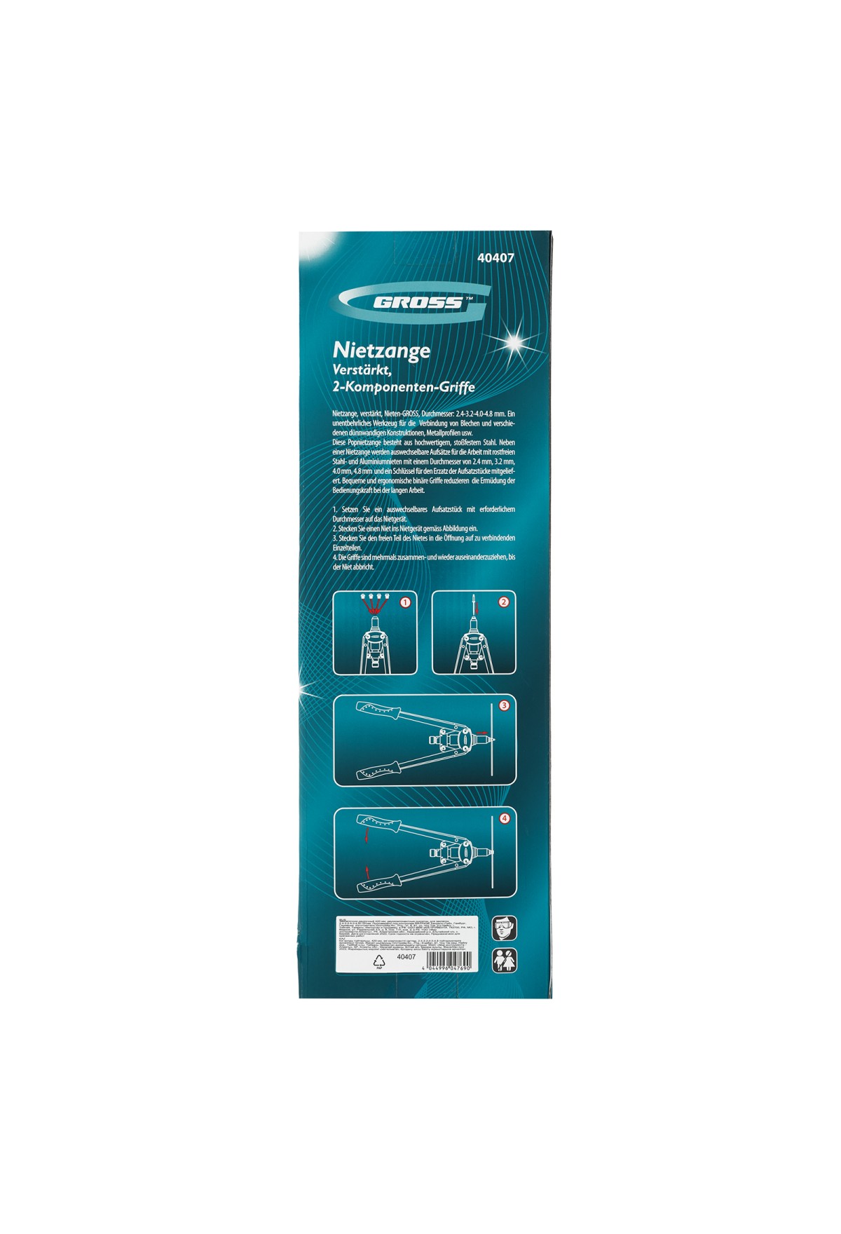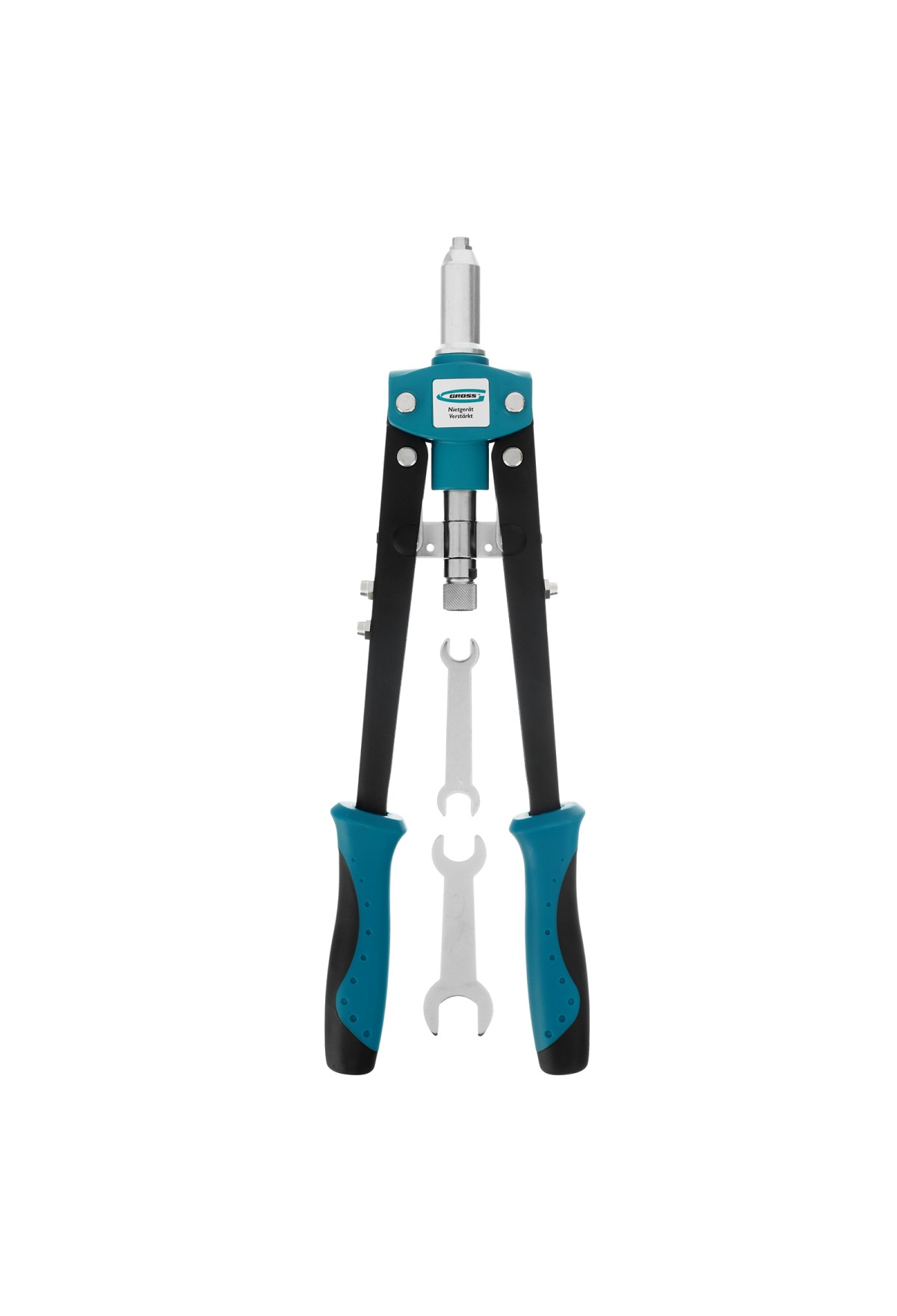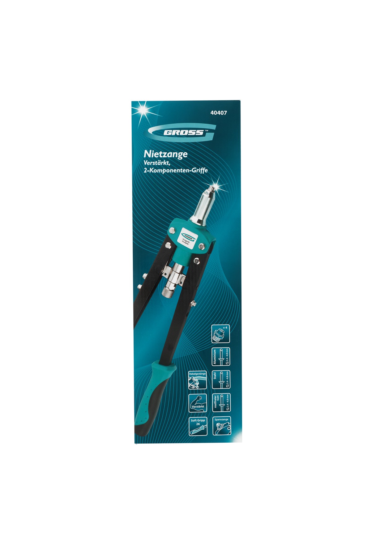 Заклёпочник двуручный Gross 40407 с двухкомпонентными рукоятками, 420 мм, предназначен для соединения листовых заготовок, металлопрофиля, легких строительных конструкций и плоских деталей. Применяется с алюминиевыми, стальными и нержавеющими заклёпками 2,4-3,2-4,0-4,8 мм, для которых предусмотрены сменные насадки. Заклёпочник используется при проведении строительных и ремонтных работ, в производстве мебели, бытовой и оргтехники, а также для ремонта автомобилей.