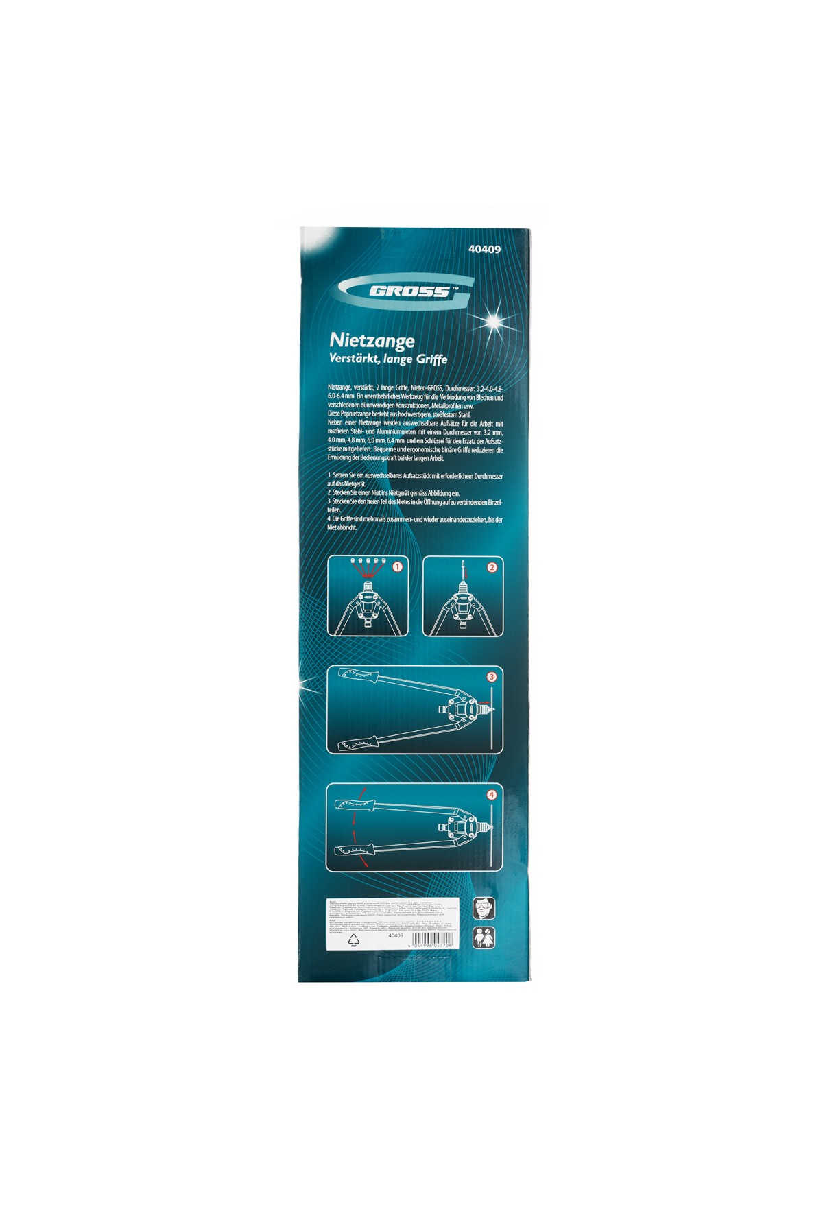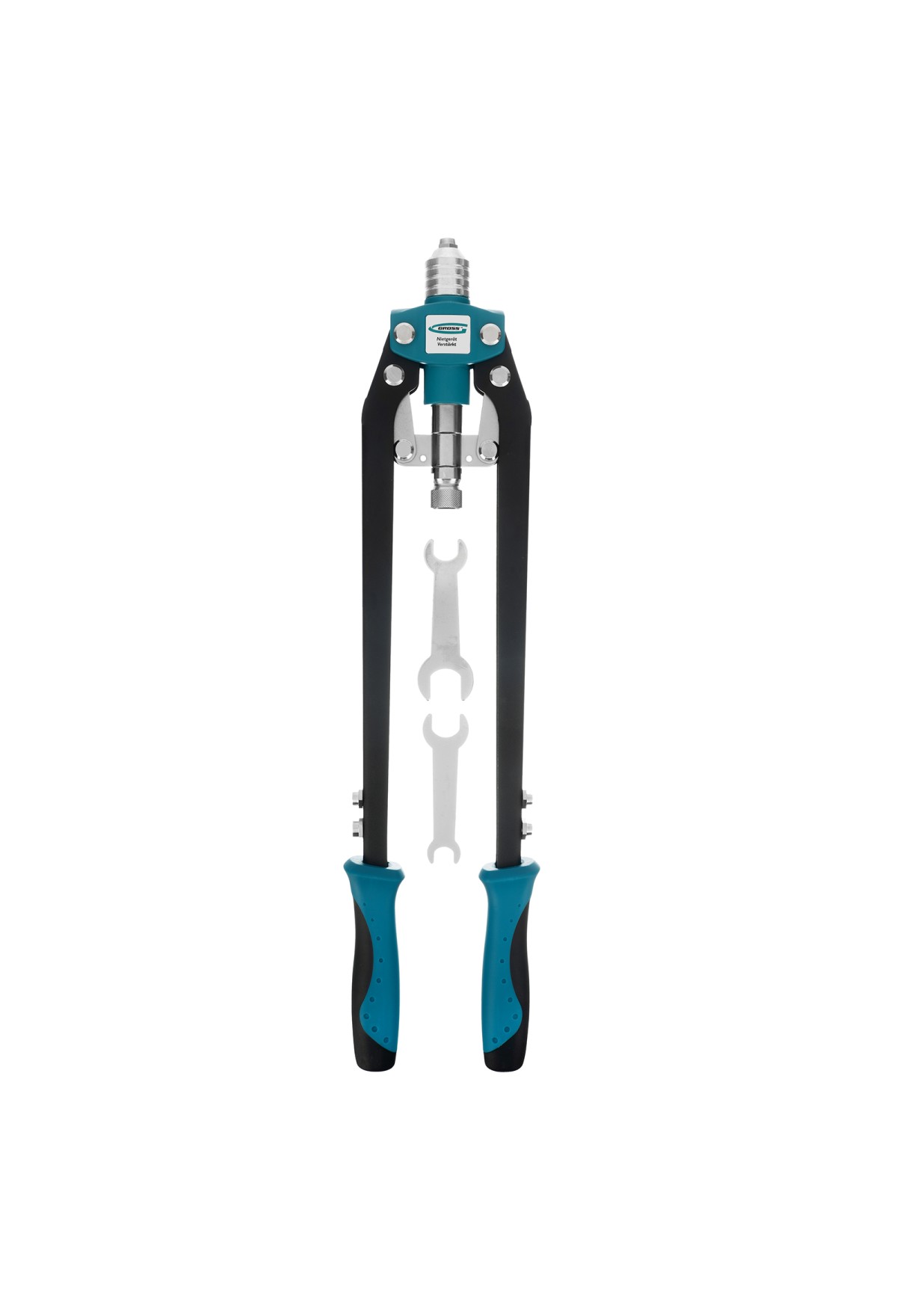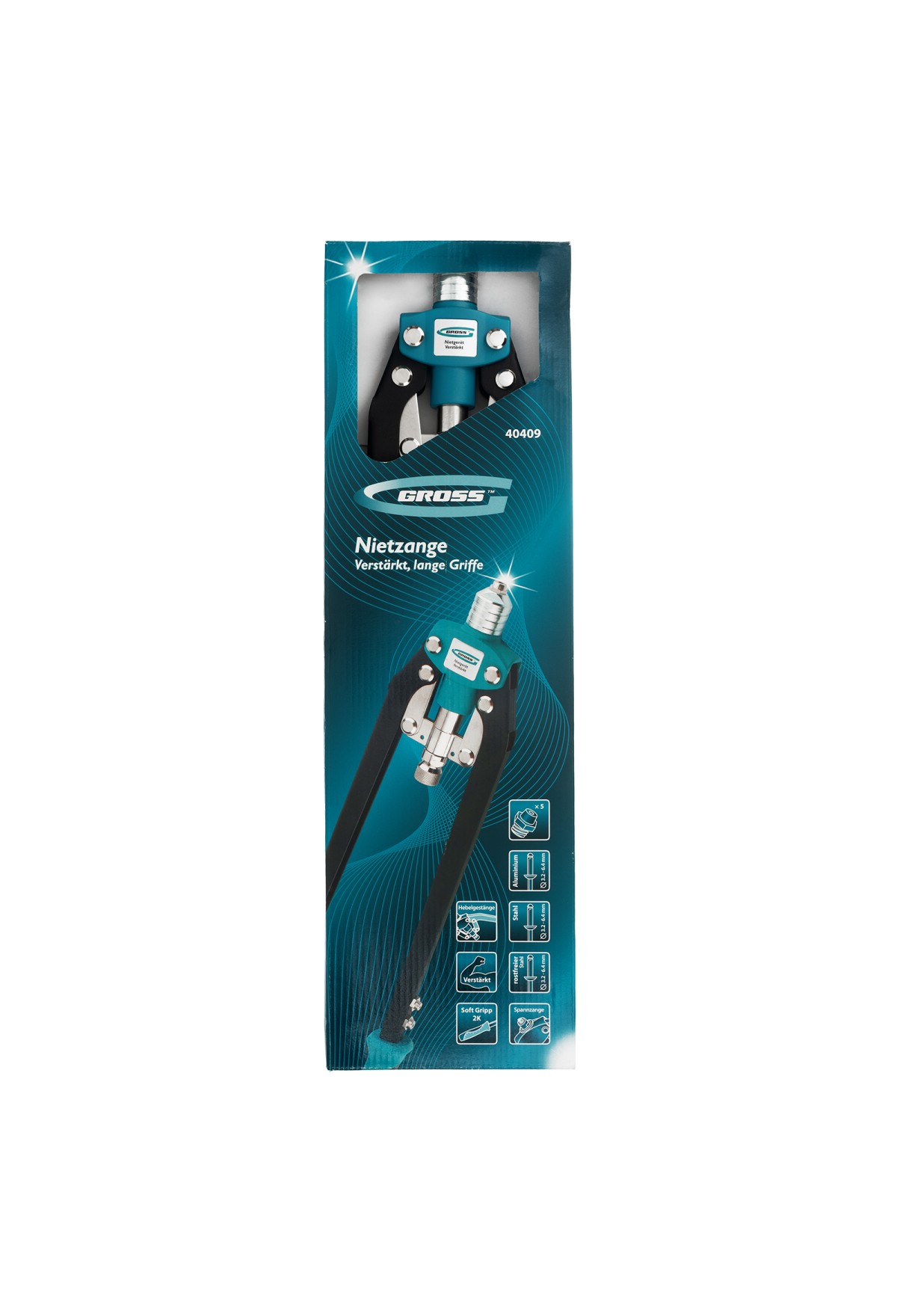 Двуручный усиленный заклепочник Gross 40409 длиной 520 мм, с удлиненными рукоятками, предназначен для соединения листовых заготовок, металлопрофиля, легких строительных конструкций и плоских деталей при помощи алюминиевых или стальных (в том числе из нержавеющей стали) заклепок размером 3,2-4,0-4,8-6,0-6,4 мм, для которых предусмотрены сменные насадки соответствующих размеров. Благодаря удлиненным рукояткам процесс клепки требует меньше усилий, чем при применении обычного инструмента. Заклепочник используется при проведении строительных и ремонтных работ, в производстве мебели, бытовой и оргтехники, а также при ремонте автомобилей.