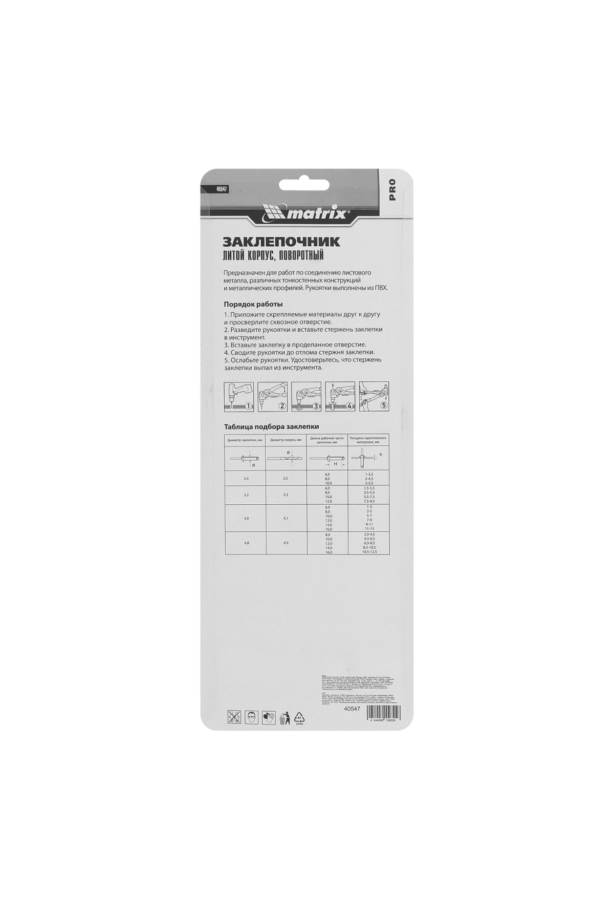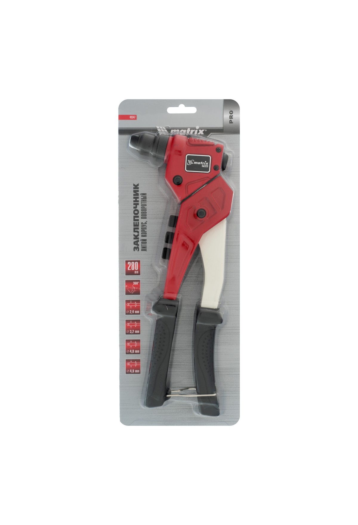 Технические характеристики Заклепочник литой, поворотный, 290 мм, 0-360 град, заклепки 2.4-3.2-4.0-4.8 мм, Pro Matrix