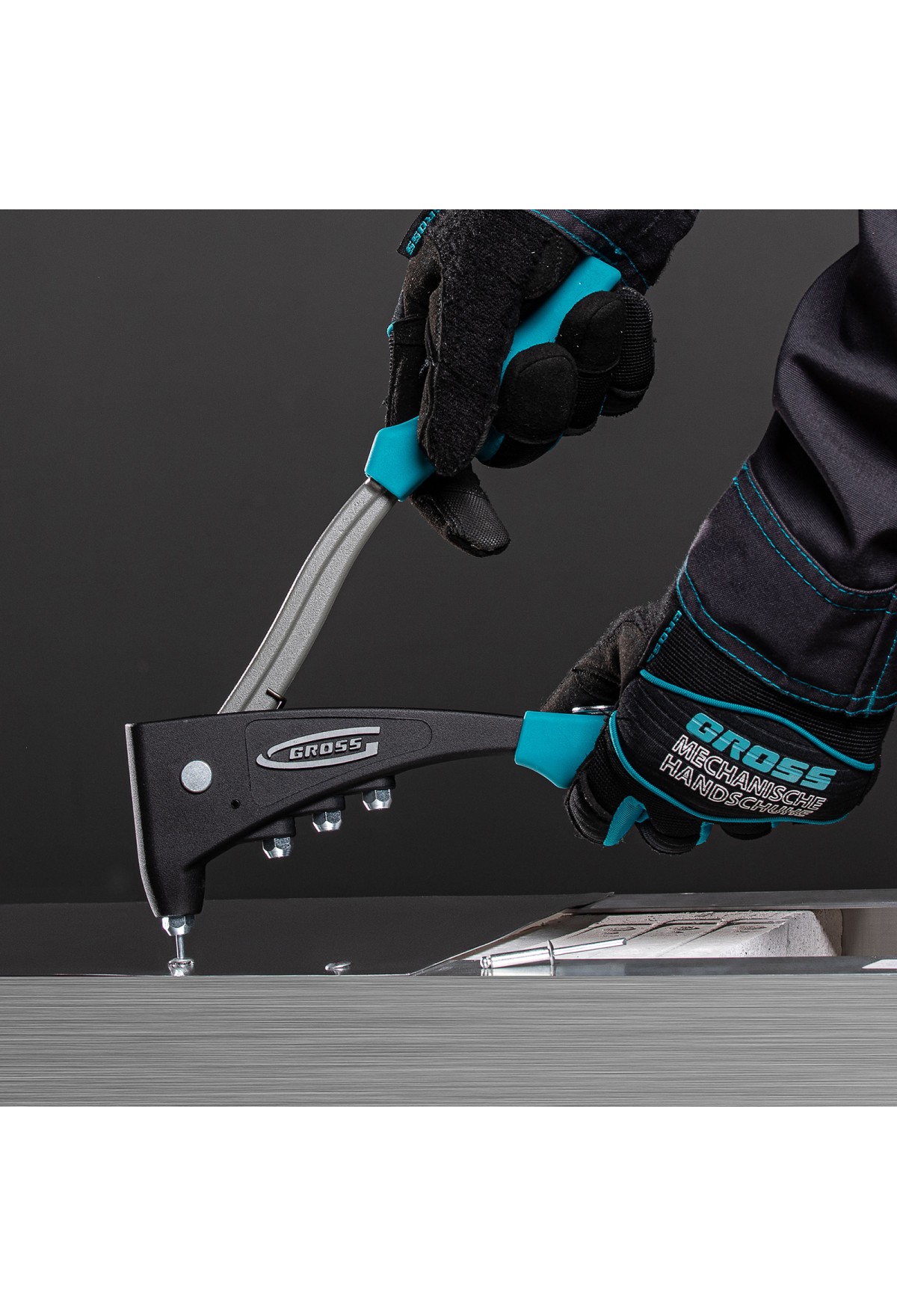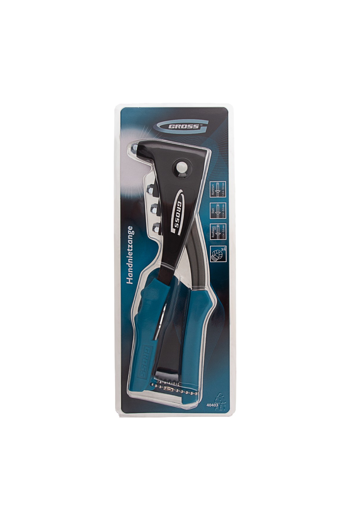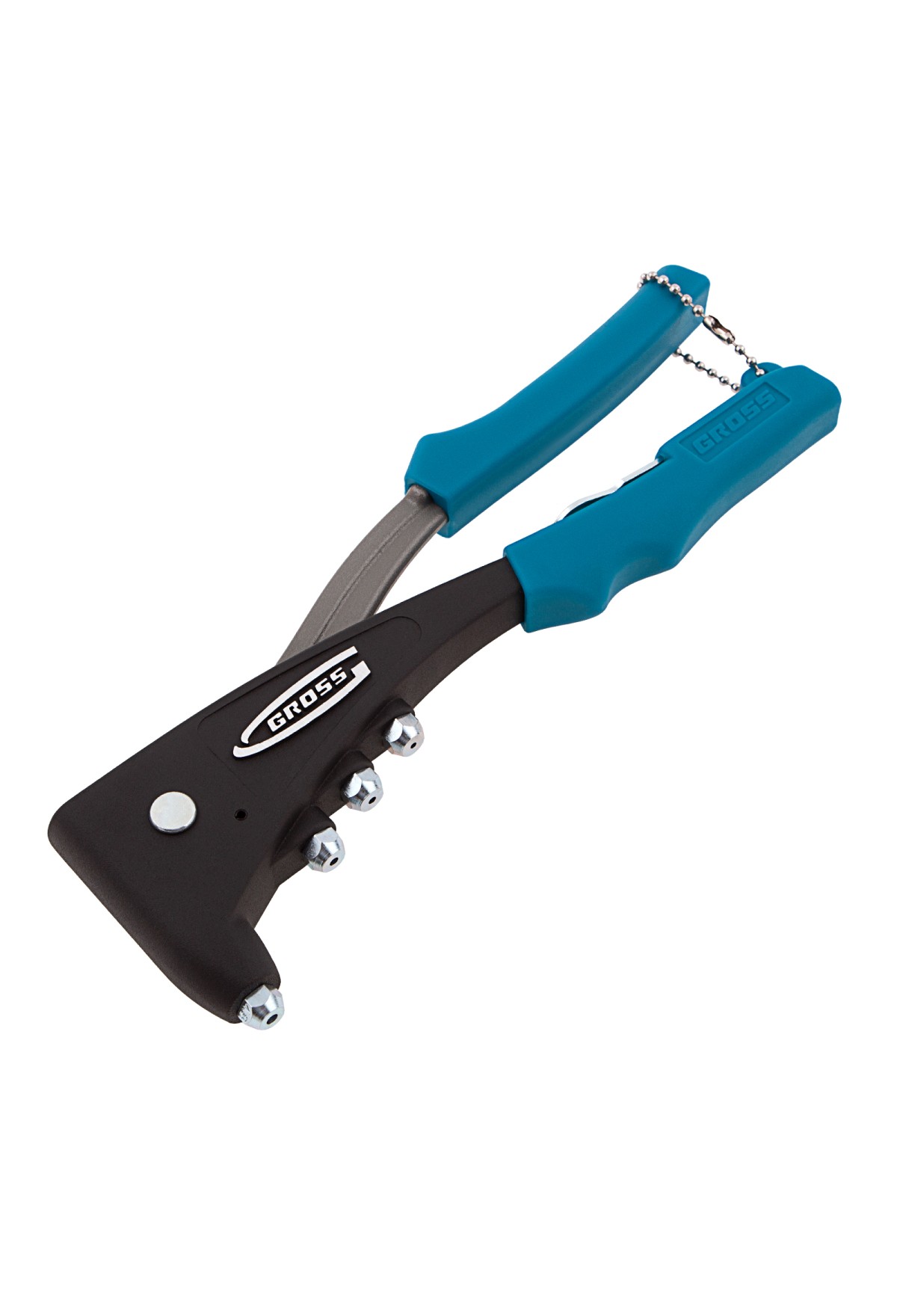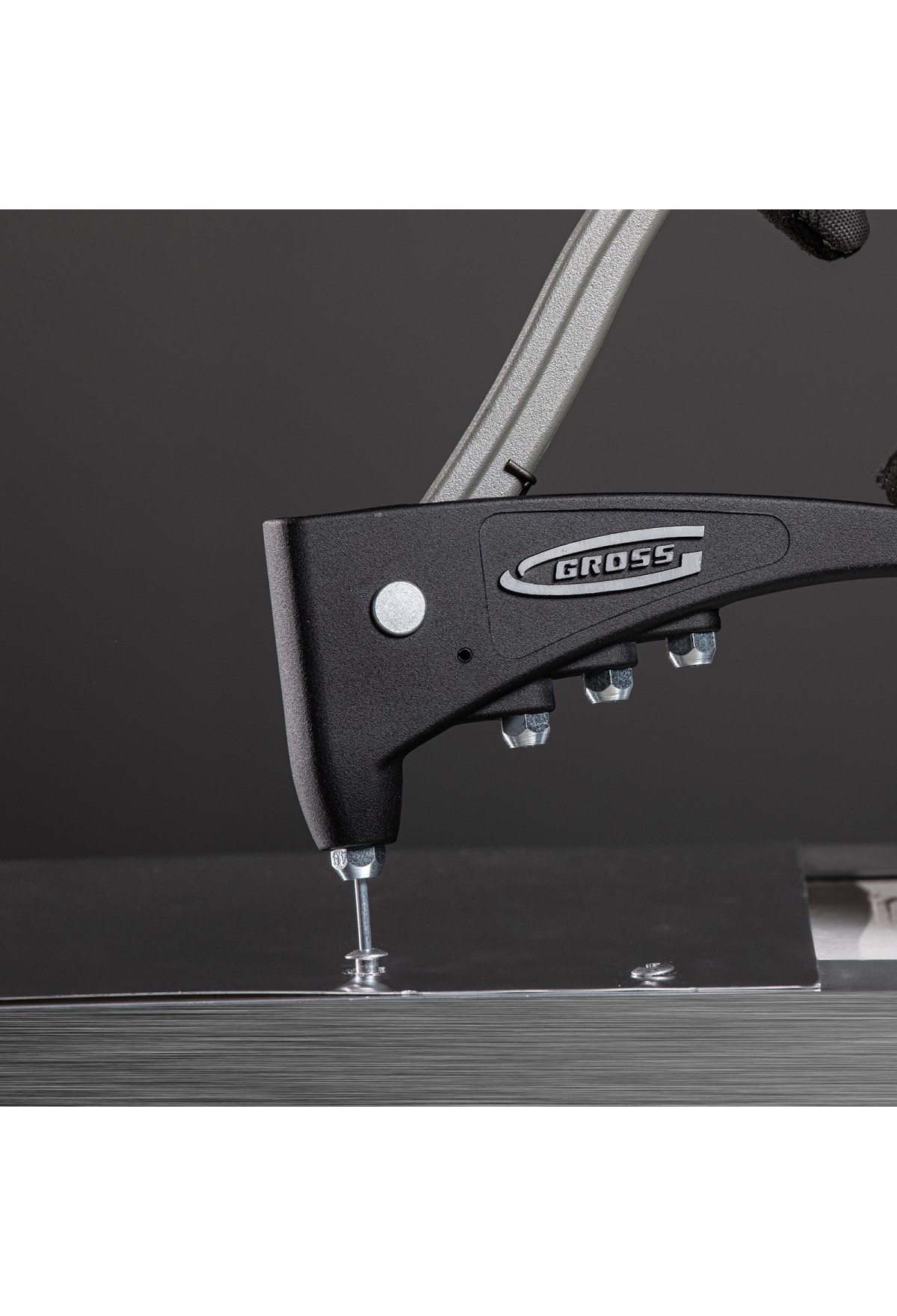 Литой усиленный заклепочник Gross 40403 для заклепок диаметром 2,4-4,8 мм применяется для надежного соединения плоских заготовок и деталей. Для этого используются стальные и алюминиевые заклепки или заклепки из нержавеющей стали. Для установки крепежа не требуется особых усилий благодаря кованому изогнутому рычагу. Инструмент используется в строительстве, при производстве мебели и техники, для соединения листового металла и т.д.