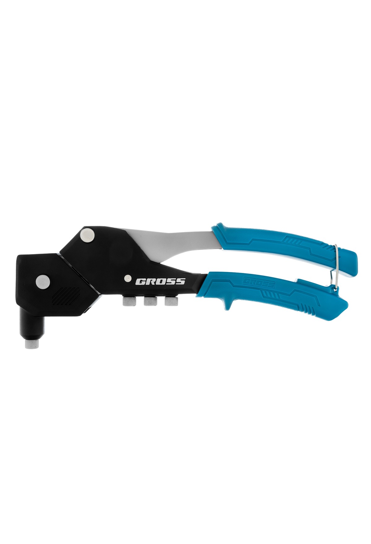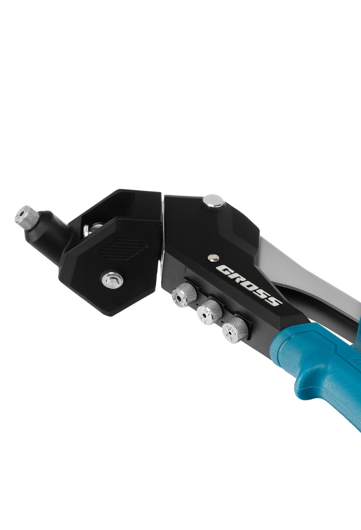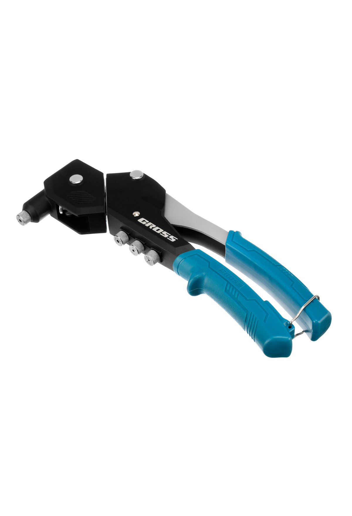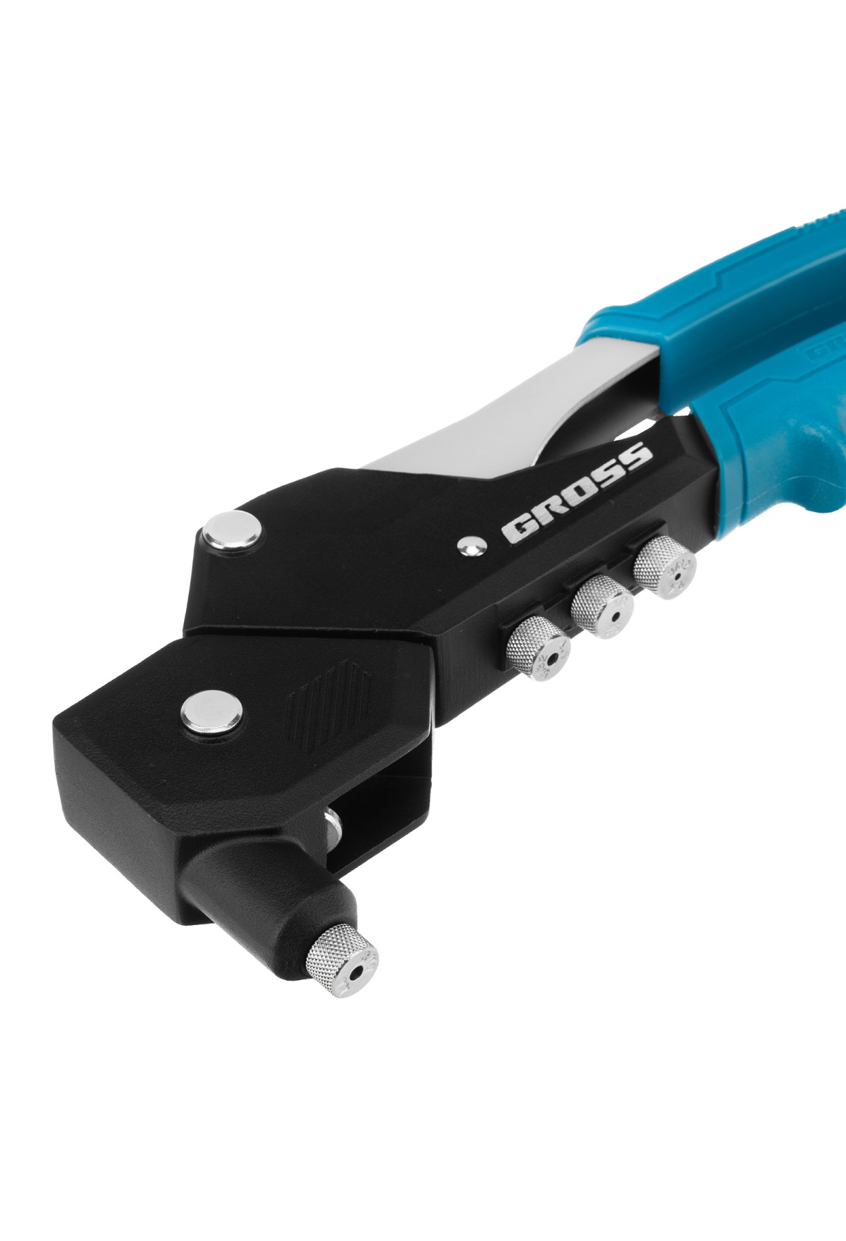 Заклепочник Gross 40418 длиной 290 мм, поворотный на 0-360°, используется для соединения плоских заготовок, металлических профилей и тонкостенных конструкций при помощи вытяжных заклепок из стали (типоразмер 2,4-4,0 мм), алюминия (2,4-4,8 мм) и «нержавейки» (2,4-3,2 мм). Обеспечивает быстрое и надежное крепление. Соответствующие сменные головки входят в комплект поставки. Поворотная голова облегчает работу в ограниченном пространстве. Инструмент будет полезен на строительной площадке, в ремонтной мастерской, а также в быту.