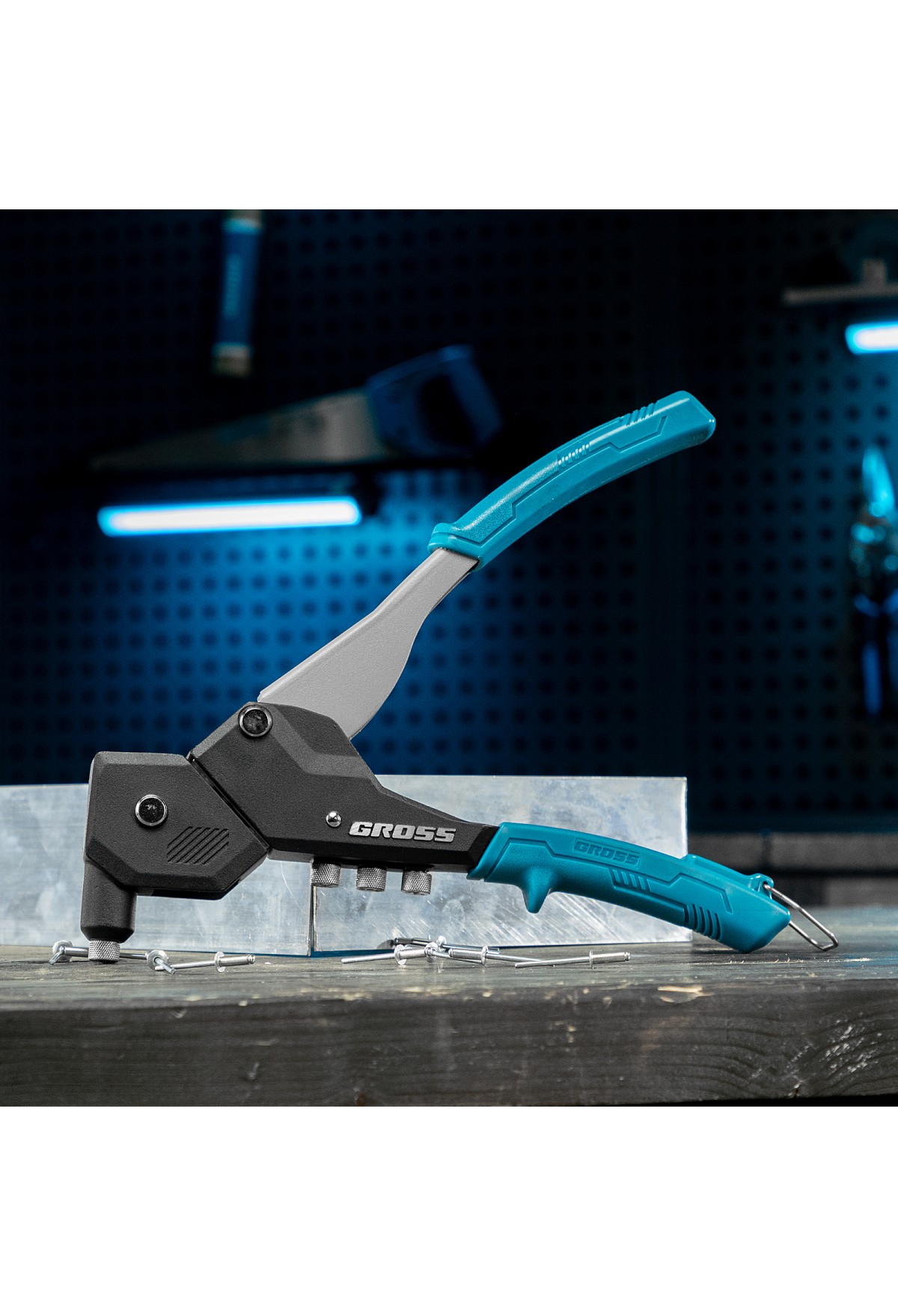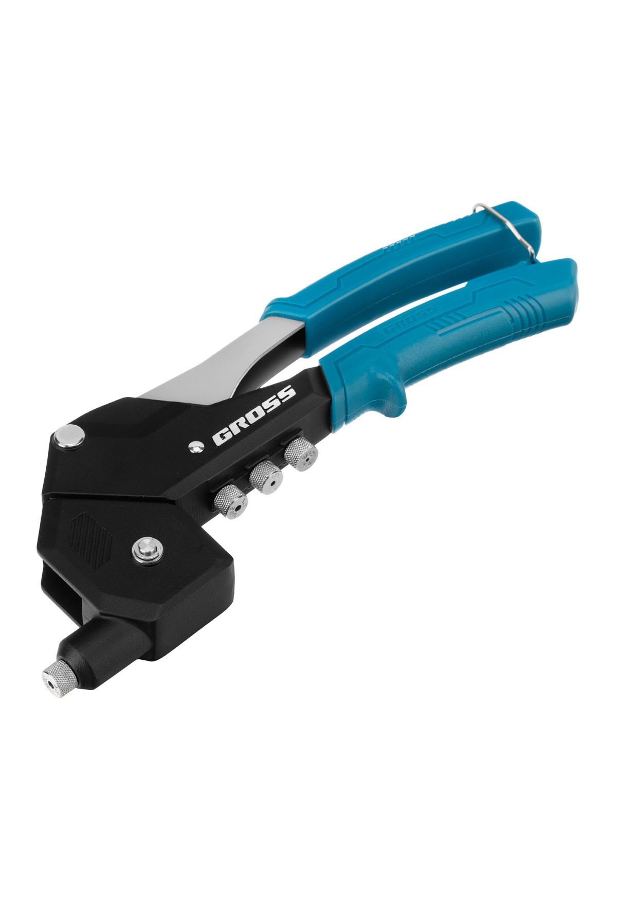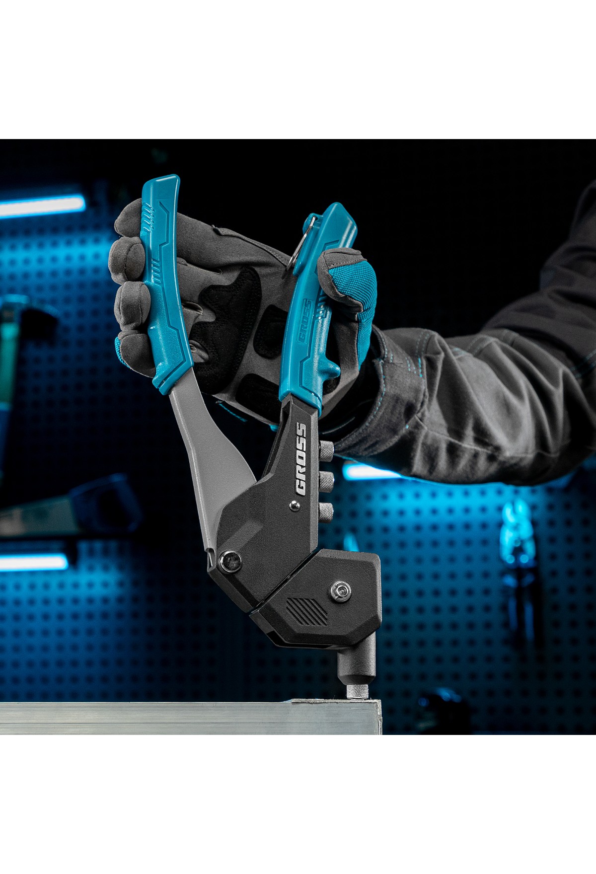 Заклепочник Gross 40418 длиной 290 мм, поворотный на 0-360°, используется для соединения плоских заготовок, металлических профилей и тонкостенных конструкций при помощи вытяжных заклепок из стали (типоразмер 2,4-4,0 мм), алюминия (2,4-4,8 мм) и «нержавейки» (2,4-3,2 мм). Обеспечивает быстрое и надежное крепление. Соответствующие сменные головки входят в комплект поставки. Поворотная голова облегчает работу в ограниченном пространстве. Инструмент будет полезен на строительной площадке, в ремонтной мастерской, а также в быту.