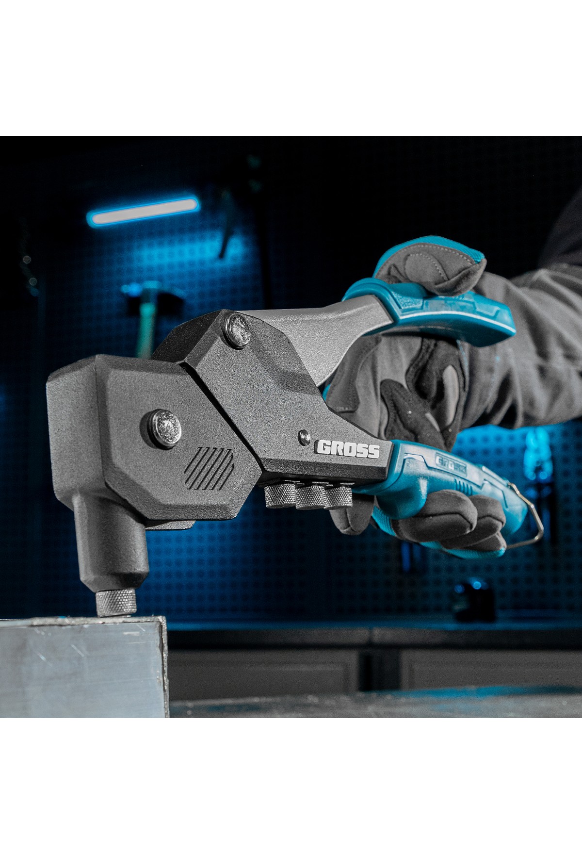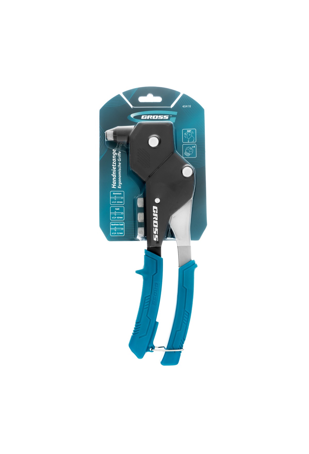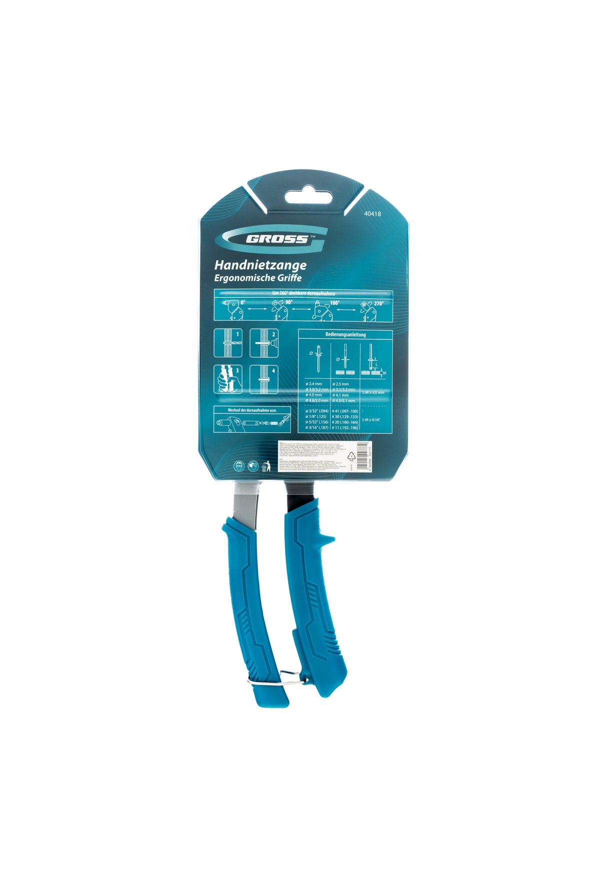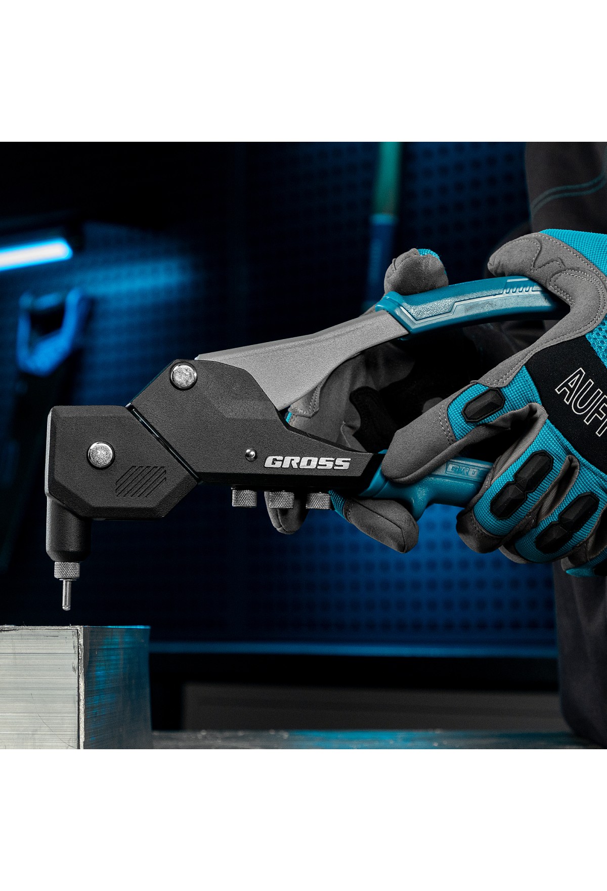 Заклепочник Gross 40418 длиной 290 мм, поворотный на 0-360°, используется для соединения плоских заготовок, металлических профилей и тонкостенных конструкций при помощи вытяжных заклепок из стали (типоразмер 2,4-4,0 мм), алюминия (2,4-4,8 мм) и «нержавейки» (2,4-3,2 мм). Обеспечивает быстрое и надежное крепление. Соответствующие сменные головки входят в комплект поставки. Поворотная голова облегчает работу в ограниченном пространстве. Инструмент будет полезен на строительной площадке, в ремонтной мастерской, а также в быту.