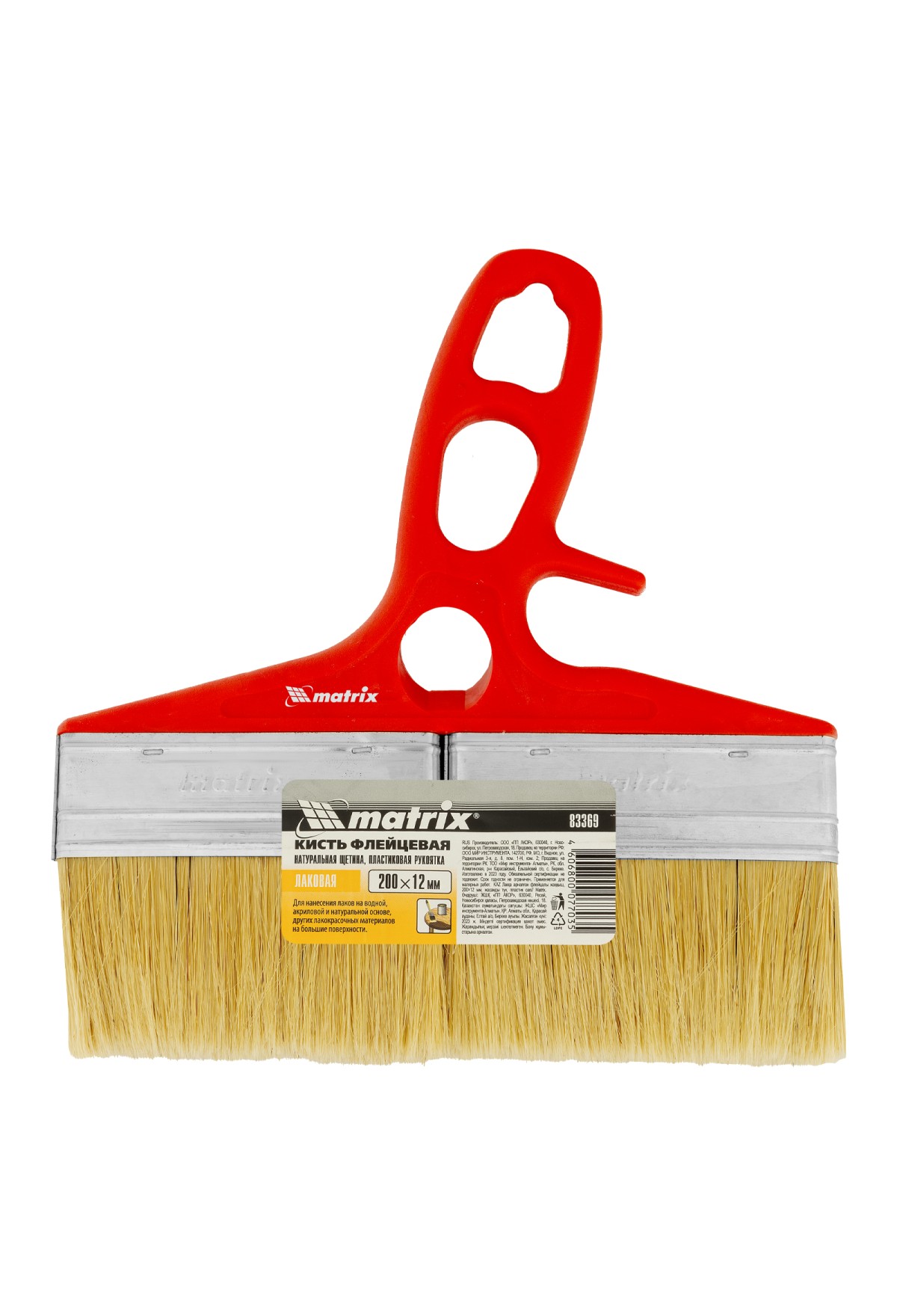 Флейцевая кисть для лаков Color Line Matrix 83369 шириной 200 мм и толщиной 12 мм, с натуральной щетиной и пластиковой ручкой, используется при отделке поверхностей лаковыми составами. Увеличенные размеры быстро обрабатывать участки большой площади. Натуральная светлая щетина расщеплена на концах, поэтому хорошо поглощает и отдает ЛКМ.