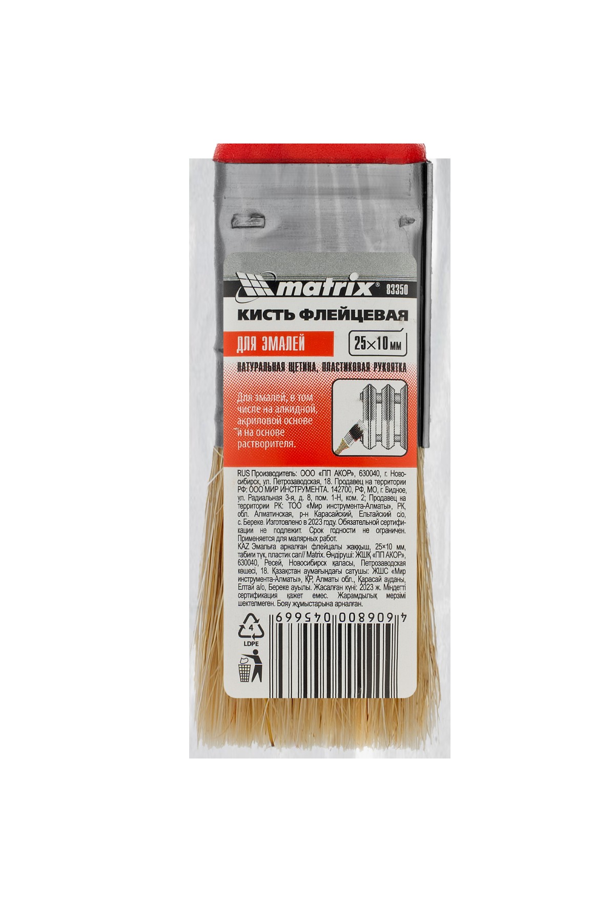 Флейцевая кисть Matrix Color Line «ЭМАЛИ» 83350 шириной 25 мм и толщиной 10 мм предназначена для работы с эмалями, в том числе на акриловой, алкидной основе, а также на основе растворителя. Натуральная щетина устойчива к износу и воздействию агрессивных жидкостей, а благодаря расщепленным концам хорошо впитывает и отдает краску. Высокая плотность щетины позволяет получить качественное покрытие.