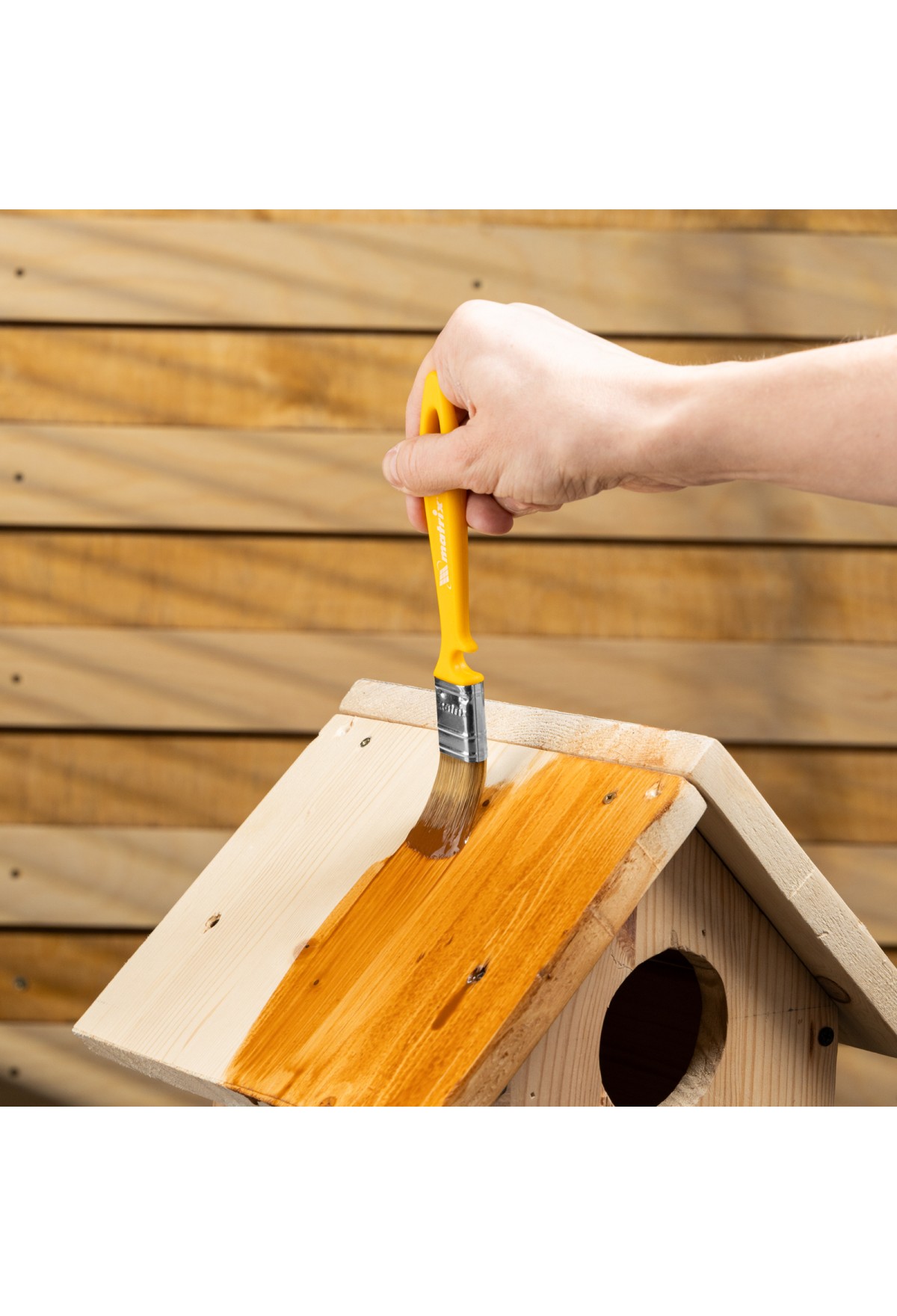 - Продуманное хранение — в рукоятке имеется отверстие для подвешивания кисти, а на время перерыва в работе инструмент можно закрепить на краю ведра или банки — для этого предусмотрена специальная выемка.