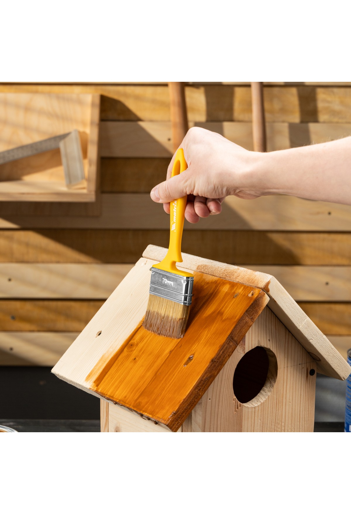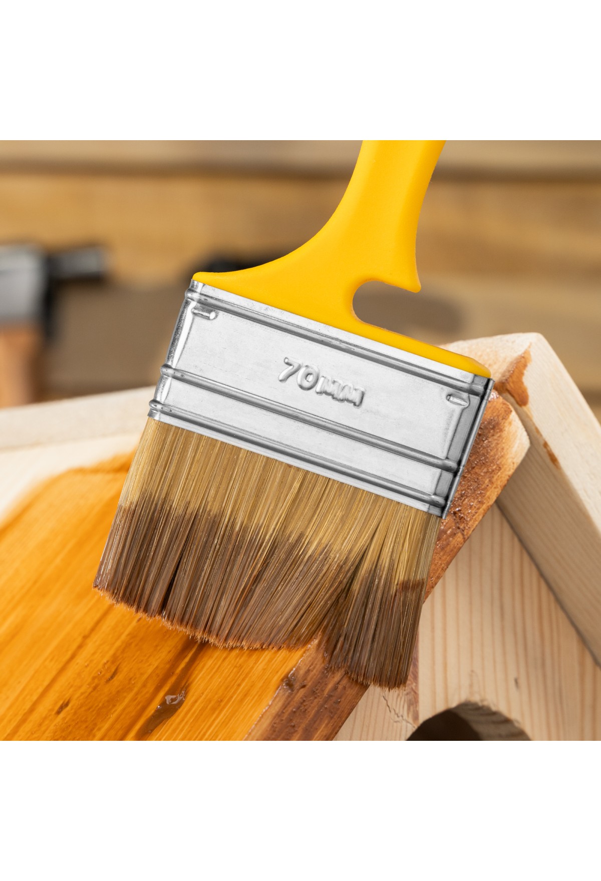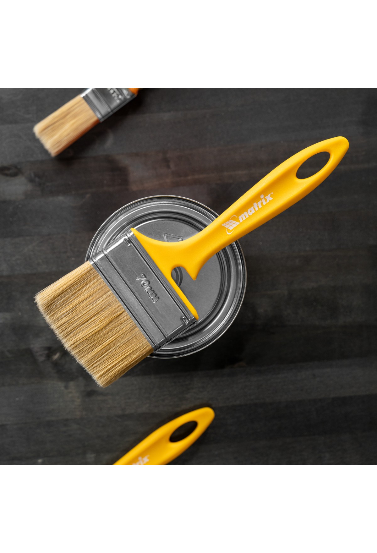 - Продуманное хранение — в рукоятке имеется отверстие для подвешивания кисти, а на время перерыва в работе инструмент можно закрепить на краю ведра или банки — для этого предусмотрена специальная выемка.