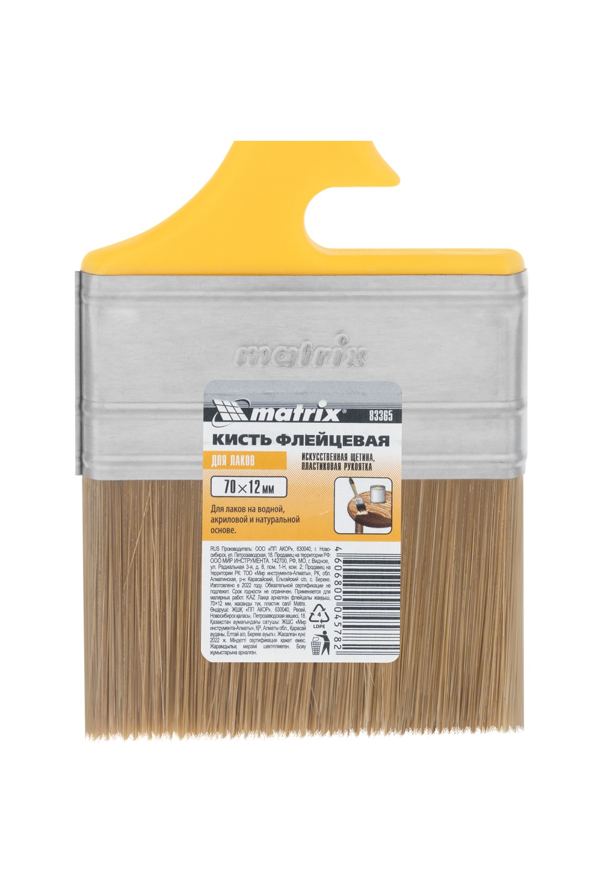 Флейцевая кисть Matrix Color Line «ЛАКИ» 83365 шириной 70 мм и толщиной 12 мм используется для отделочных работ с применением лаков на акриловой, водной и натуральной основе. Ею удобно лакировать небольшие участки. Искусственная щетина отличается повышенной упругостью, поэтому кисть обеспечивает высокое качество работ.