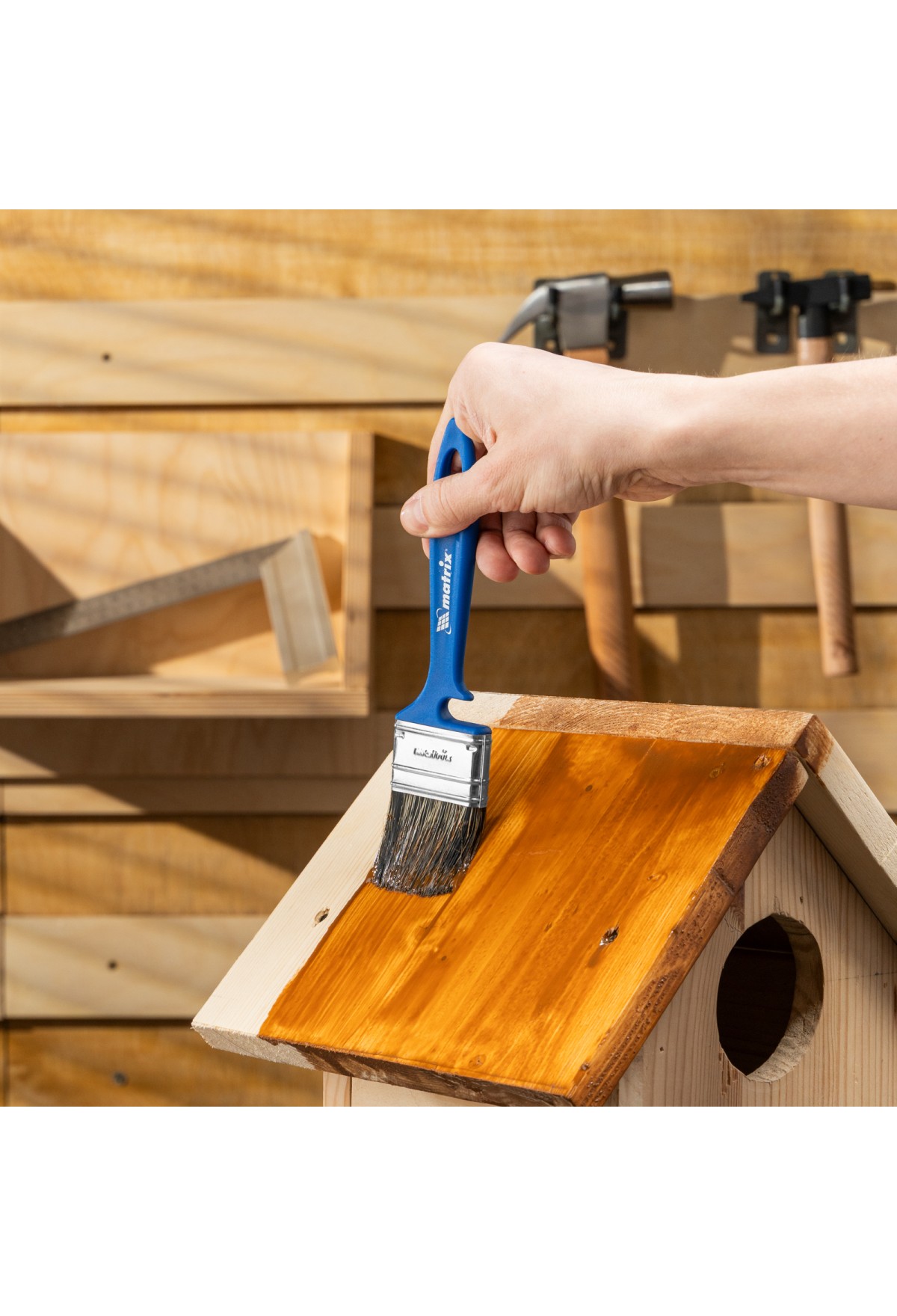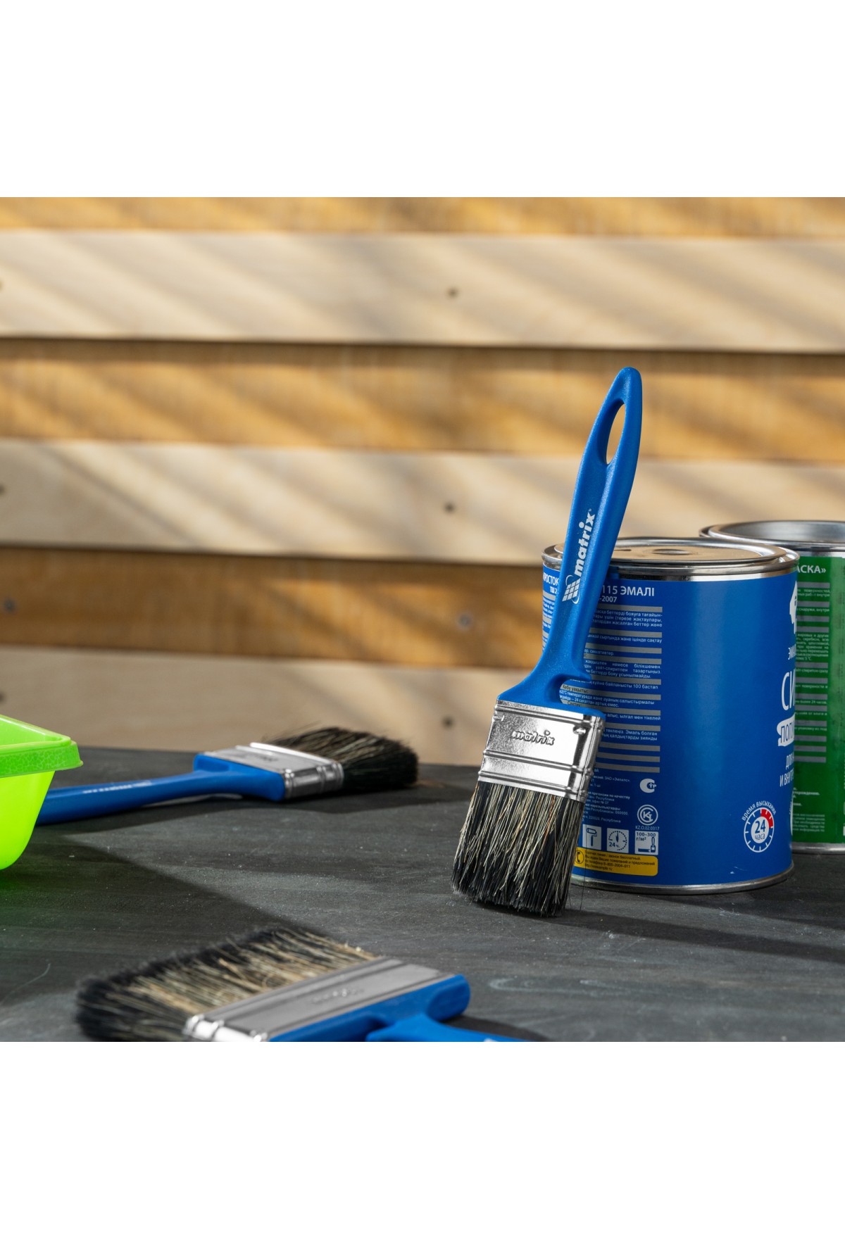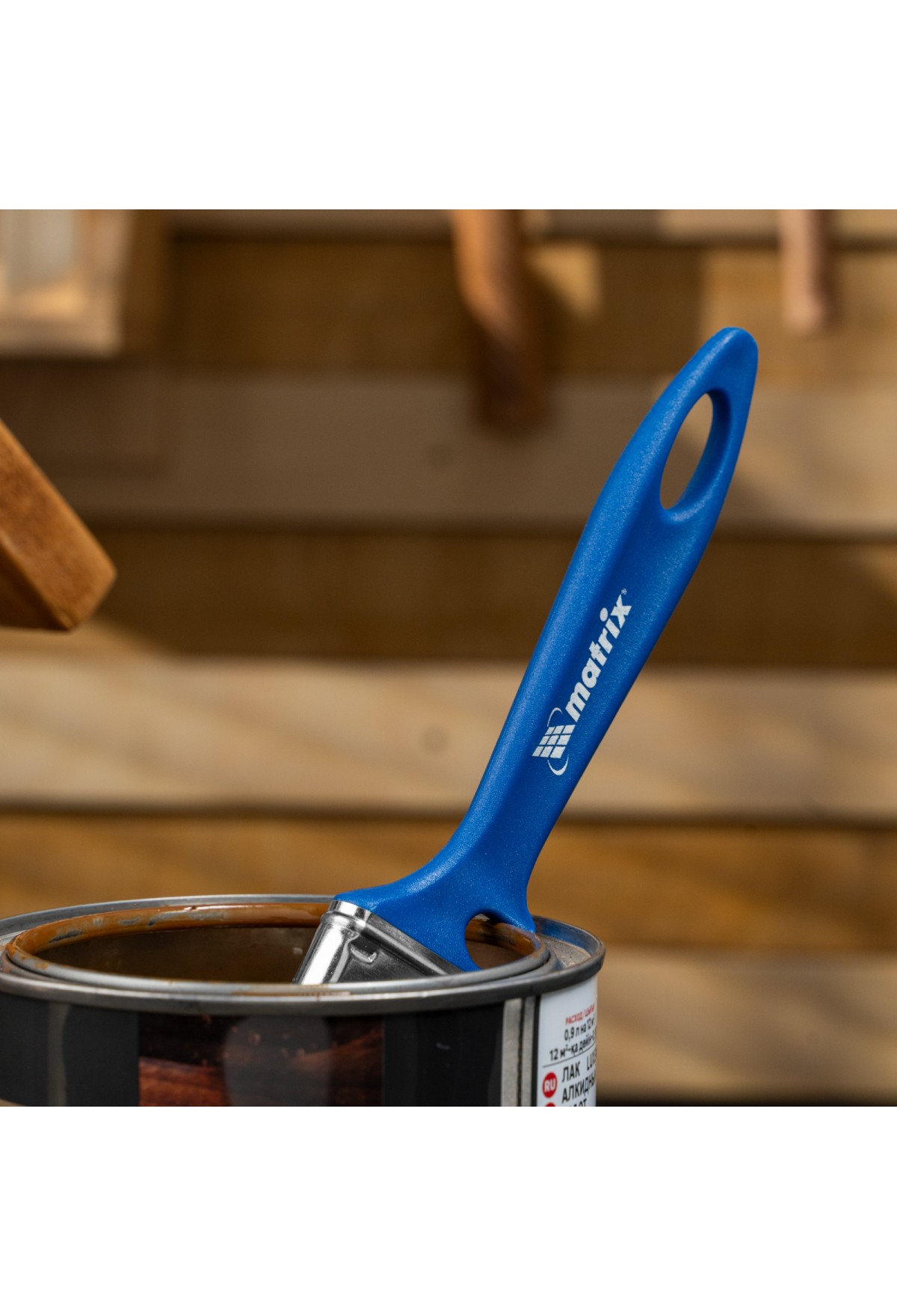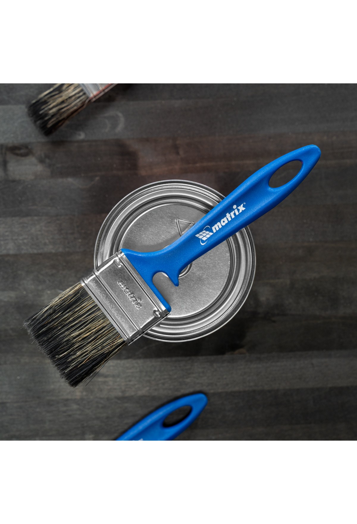 • Удобное хранение — специальная форма рукоятки позволяет закрепить инструмент на краю банки или ведра, а отверстие в верхней части служит для подвешивания кисти.