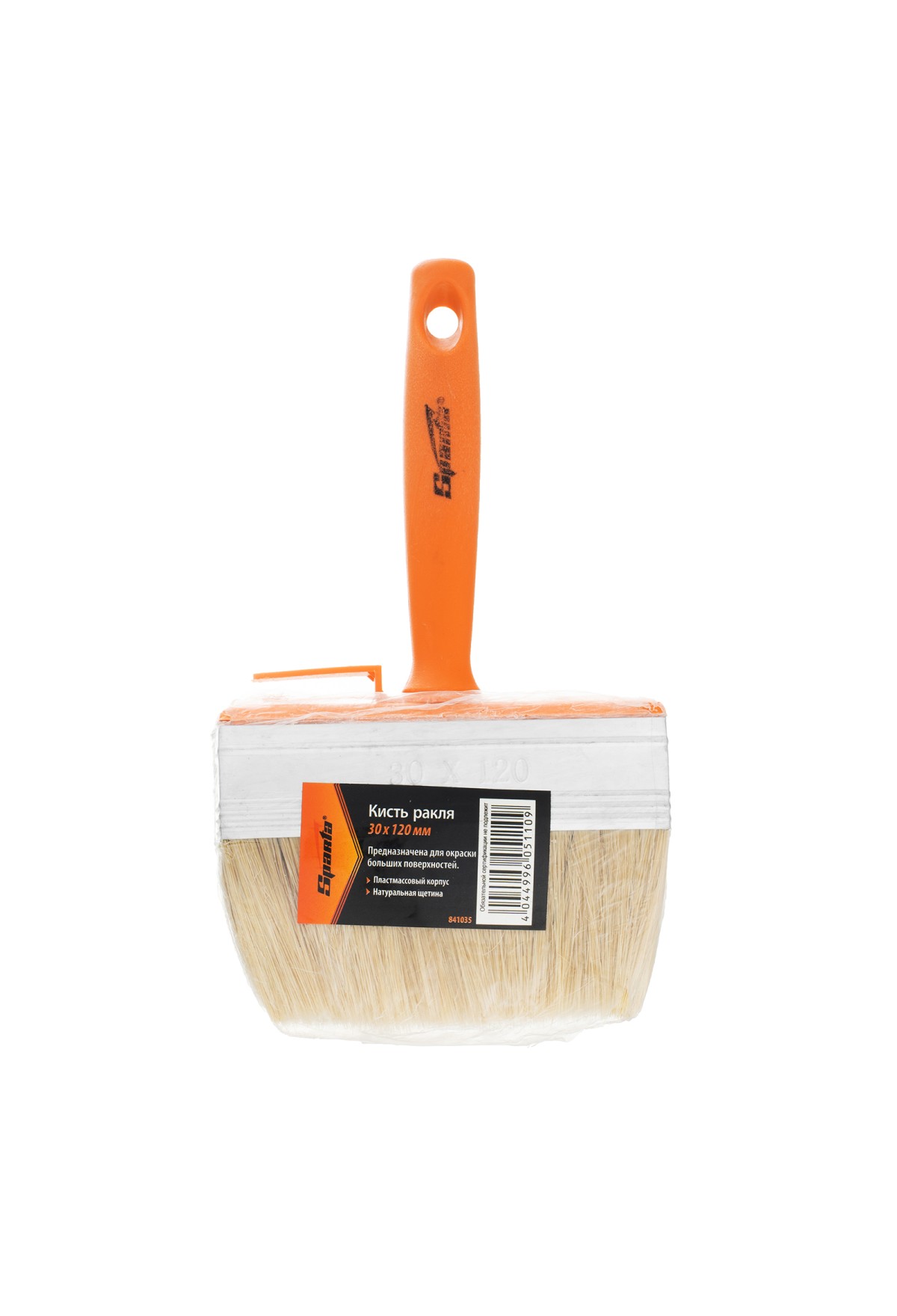 Кисть-ракля Sparta 841035 толщиной 30 мм и шириной 120 мм, с натуральной щетиной, пластмассовыми корпусом и ручкой, используется для малярных работ на участках большой площади, поэтому удобна для обработки стен, потолков и фасадов. Натуральная щетина устойчива к химическому воздействию, поэтому не деформируется и сохраняет упругость при работе с ЛКМ на водной основе, грунтовками, масляными красками и клеящими составами.