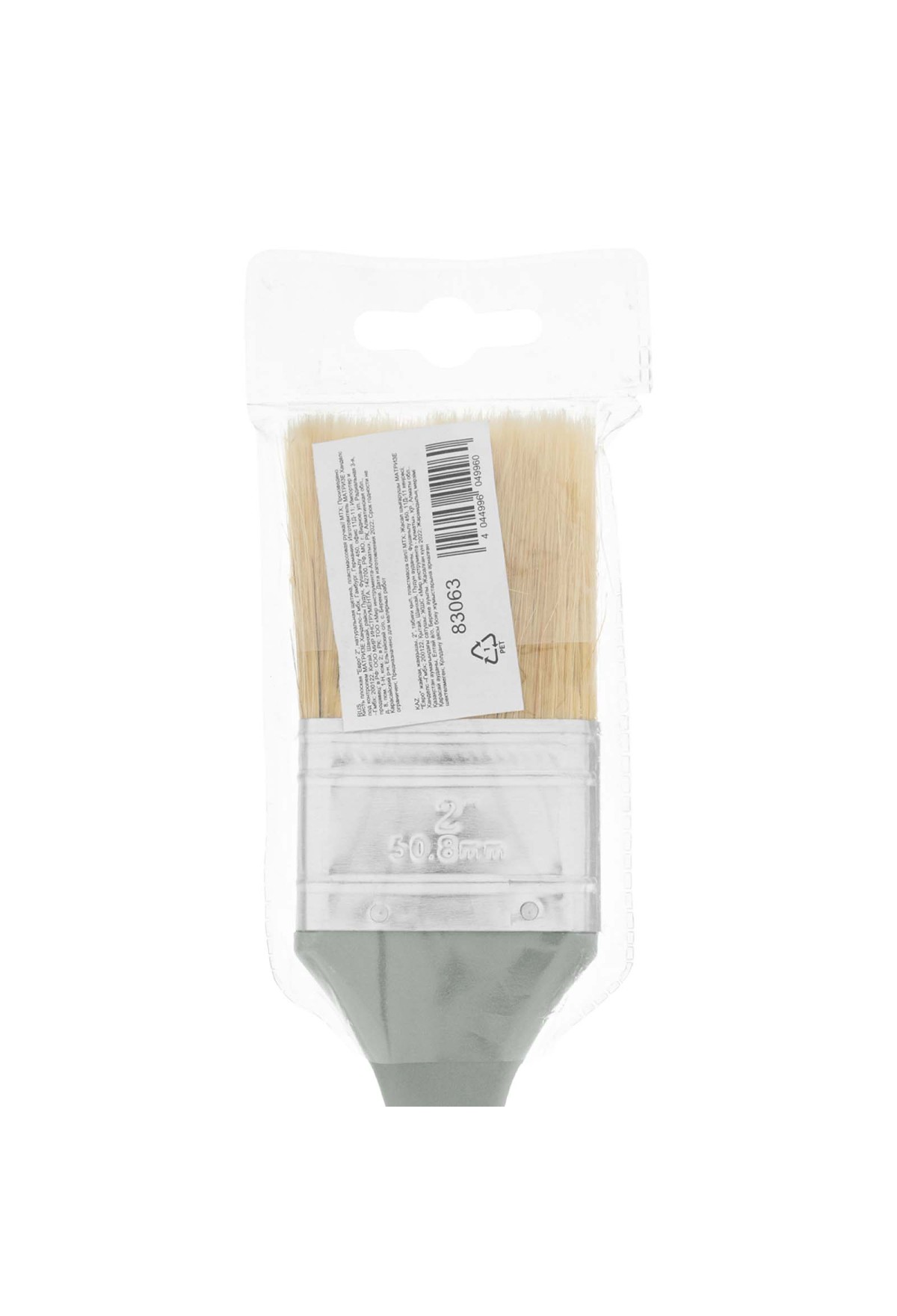 Плоская кисть MTX «Евро» 83063 шириной 2 дюйма, с натуральной щетиной и пластмассовой ручкой, используется для профессионального окрашивания поверхностей. Рекомендуется для нанесения агрессивных ЛКМ с содержанием растворителей.