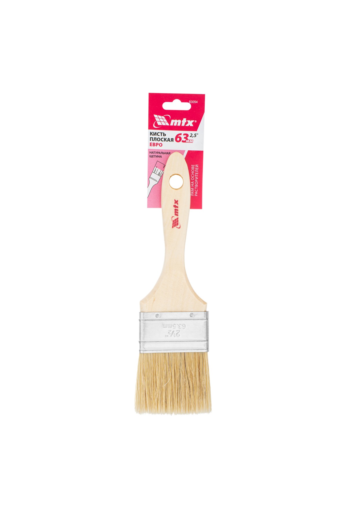 Плоская кисть MTX «Евро» 83054 шириной 2,5 дюйма, с натуральной щетиной и деревянной ручкой, используется для профессионального окрашивания поверхностей. Рекомендуется для нанесения агрессивных ЛКМ с содержанием растворителей.