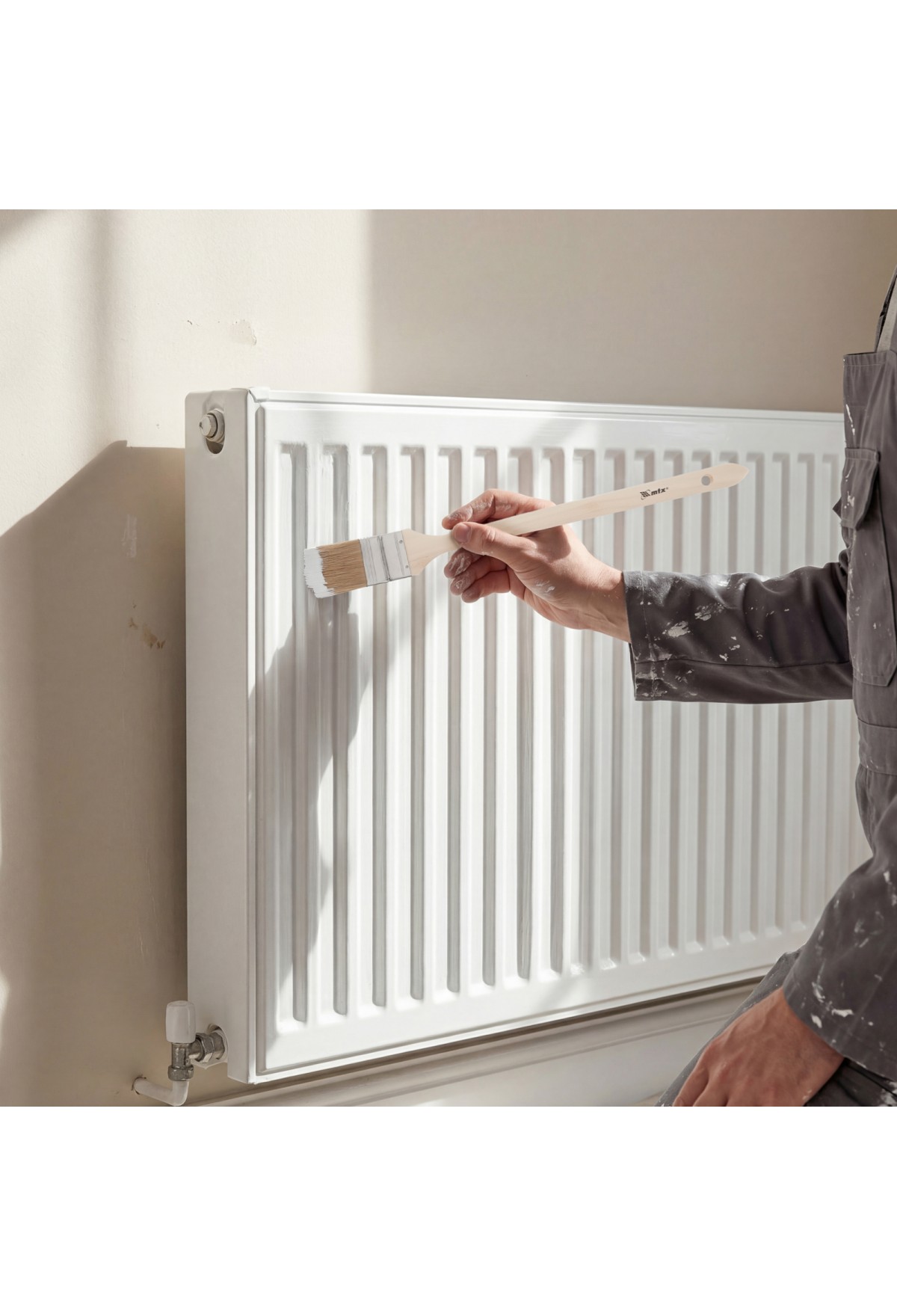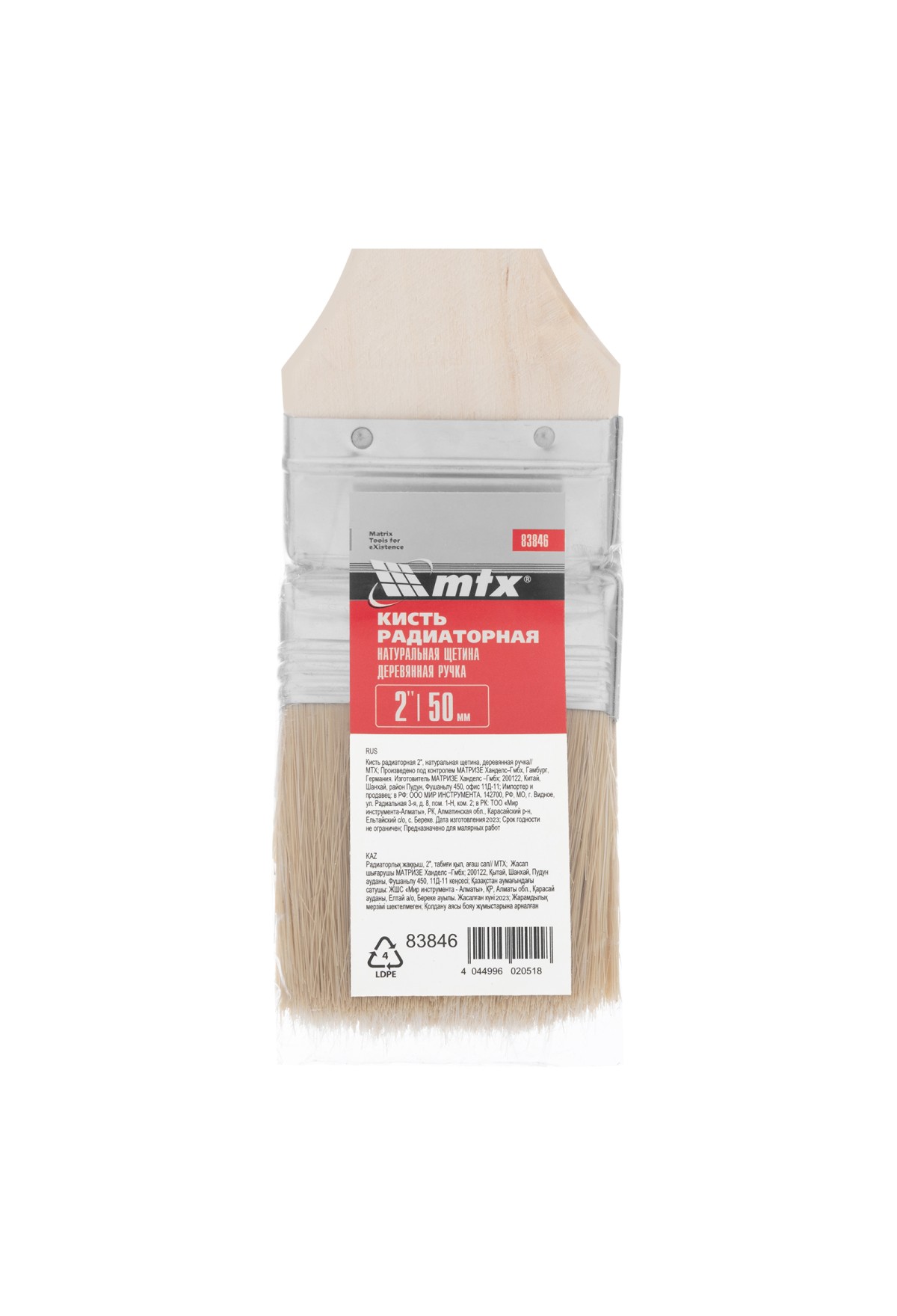 Радиаторная кисть MTX 83846 шириной 2", с натуральной щетиной и деревянной ручкой, используется для окрашивания радиаторов водяного отопления, металлических проволочных конструкций, труб, а также углов и стыков стен. Решение этих задач облегчает удлиненная ручка изогнутой формы. Натуральная щетина устойчива к агрессивным средам, поэтому кисть может применяться с эмалями и масляными красками.