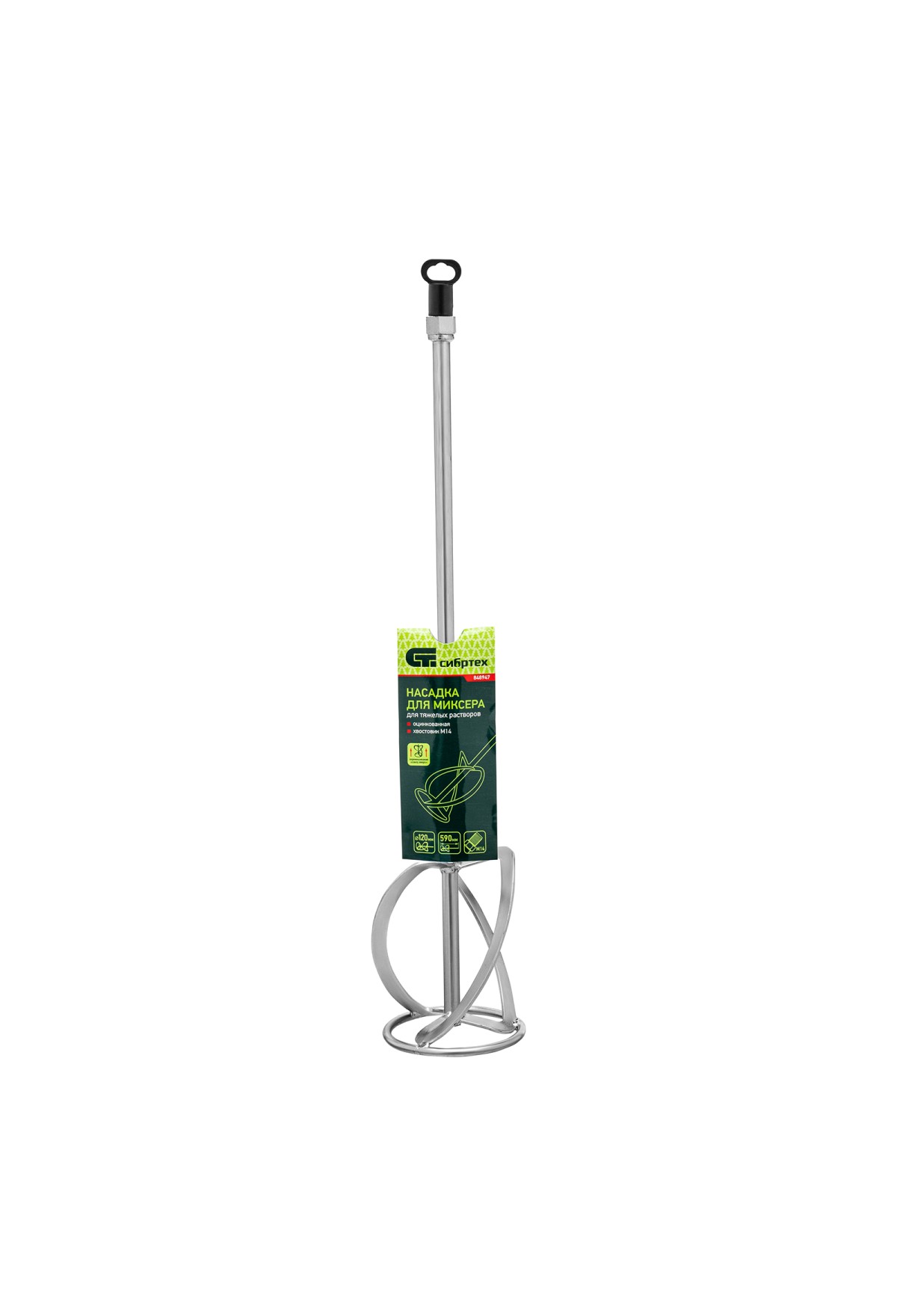 Оцинкованная насадка для миксера Сибртех 848947 размером 120 х 590 мм, с хвостовиком М14, используется для приготовления штукатурных, цементных смесей, шпатлевок и других тяжелых растворов. Перемешивает состав снизу вверх, не давая тяжелым частицам оседать на дне, при этом нагрузка на инструмент минимальна. Насадка устанавливается на профессиональный электроинструмент с соответствующей присоединительной резьбой и используется на строительной площадке.